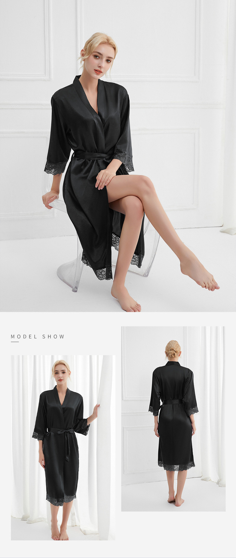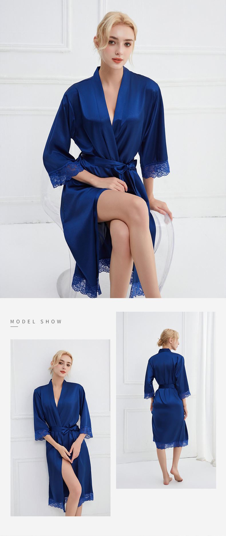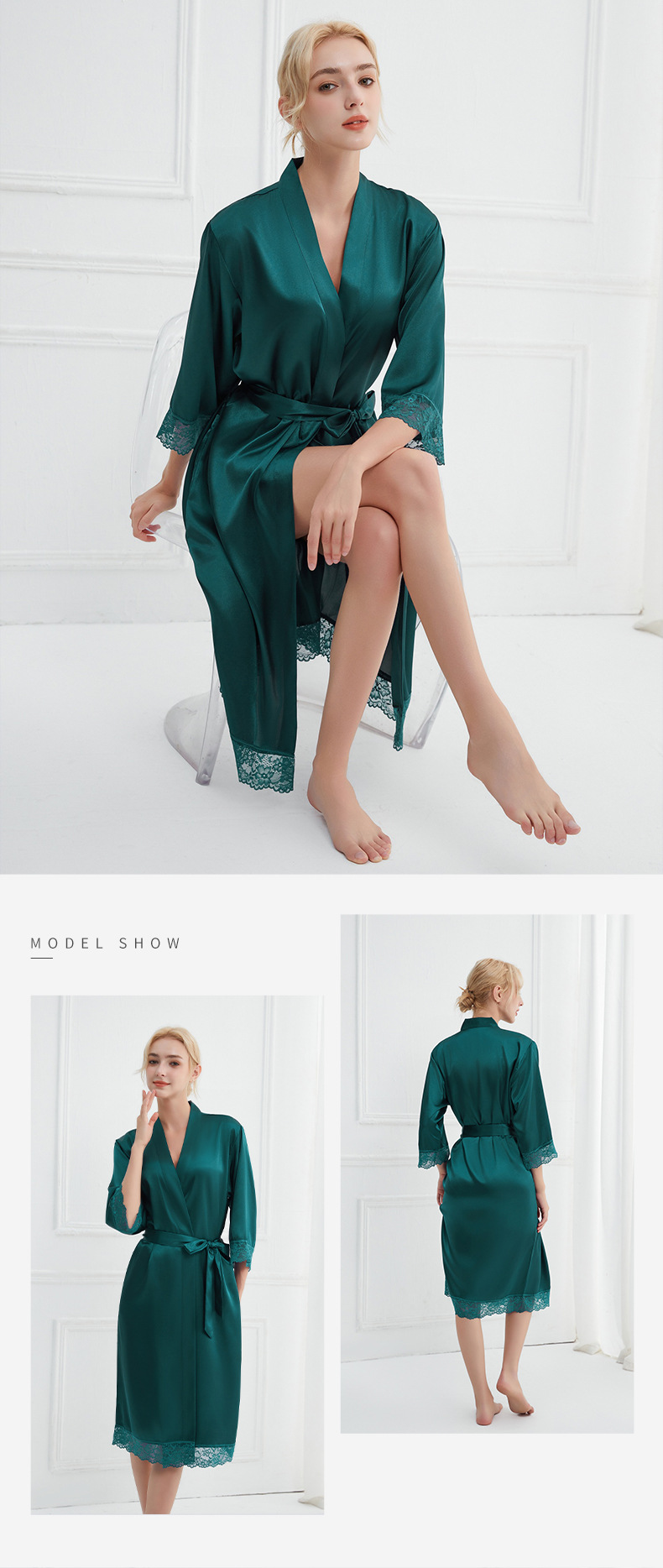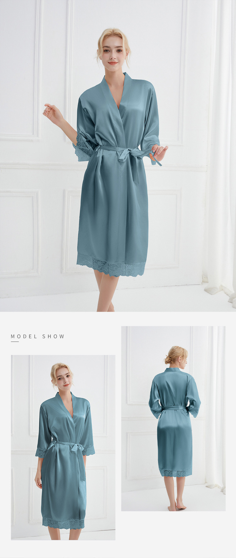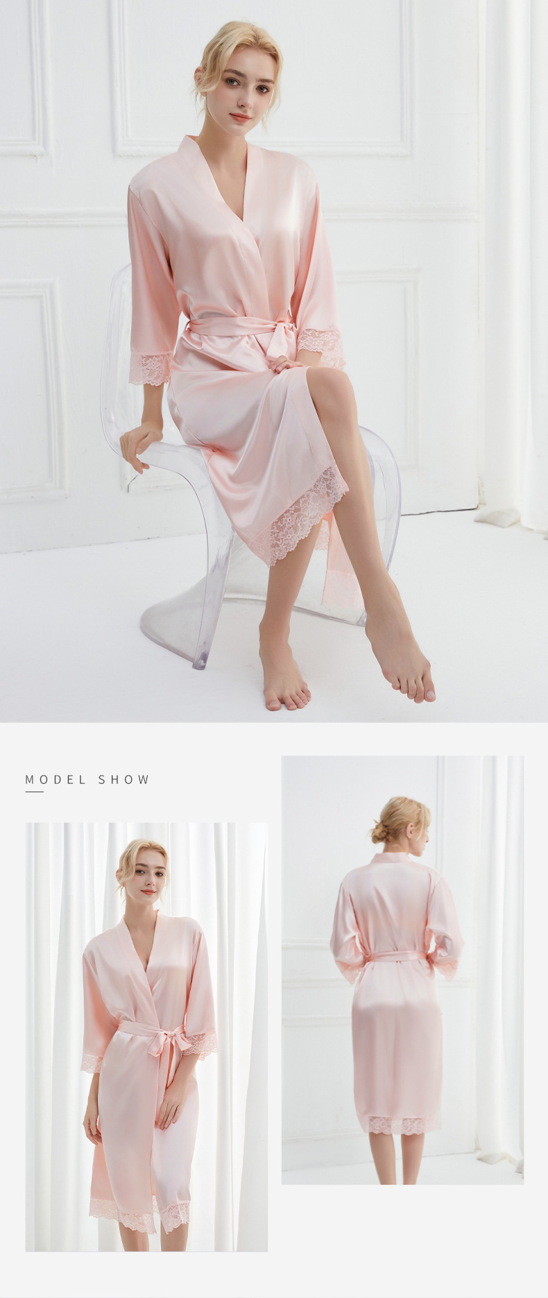 봄과 가을 실크 솔리드 컬러 나이트 가운 섹시한 V 넥 레이스 나이트 가운 여성 9 점 슬리브 레이스 프렌치 스타일 홈 로브스토어 가기