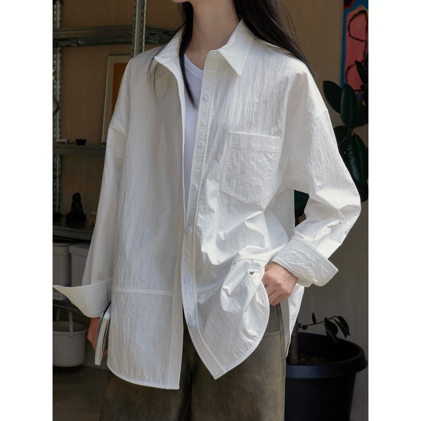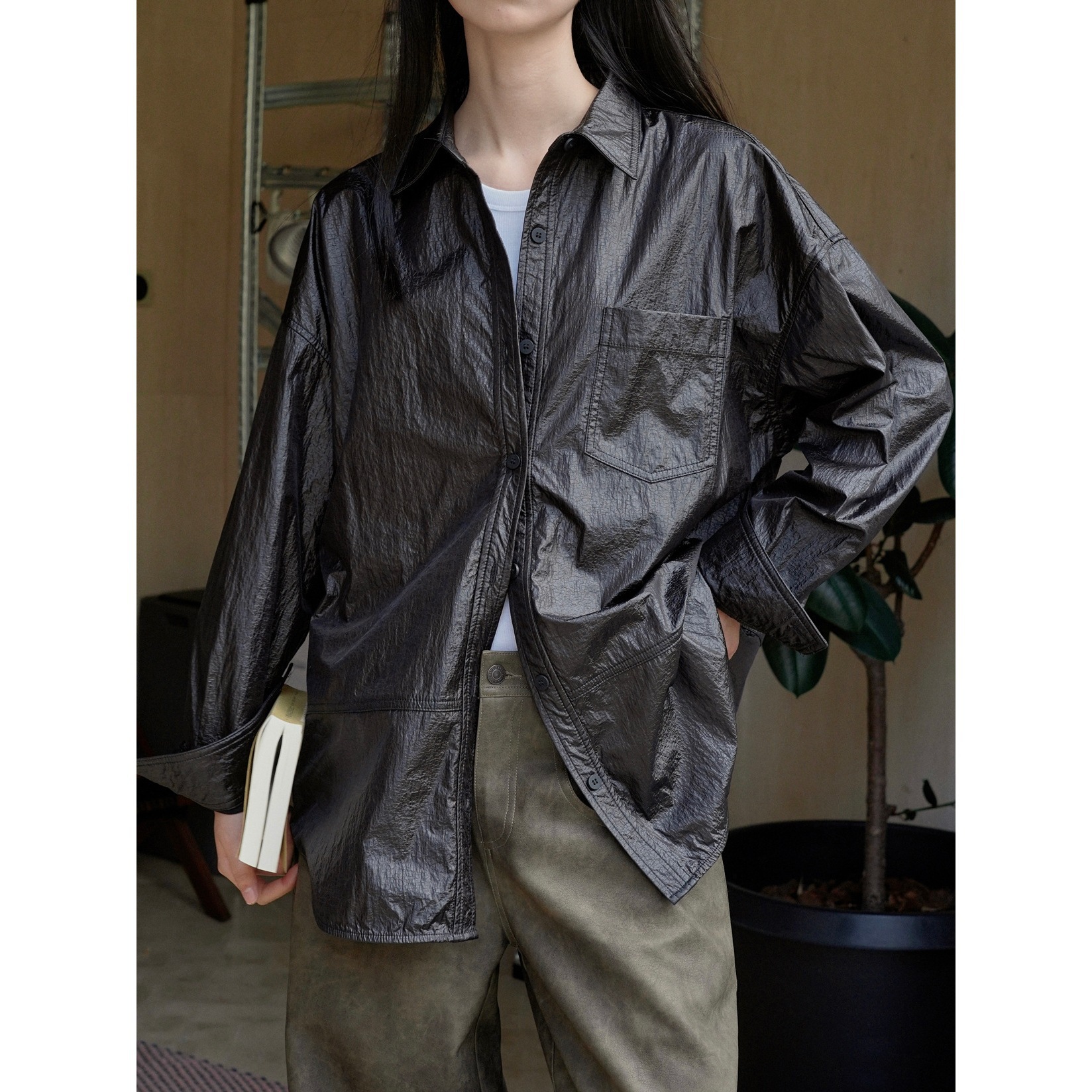 Xuman 가을 새로운 한국 스타일 세련된 캐주얼 광택 질감 옷깃 셔츠 여성용 느슨한 실루엣 긴팔 셔츠
