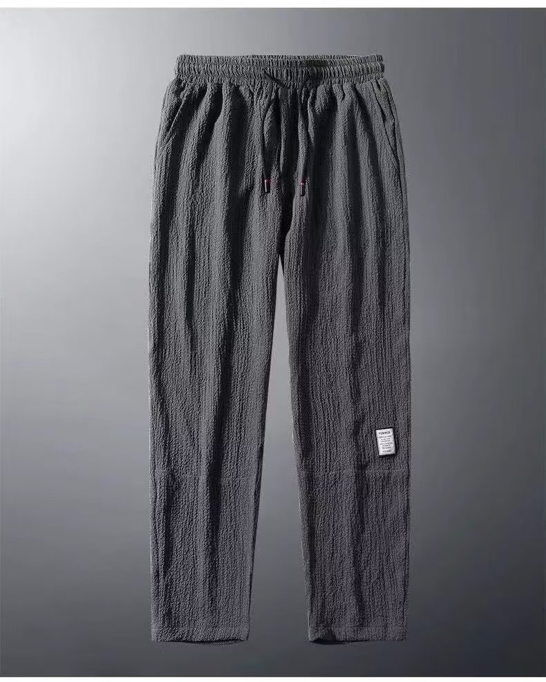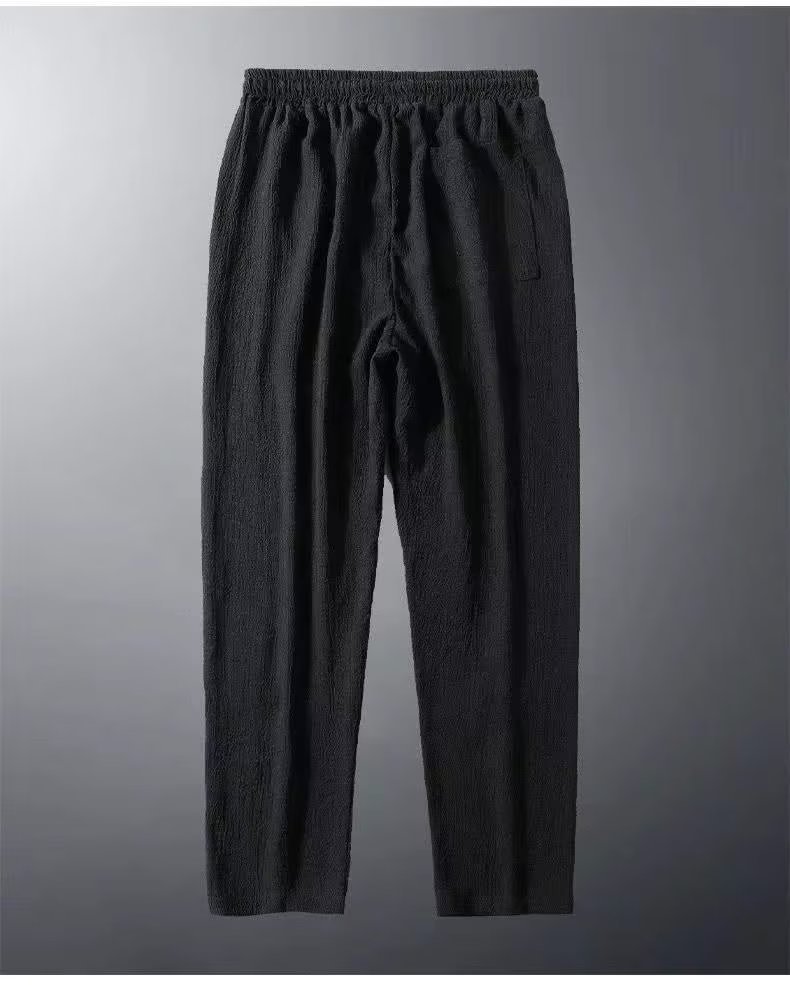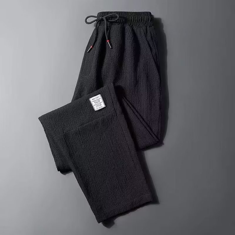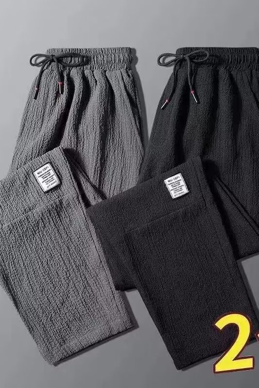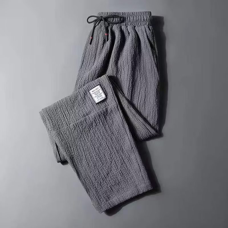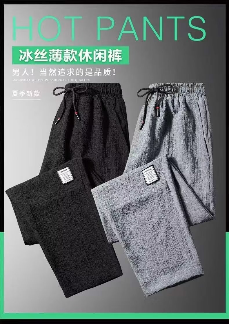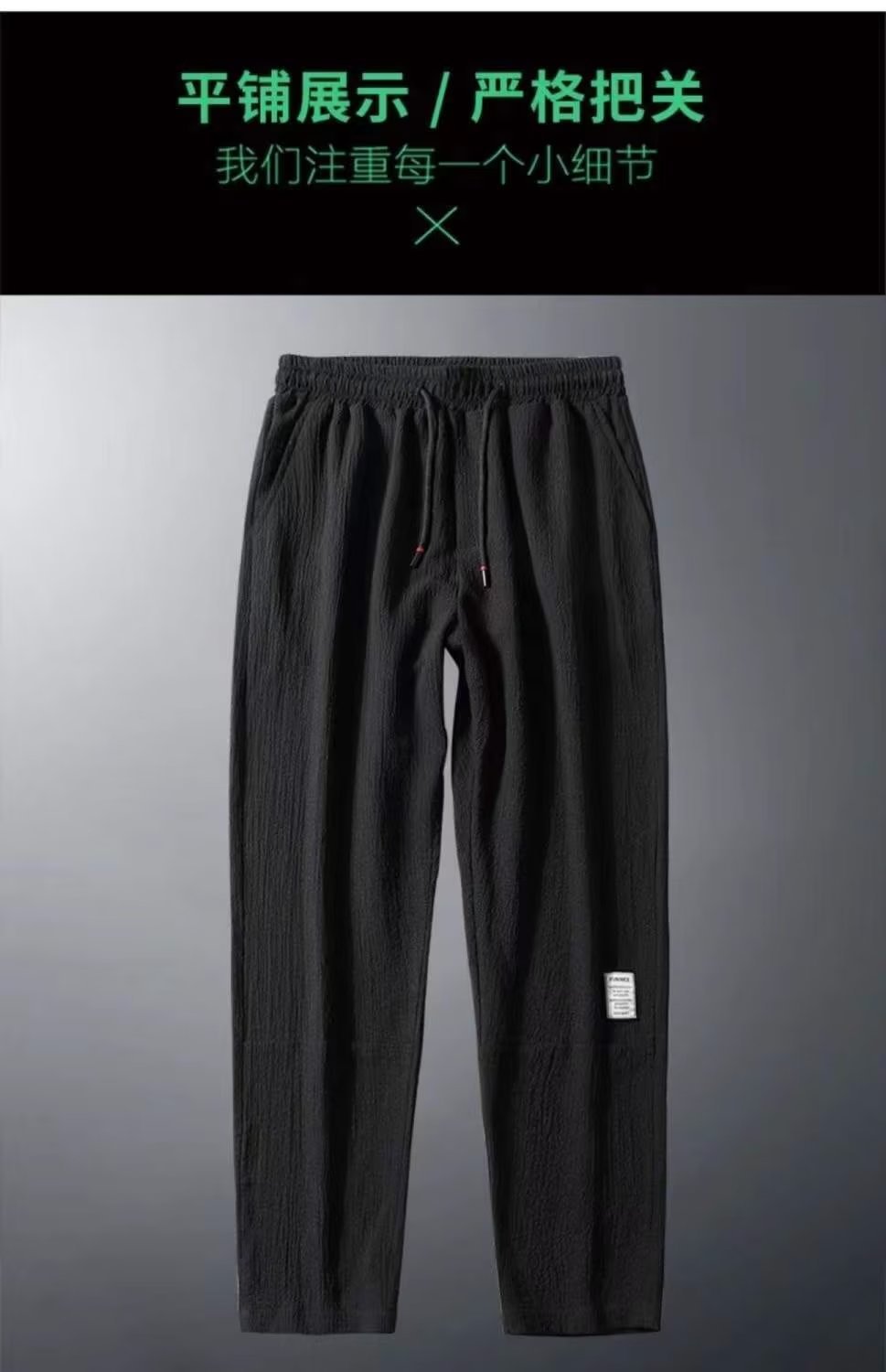 여름 아이스 실크 뉴 리넨 얇은 캐주얼 바지 남자 스트레이트 라벨 한국 스타일 느슨한 플러스 사이즈 스포츠 발목 길이 바지스토어 가기