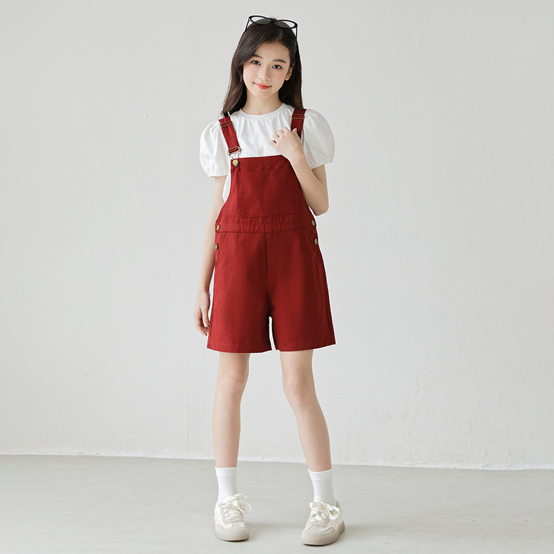 소녀 멜빵 레드 여름 캐주얼 중형 어린이 멜빵 반바지 세련된 멋진 어린이 바지 학생 장난기 넘치는 퍼포먼스 바지스토어 가기