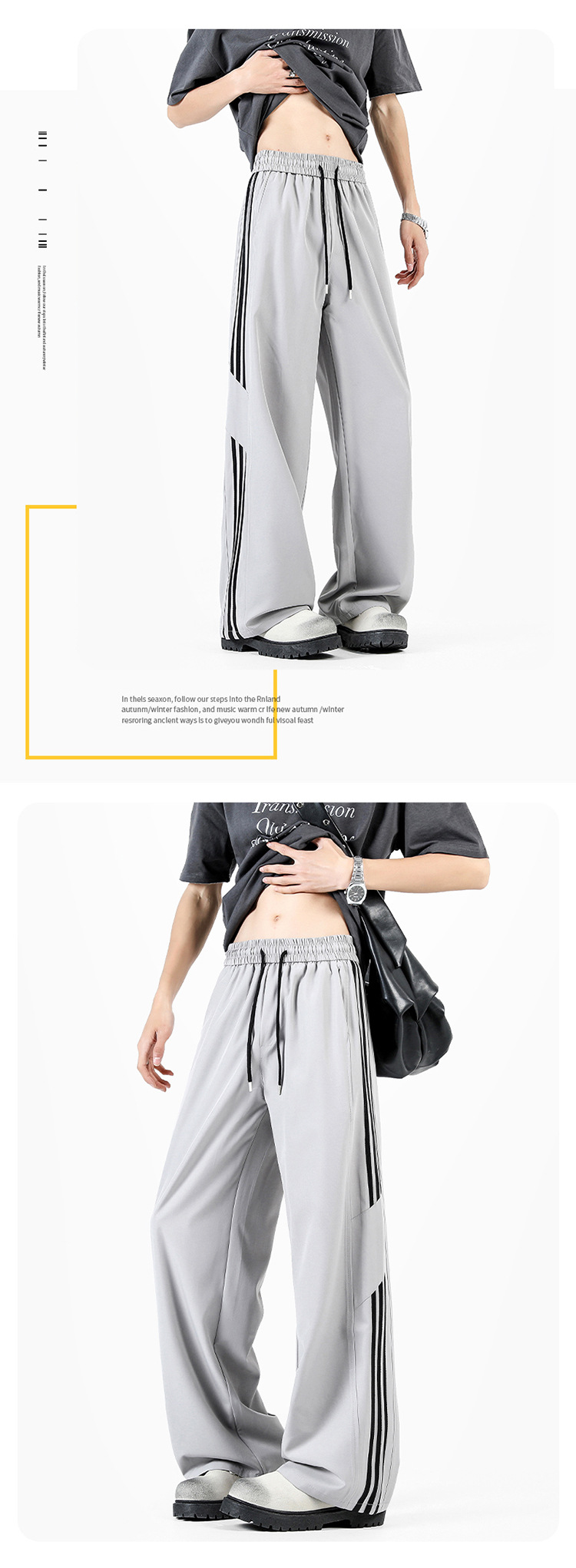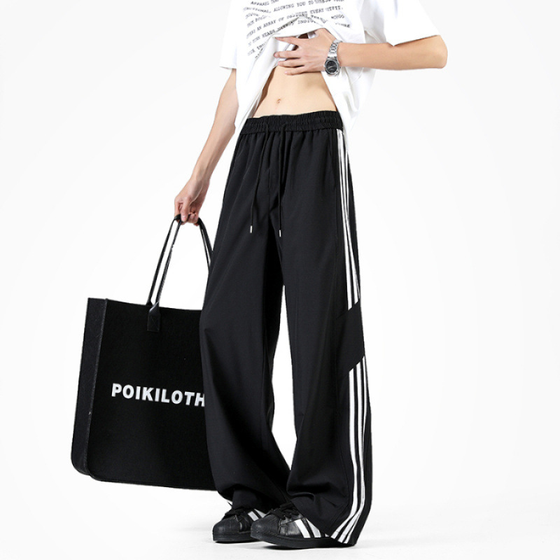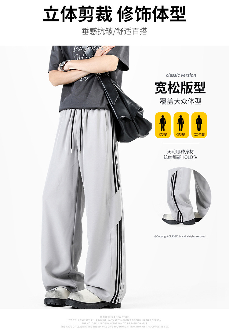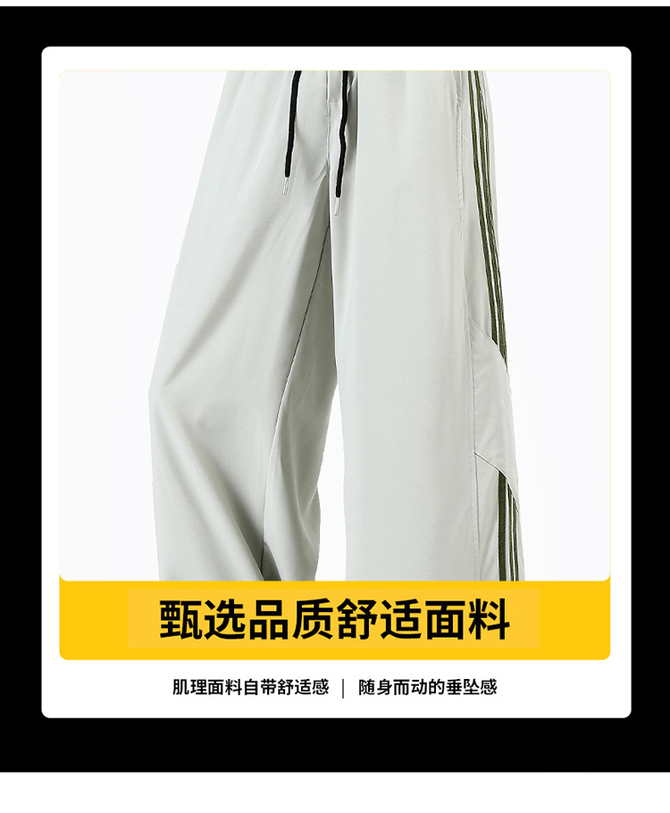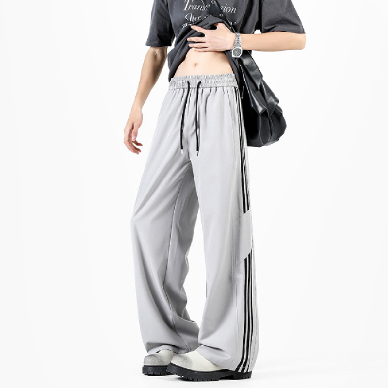 2025 여름 아이스 실크 스트라이프 스플 라이스 바시 바지 남성 트렌디 아메리칸 스타일 방수 캐주얼 바지 루즈 스트레이트 바지스토어 가기