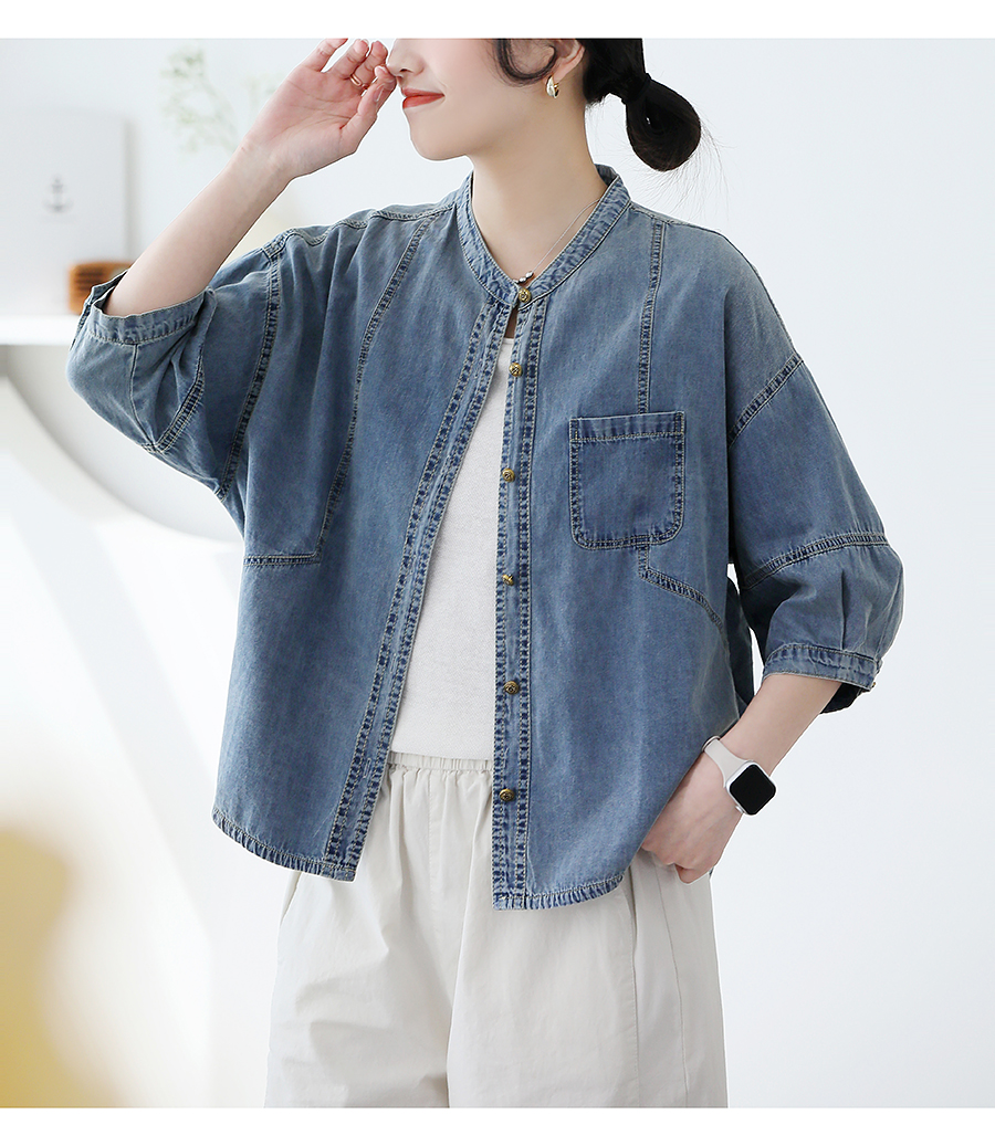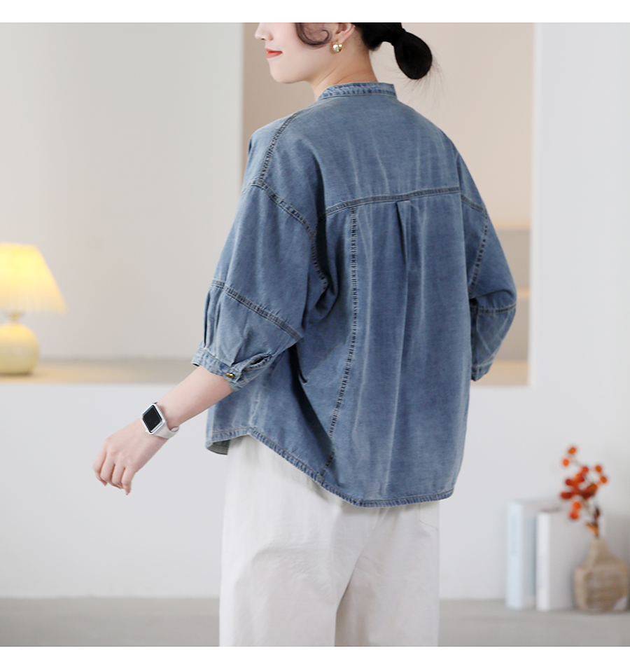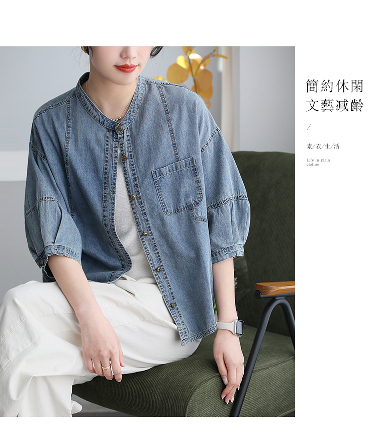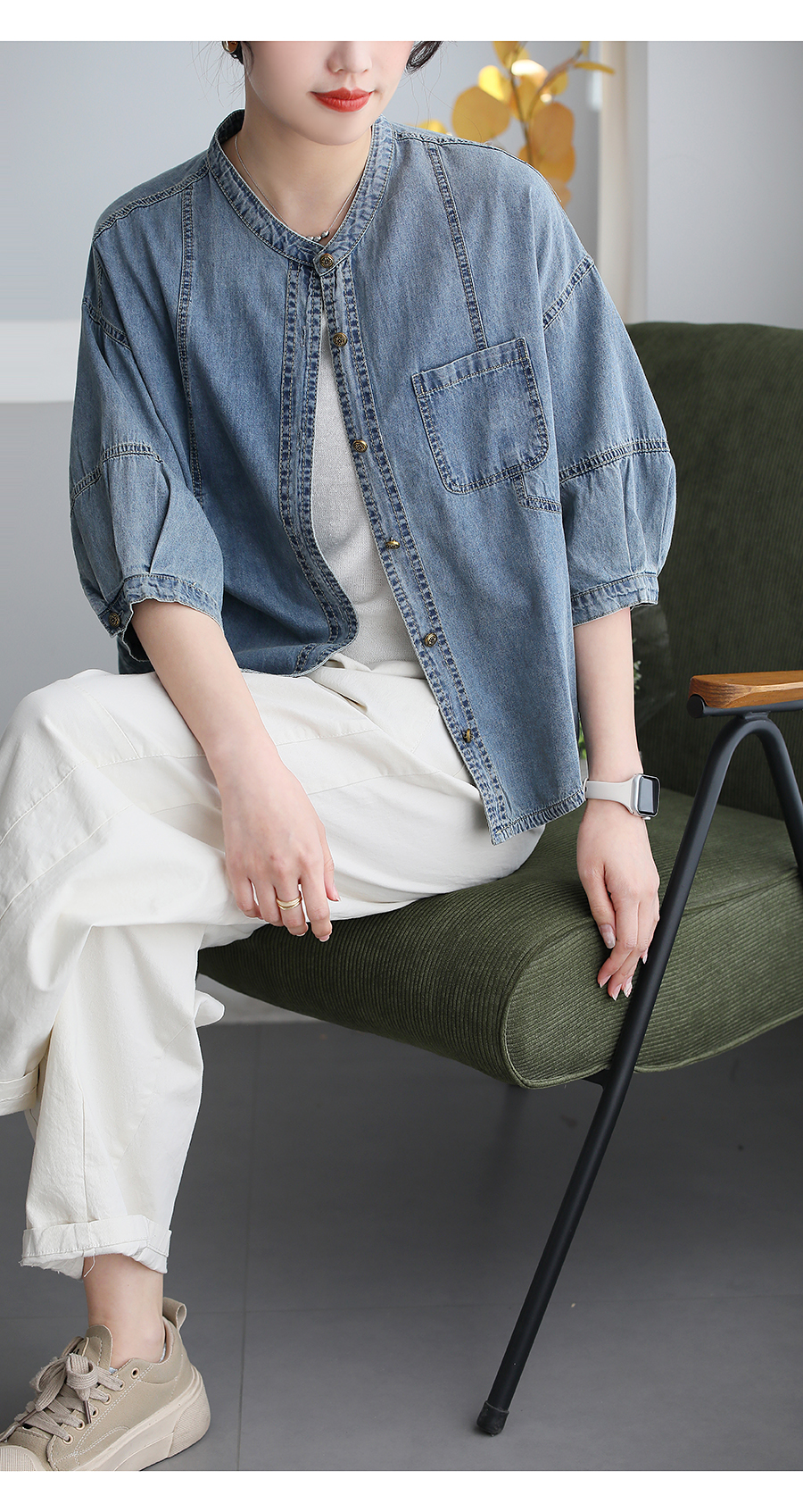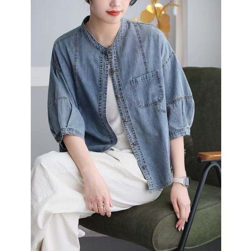 여름 새 반팔 데님 셔츠 여성용 라운드 넥 캐주얼 느슨한 슬리밍 한국식 세븐 포인트 슬리브 85038