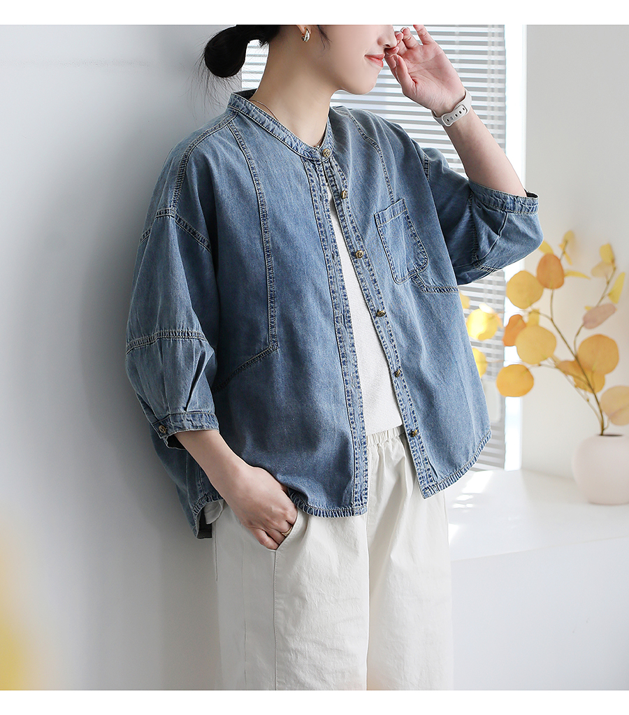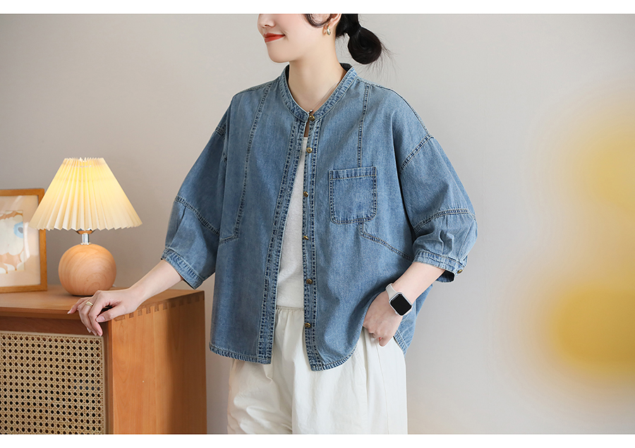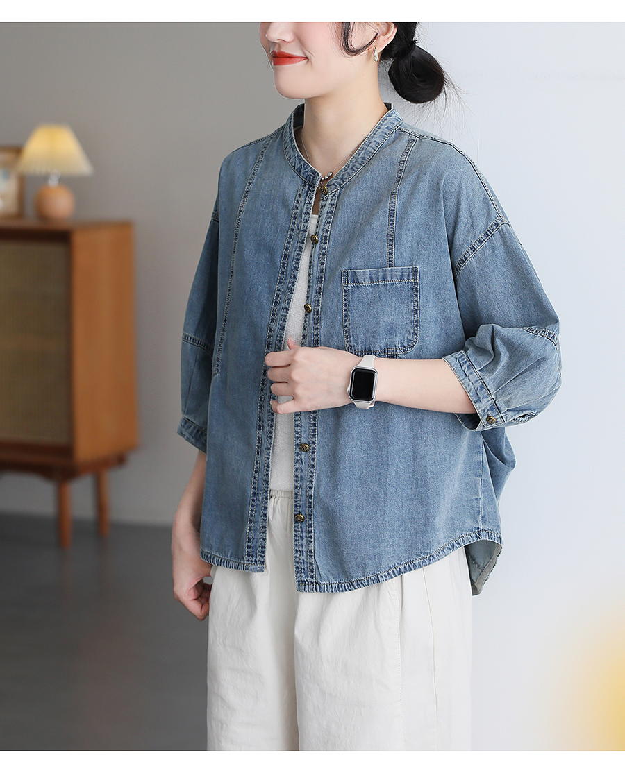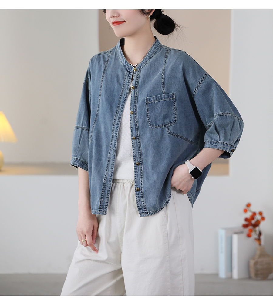 여름 새 반팔 데님 셔츠 여성용 라운드 넥 캐주얼 느슨한 슬리밍 한국식 세븐 포인트 슬리브 85038