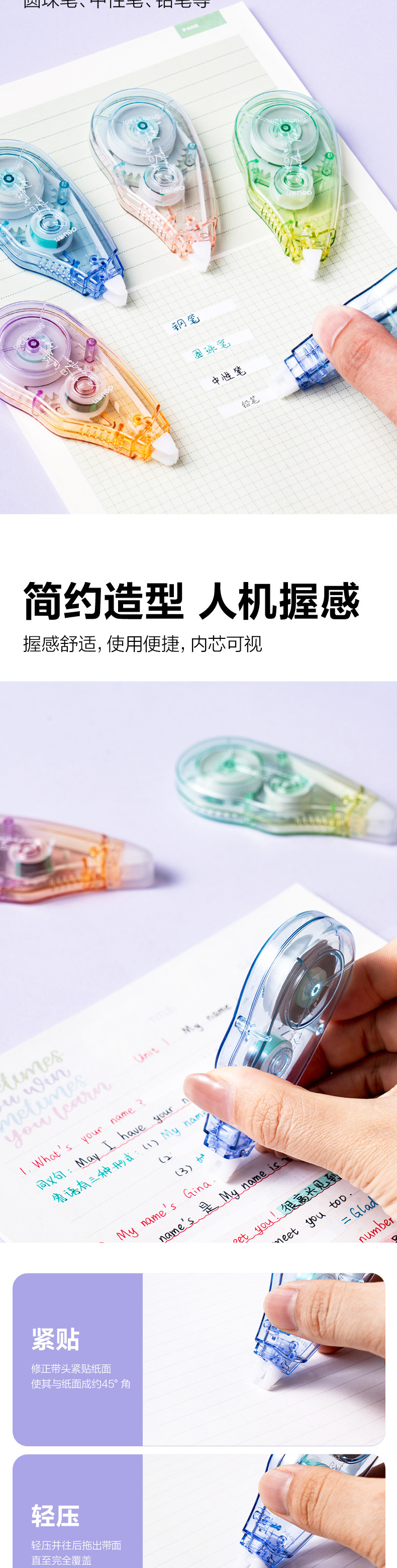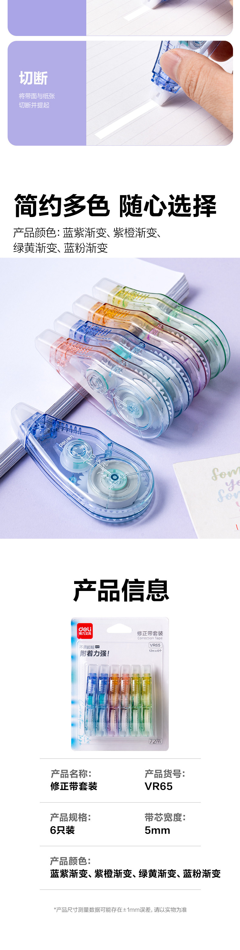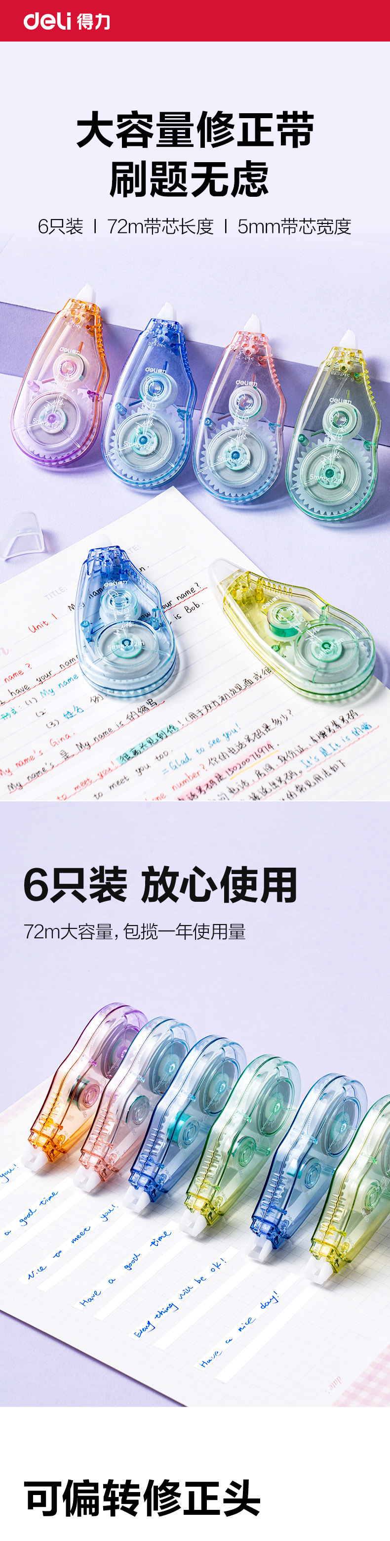 학생들을 위한 델리 VR65 수정테이프, 저렴하고 부드럽고 가벼운 대용량 수정테이프, 컬러 수정테이프 72m