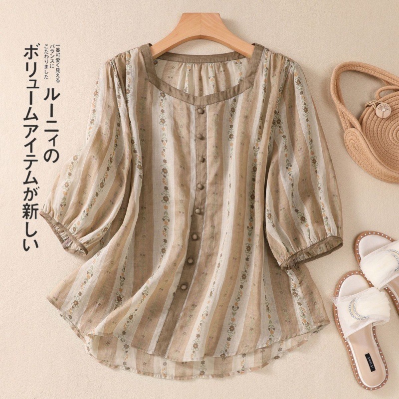 七分袖衬衫女夏季新款宽松休闲印花方领女装上衣苎麻大码衬衣潮