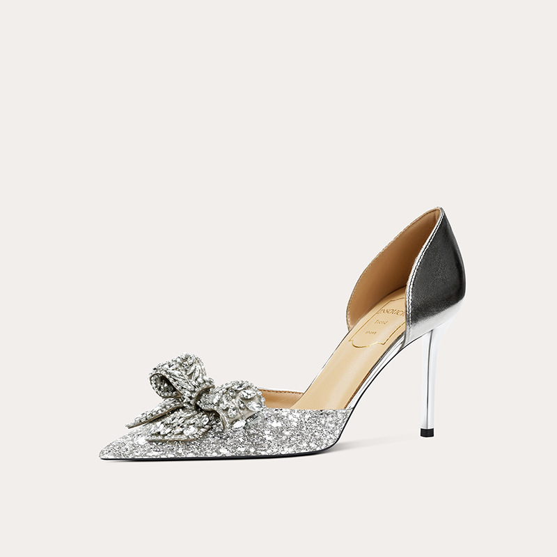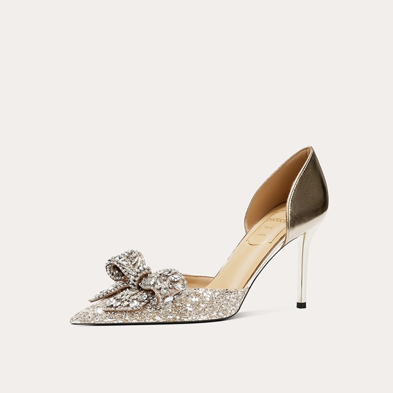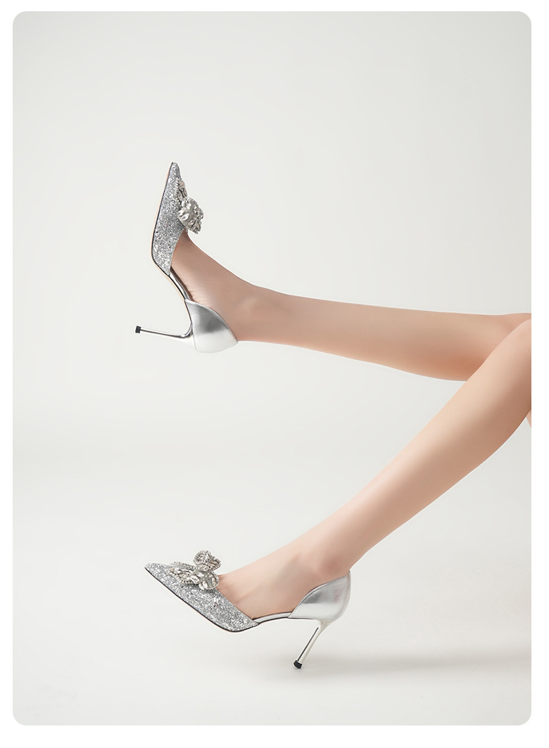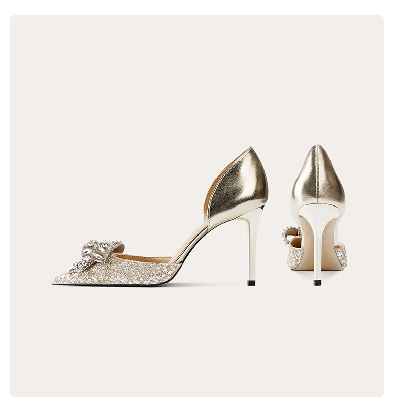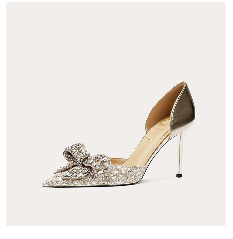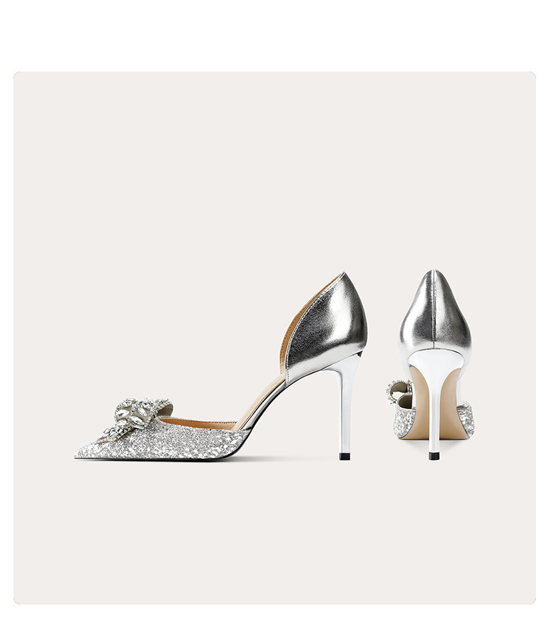 708-K65 여성용 중공 하이힐 2025 새로운 스타일의 얇은 굽과 얕은 입 모양의 라인스톤 보우 여성용 프렌치 슈즈스토어 가기