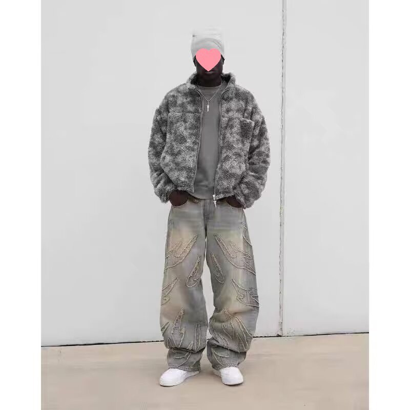 미국식 하라주쿠 빈티지 박쥐 패턴 자수 루즈 청바지 남성 스트리트 패션 바지 게으른 청바지