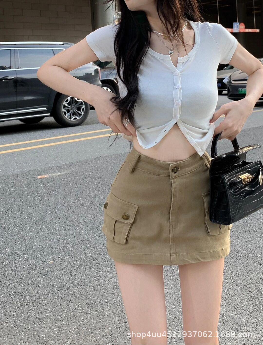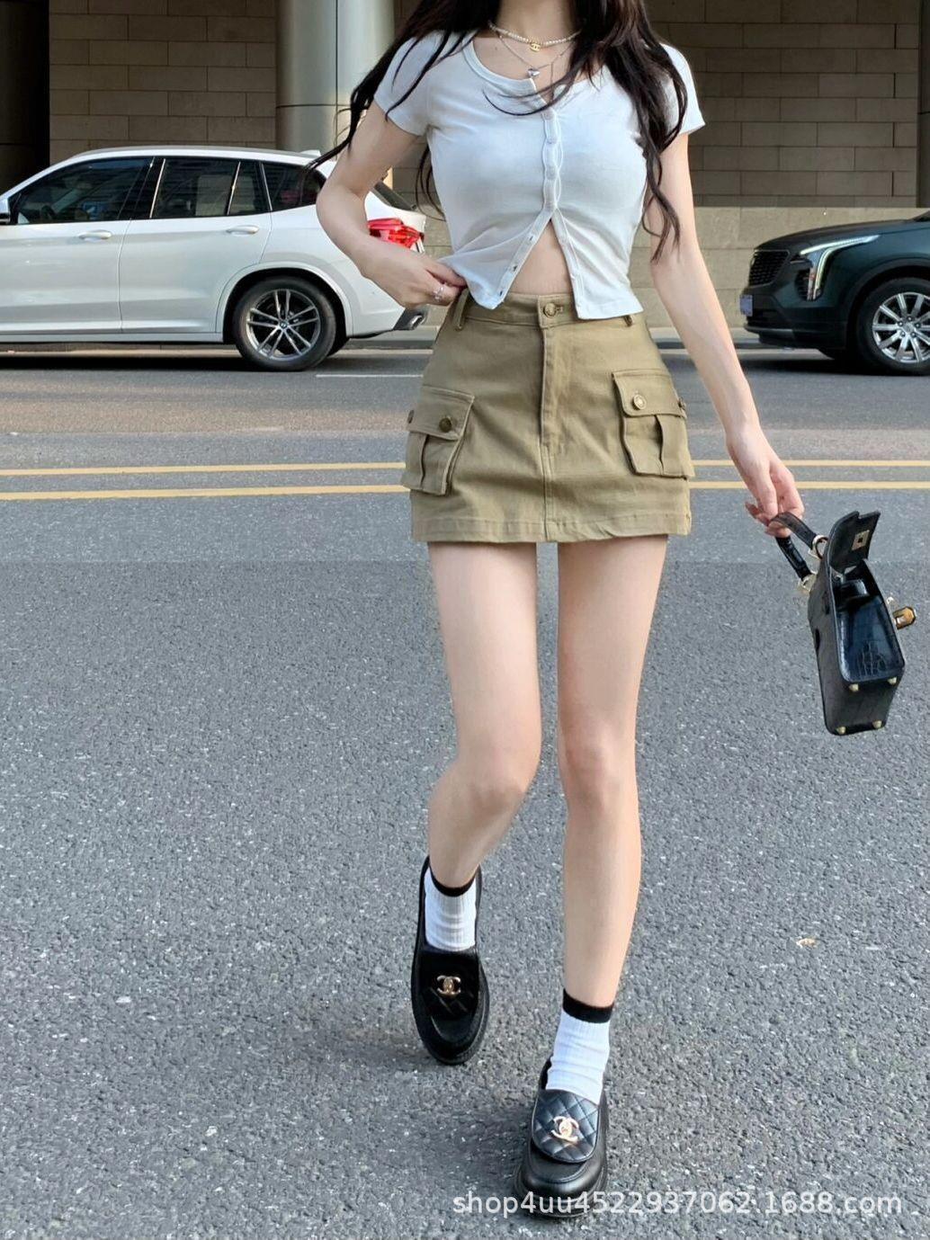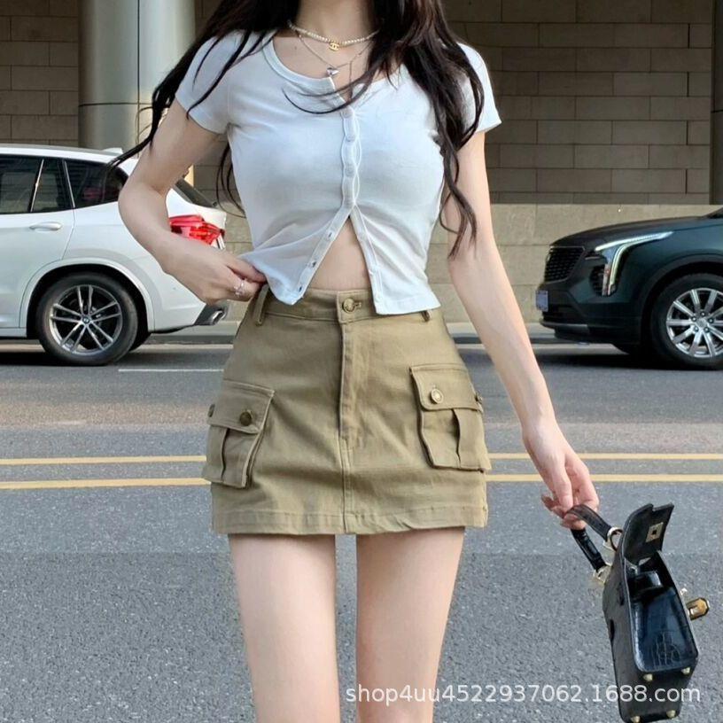 핫 소녀 카키색 작업복 스커트 여성 여름 2024 새로운 복고풍 하이 웨이스트 미니 스커트 A 라인 힙 스커트