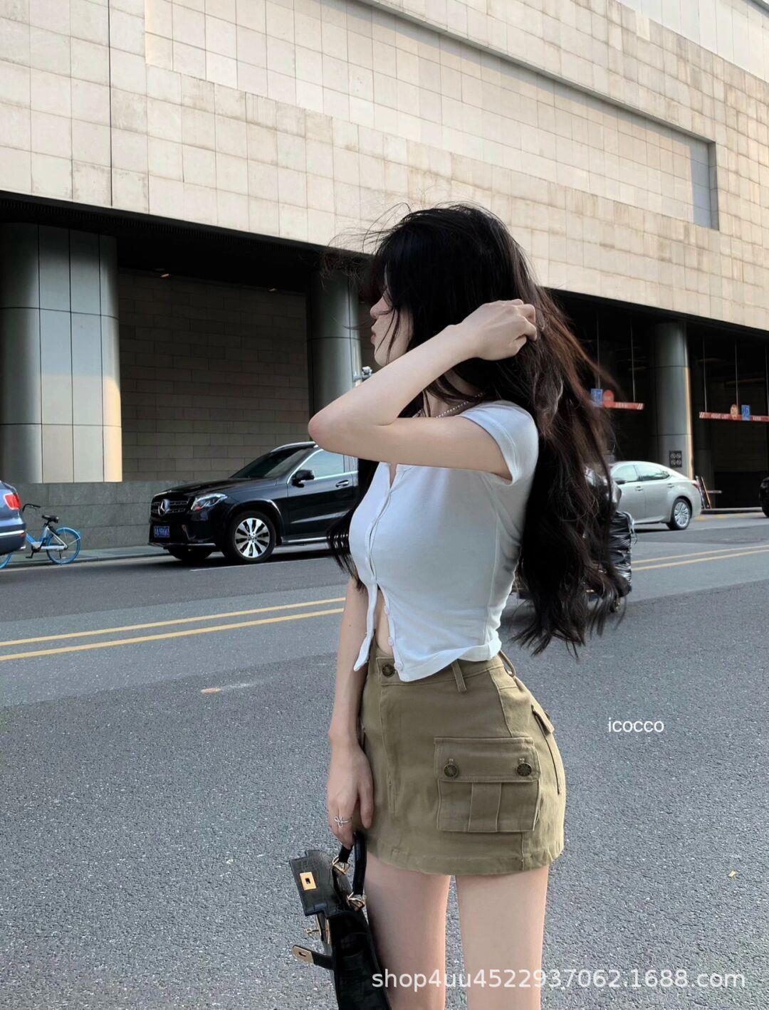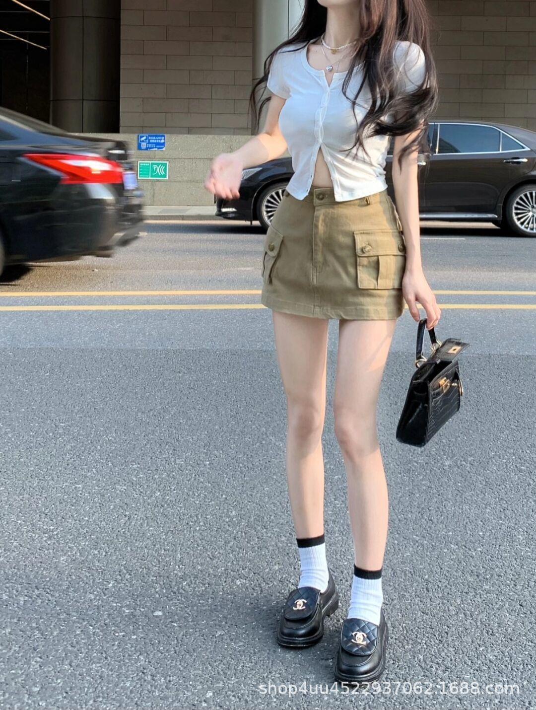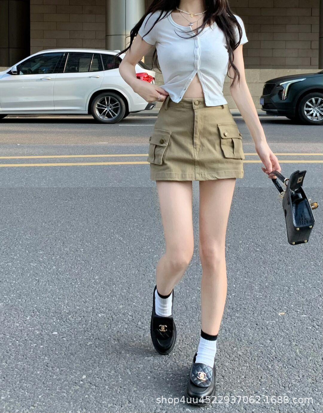 핫 소녀 카키색 작업복 스커트 여성 여름 2024 새로운 복고풍 하이 웨이스트 미니 스커트 A 라인 힙 스커트