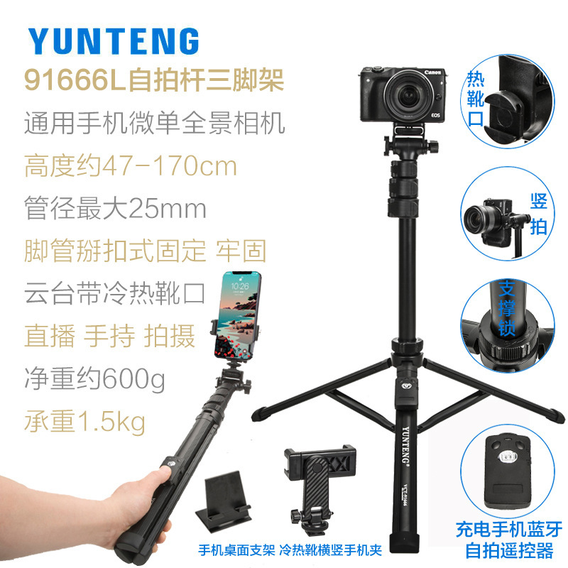 Yunteng 91666L 미러리스 카메라 삼각대 1.7m 높은 휴대용 핫 및 콜드 부츠 셀카 스틱 사진 라이브 방송스토어 가기