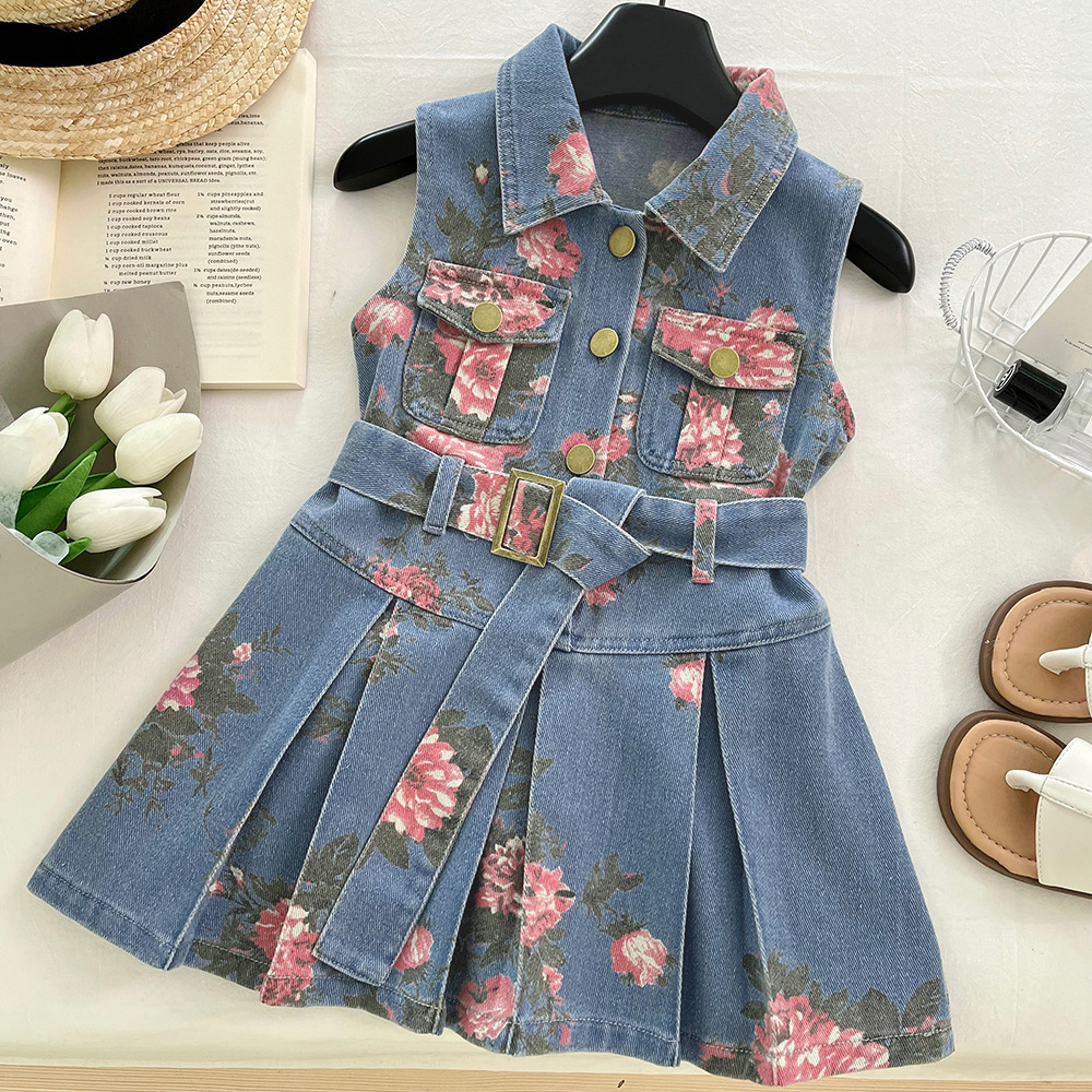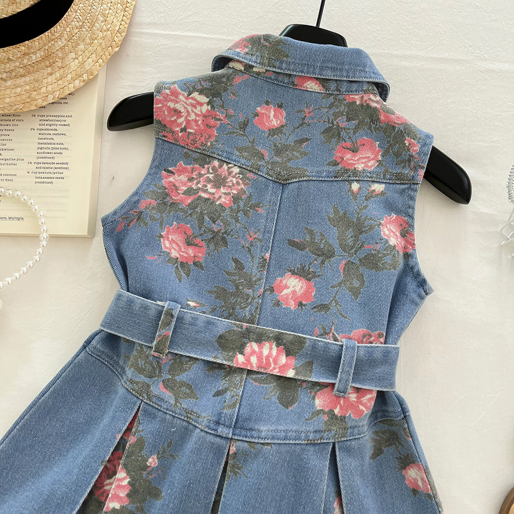 여자 민소매 데님 원피스 2025 여름 꽃 인쇄 데님 치마 단단한 허리 옷깃 얇은 조끼 스커트 트렌디스토어 가기