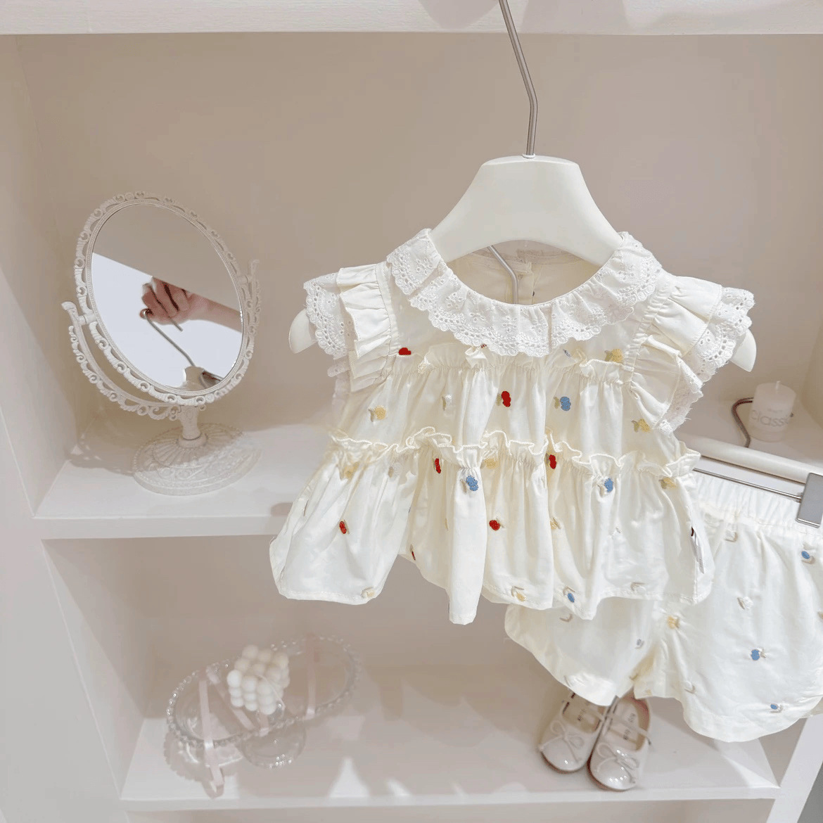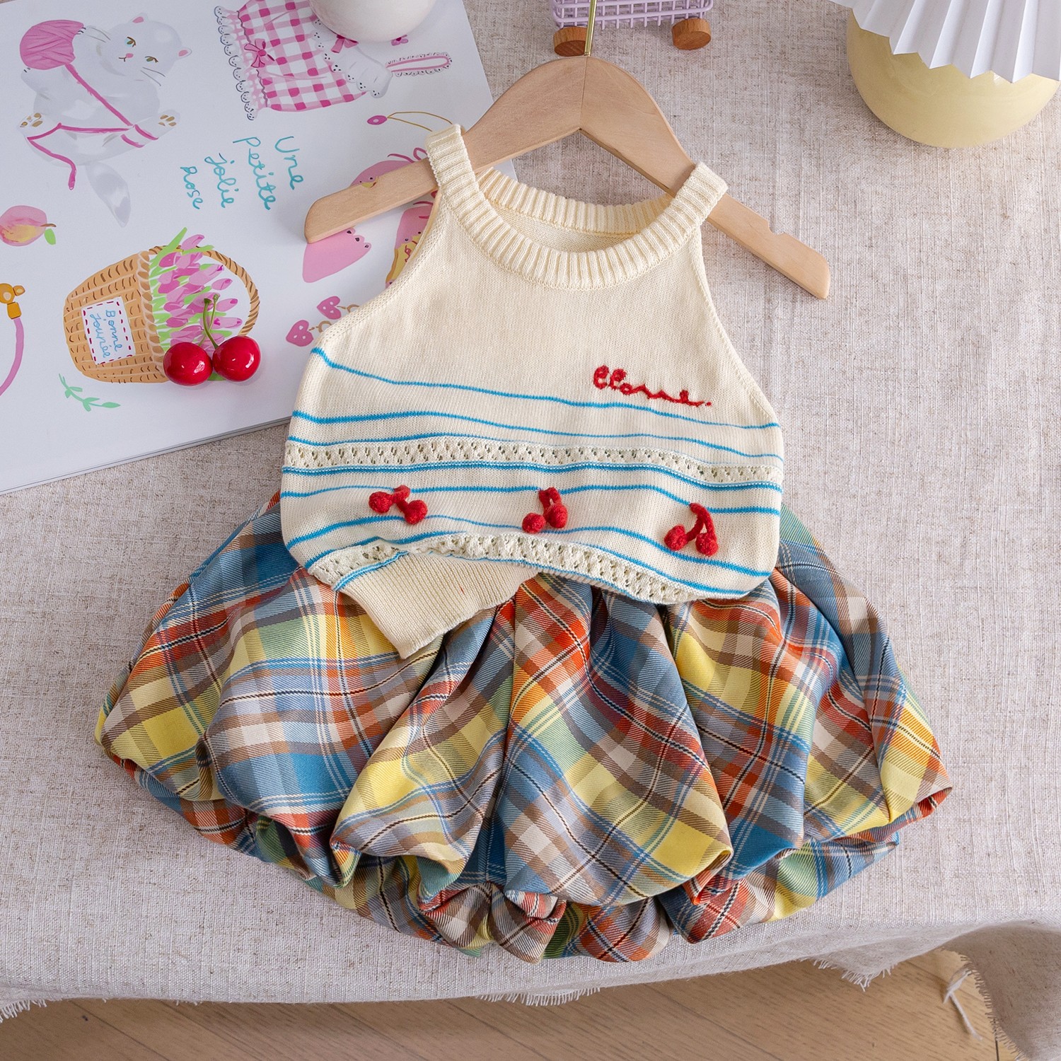 소녀 여름 세트 2025 새로운 스타일 어린이 귀여운 만화 인쇄 반팔 티셔츠 체크 무늬 꽃 버드 스커트