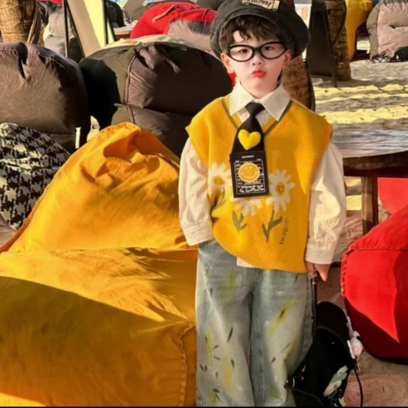 아동 2025 정장 봄, 가을 새 셔츠 소년 조끼 낙서 한국 스타일 청바지 3 피스 세트 한국 스타일 아동 의류스토어 가기