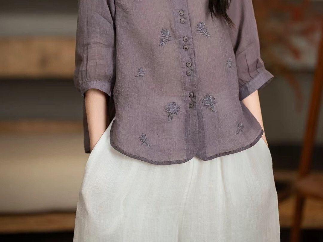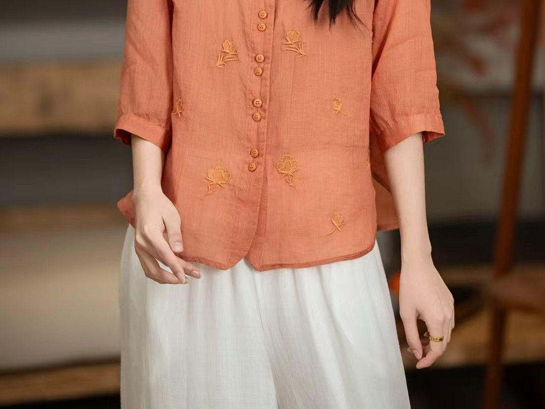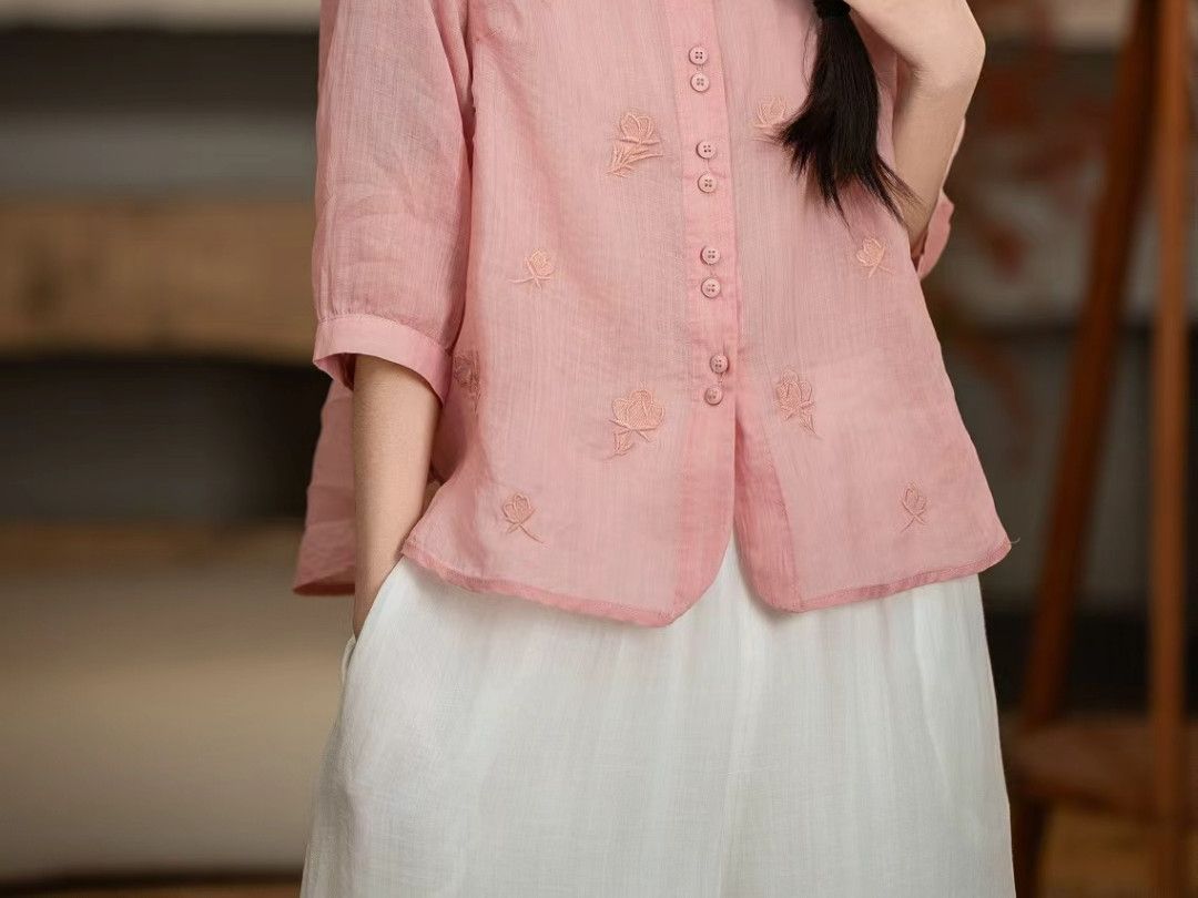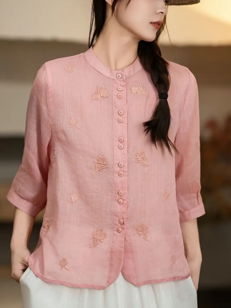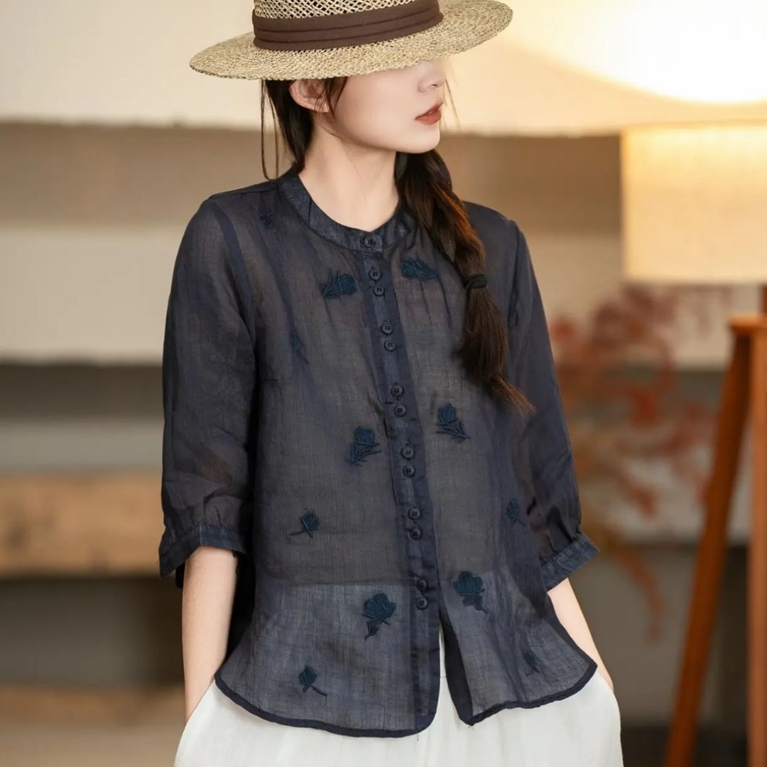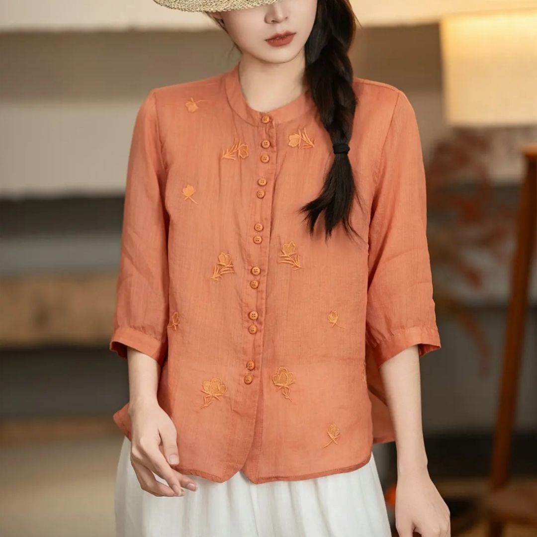 수직 칼라 레트로 느슨한 패션 자수 셔츠 여성 2025 한국 스타일 나이 감소 서양식 여름 새로운 도착 세븐 포인트 슬리브 셔츠
