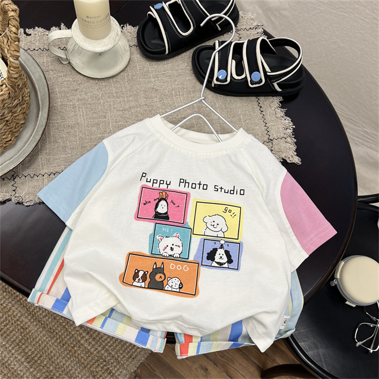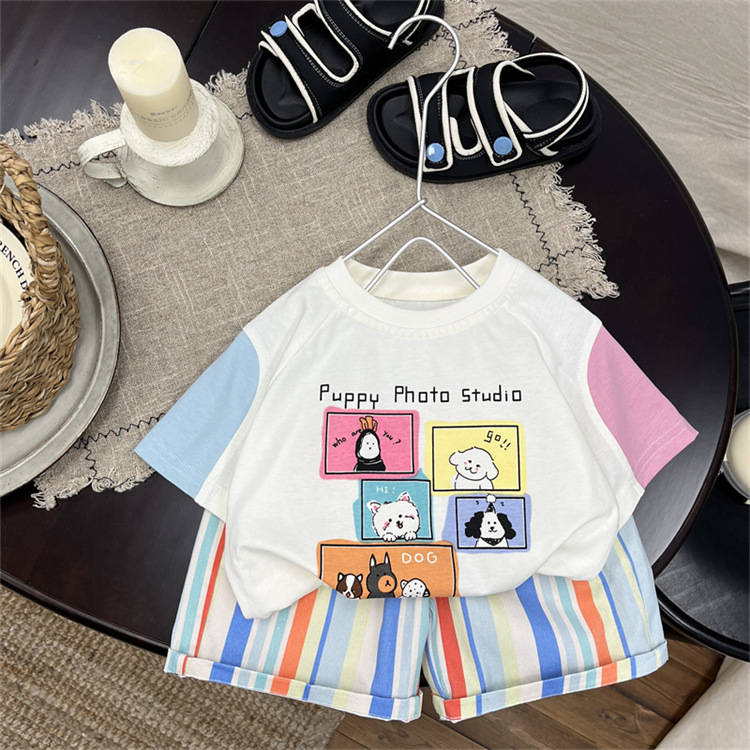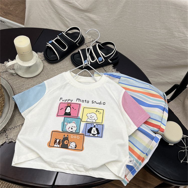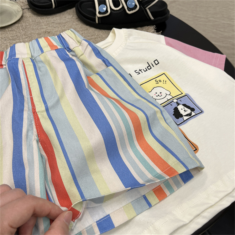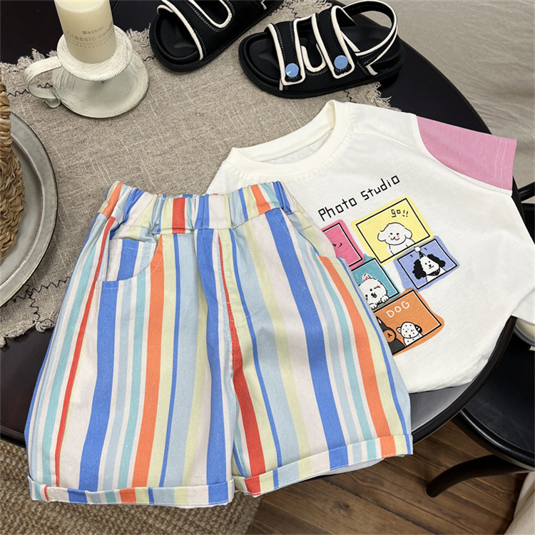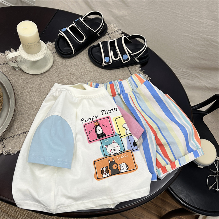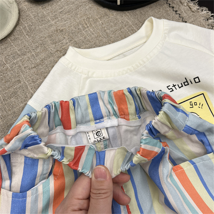 소년 잘 생긴 귀여운 만화 반팔 티셔츠 세트 2025 여름 어린이 캐주얼 줄무늬 바지 투피스 세트스토어 가기
