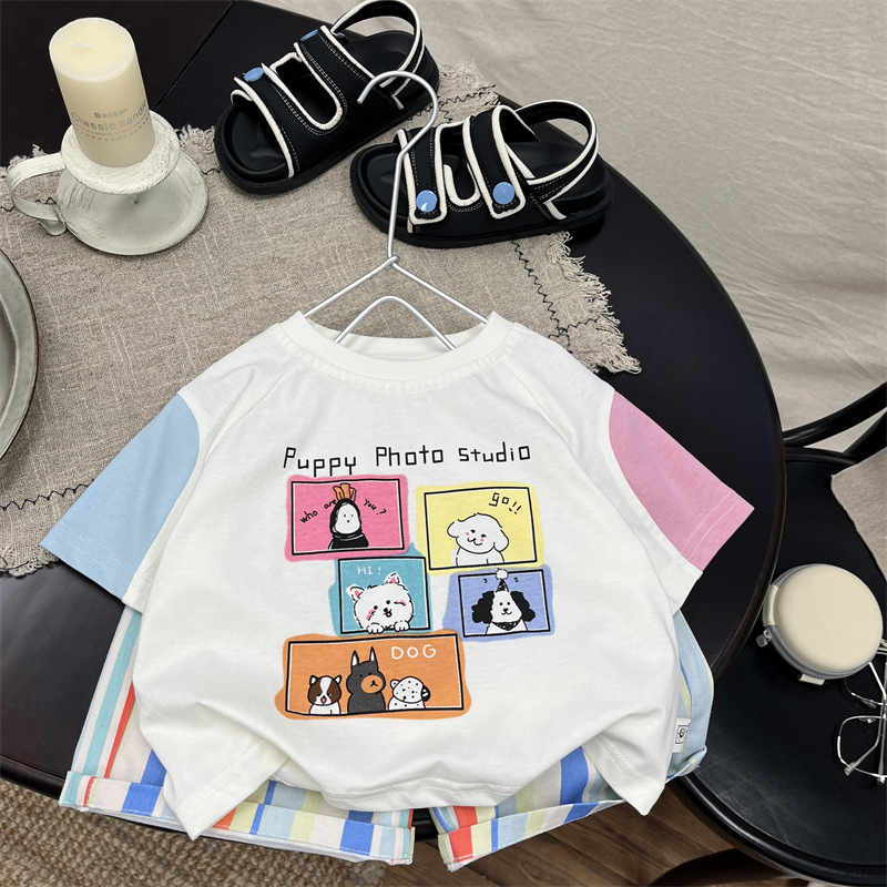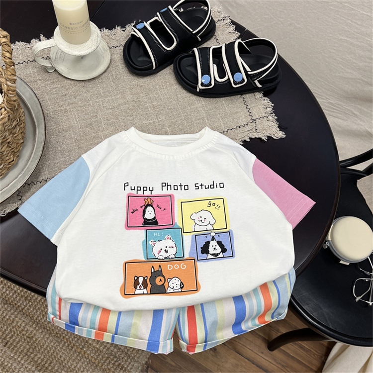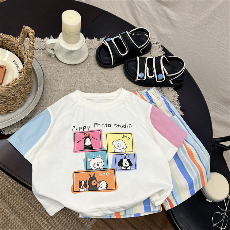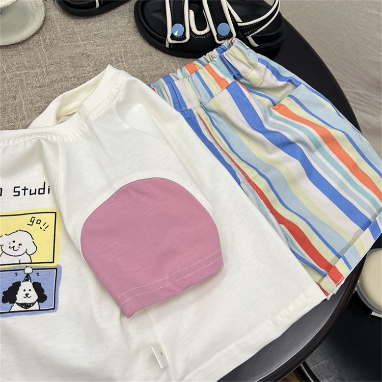 소년 잘 생긴 귀여운 만화 반팔 티셔츠 세트 2025 여름 어린이 캐주얼 줄무늬 바지 투피스 세트