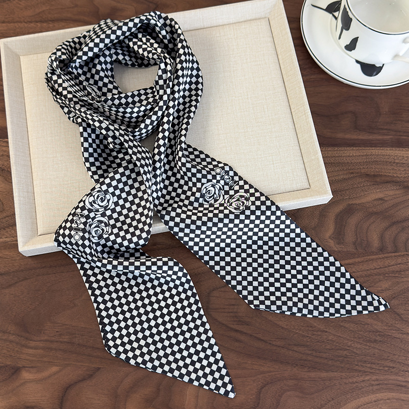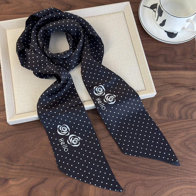 샤오 샹 스타일 흑백 웨이브 도트 동백 스카프 여성 여름 목 고급 얇은 좁은 긴 스카프 리본 목걸이