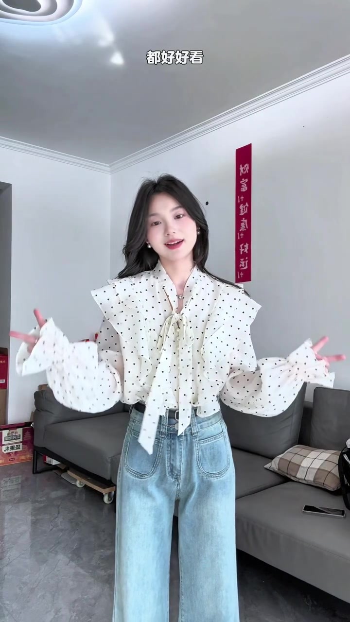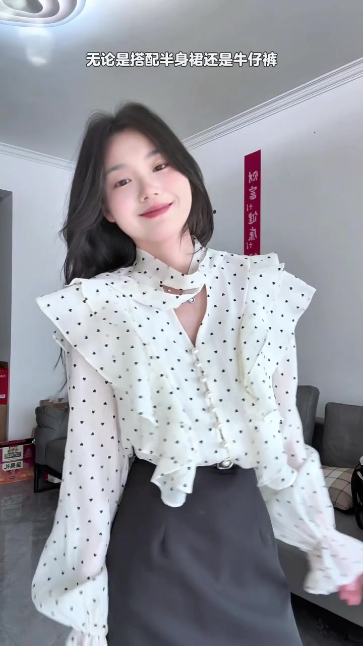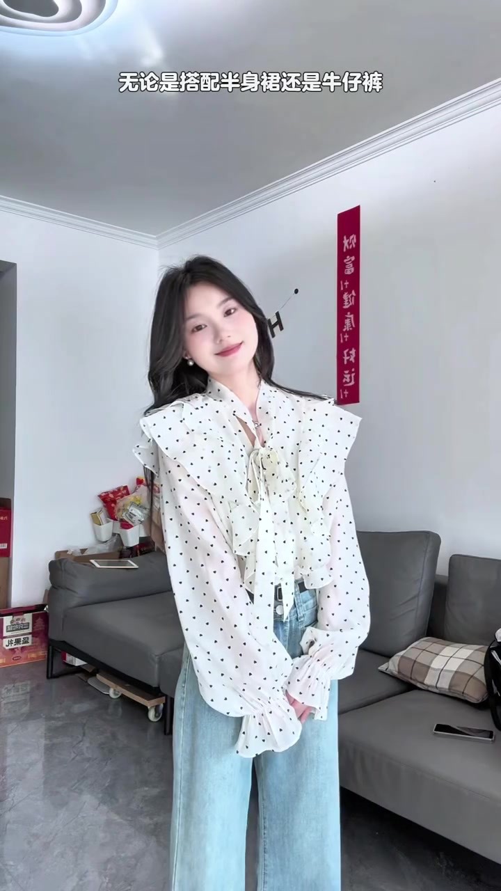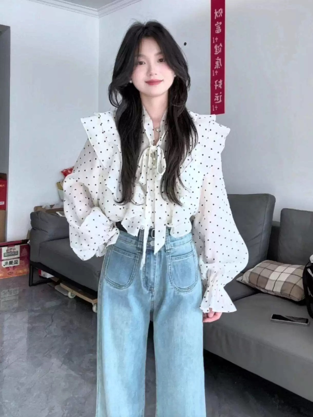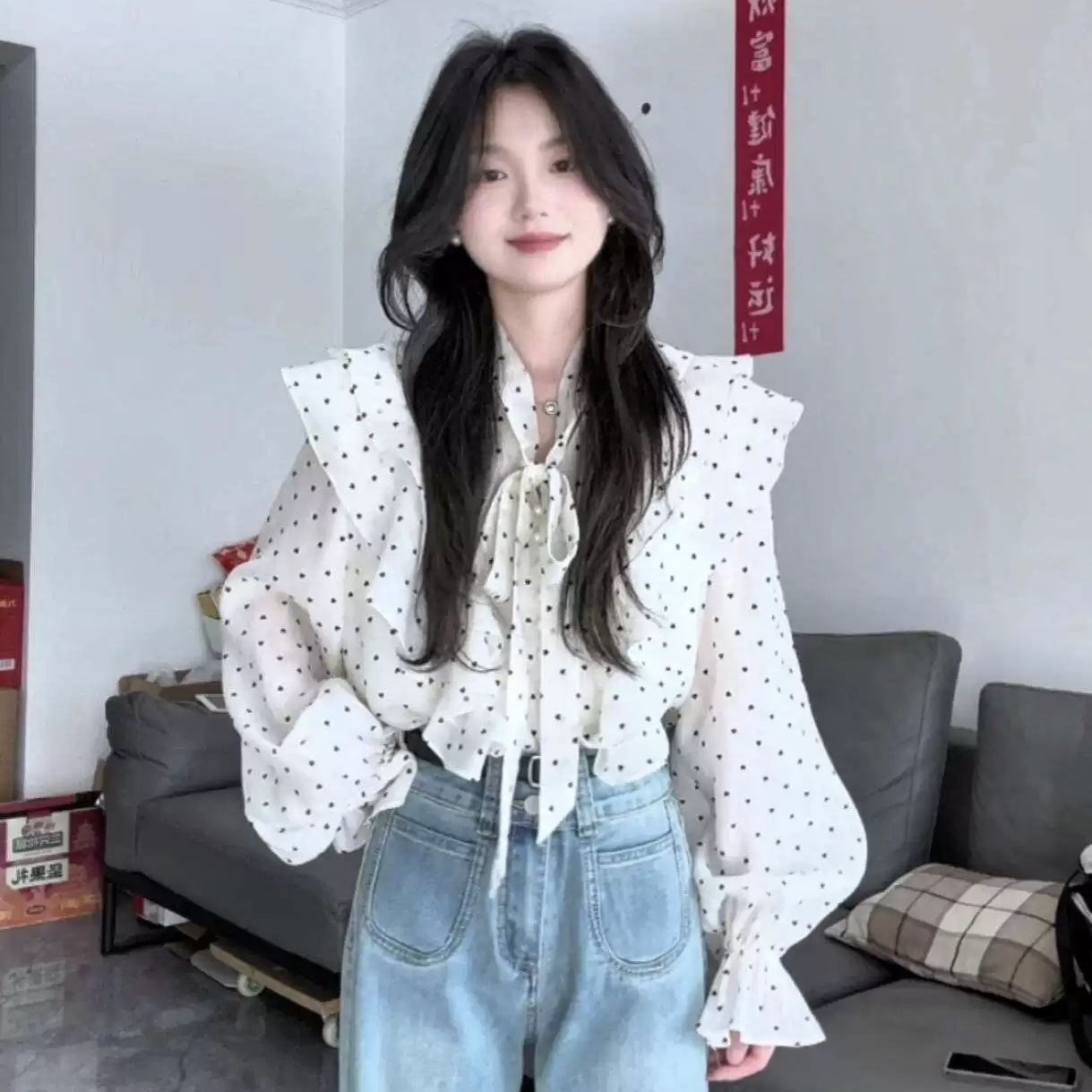 프랑스 러플 웨이브 도트 쉬폰 셔츠 여성의 봄과 가을 새로운 하이 엔드 독특한 세련된 셔츠 긴팔 탑스토어 가기