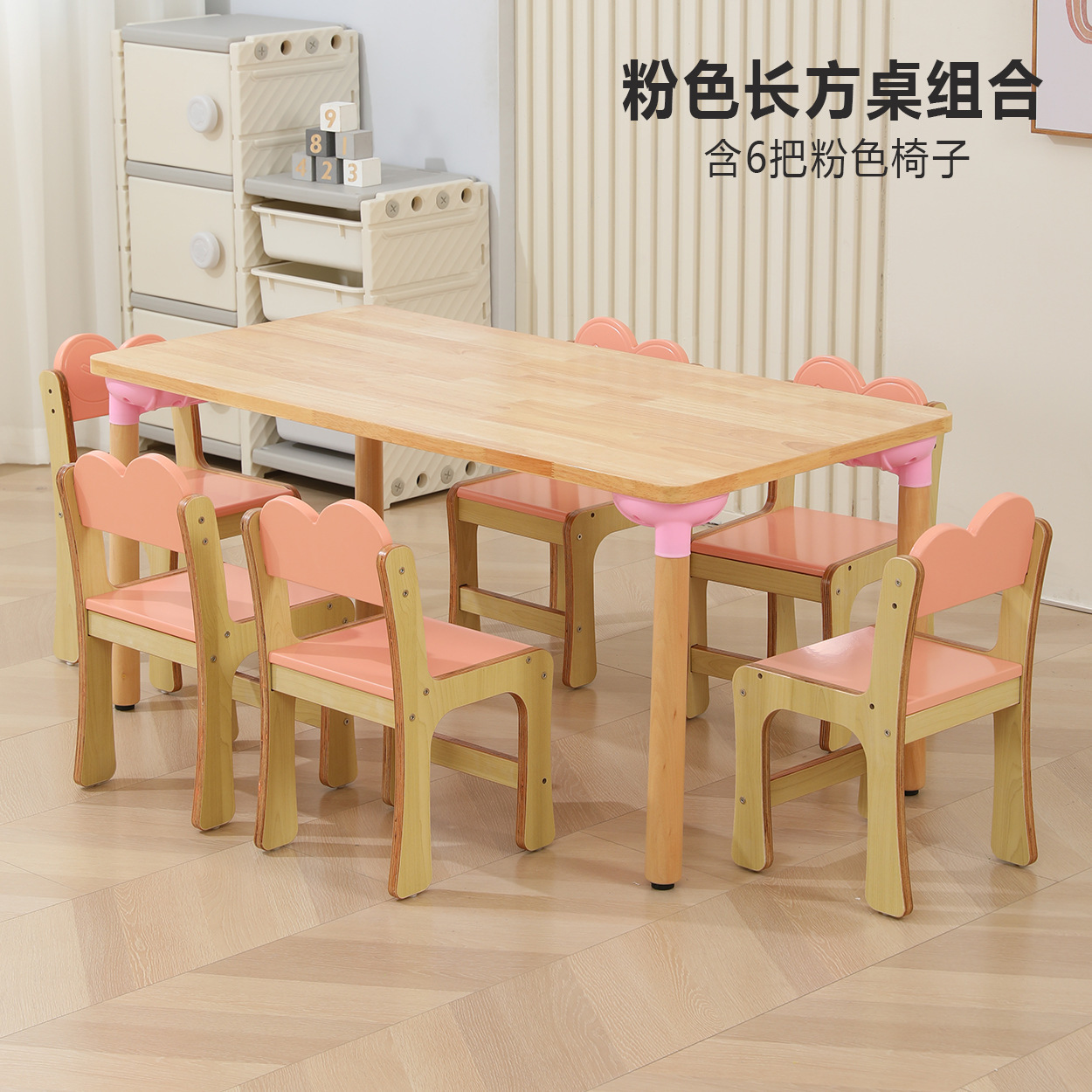 • 오크 핑크 직사각형 테이블, 테이블 1개, 의자 6개, 높이 비고