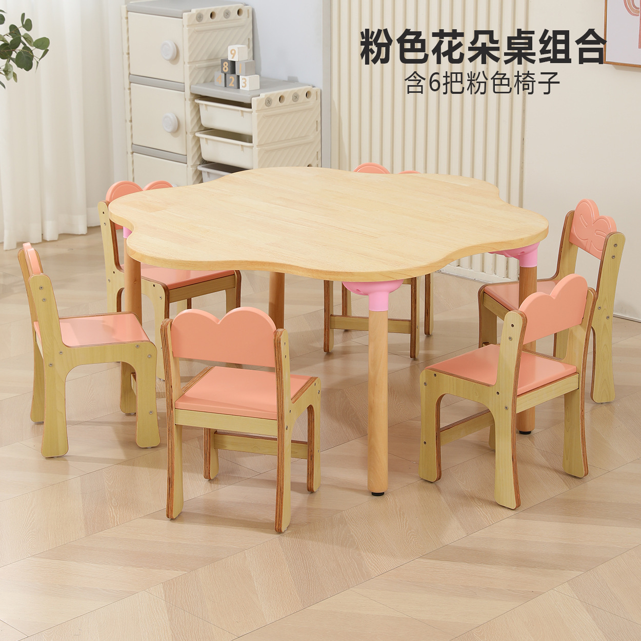 • 오크 핑크 꽃 테이블, 테이블 1개, 의자 6개, 높이 비고