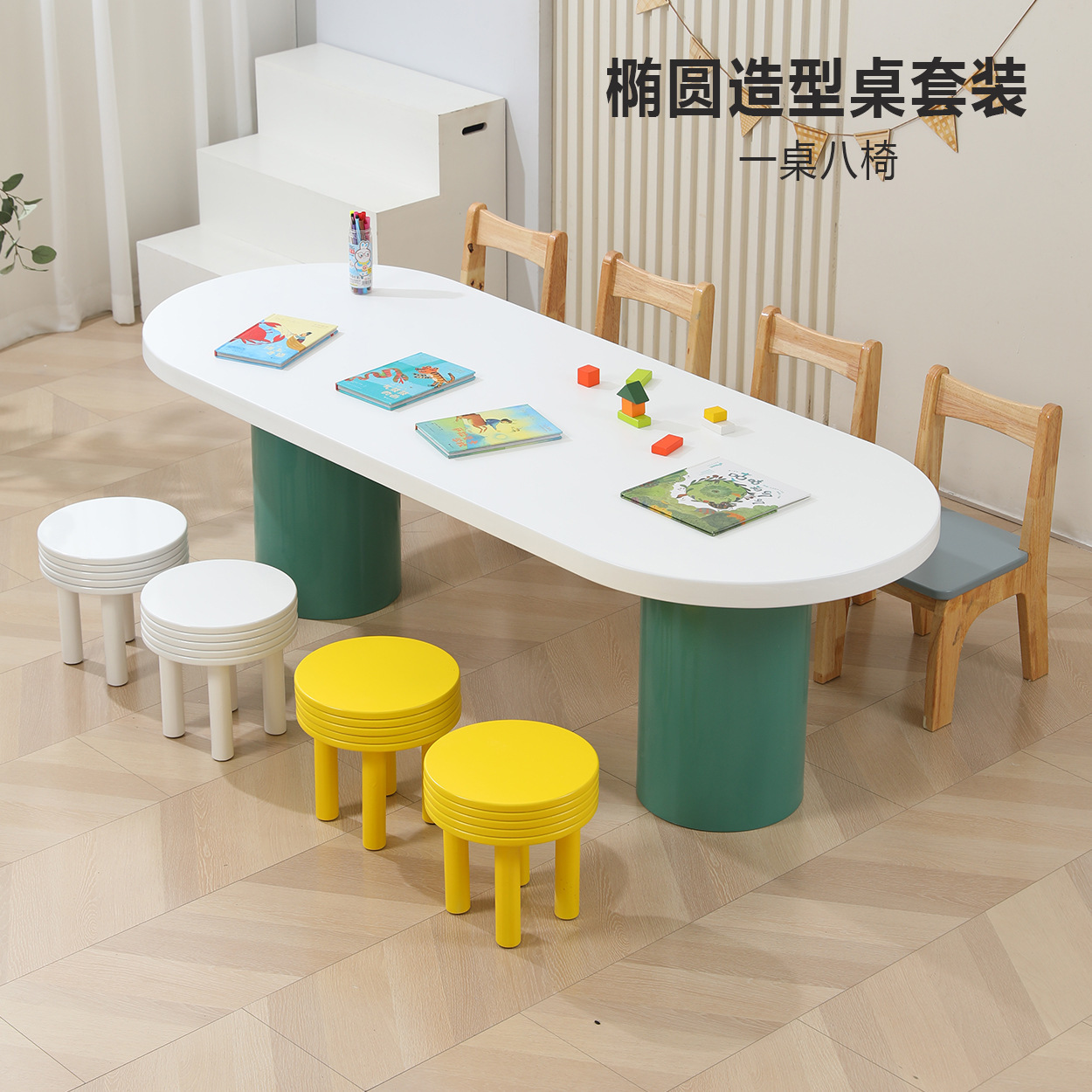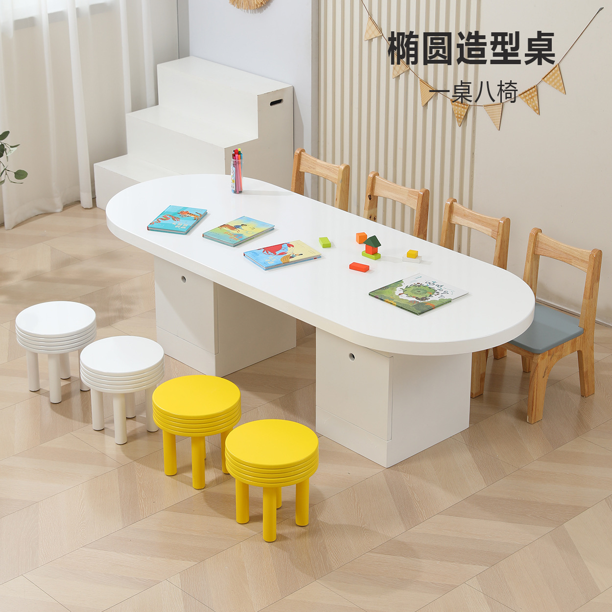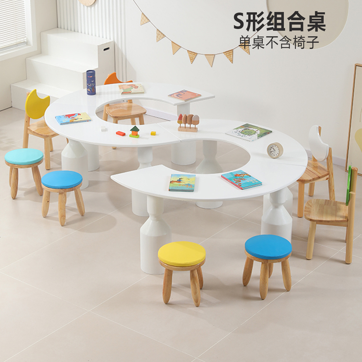 어린이 다인 창의적 조합 테이블 유치원 독서 및 쓰기 테이블 손으로 그린 테이블 조기 교육 도서관 단단한 나무 테이블