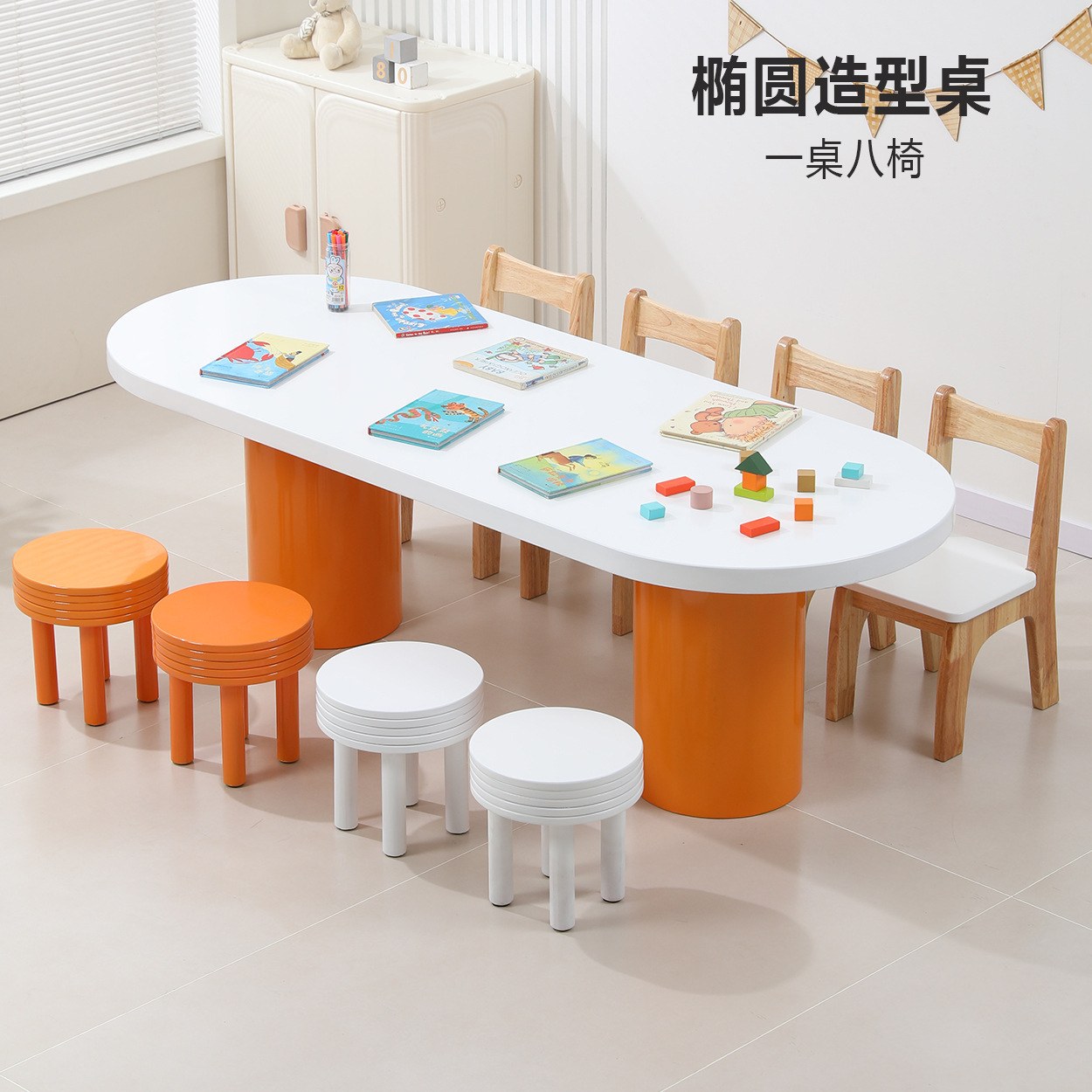 • 주황색 타원형 테이블, 테이블 1개, 의자 8개