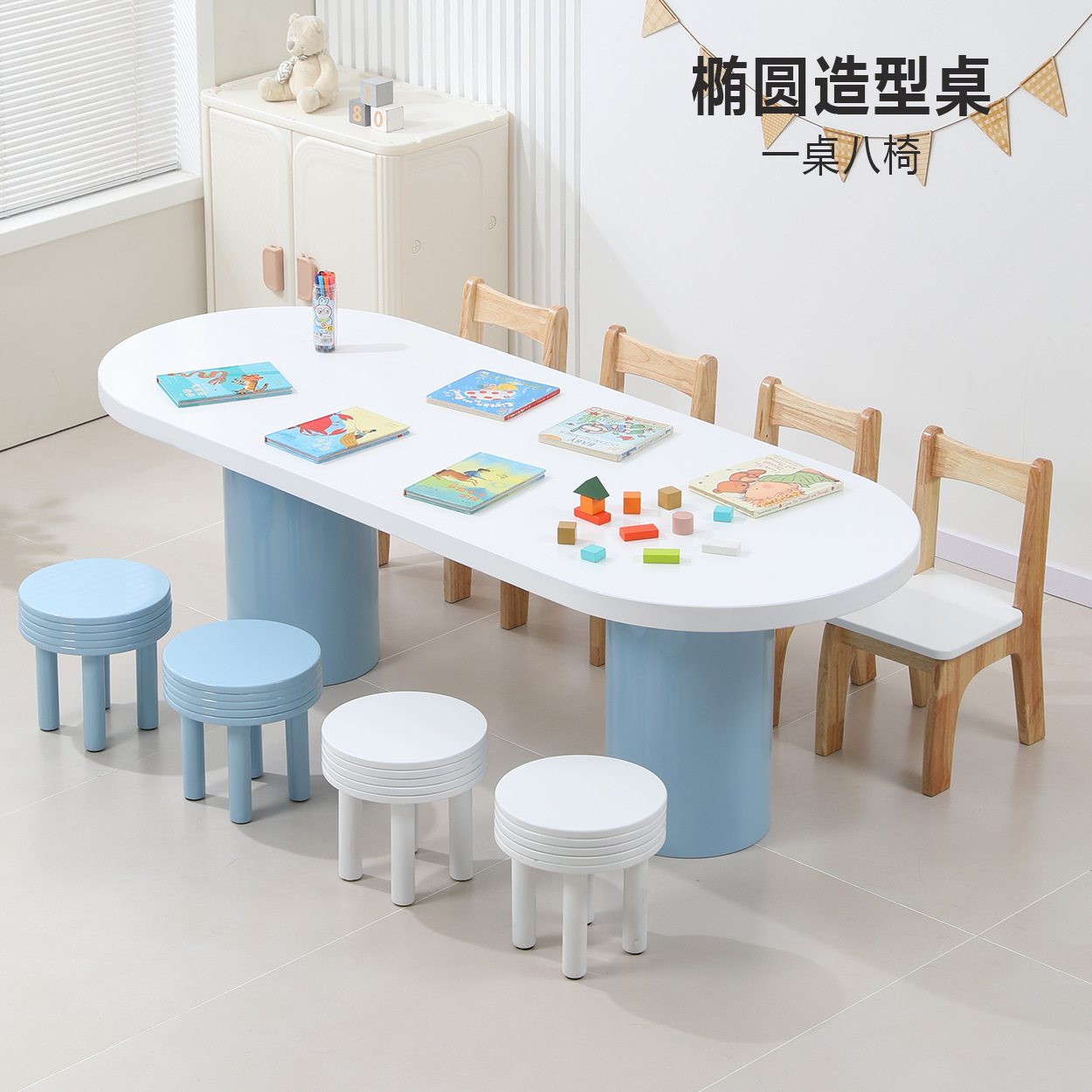 • 하늘색 타원형 테이블, 테이블 1개, 의자 8개