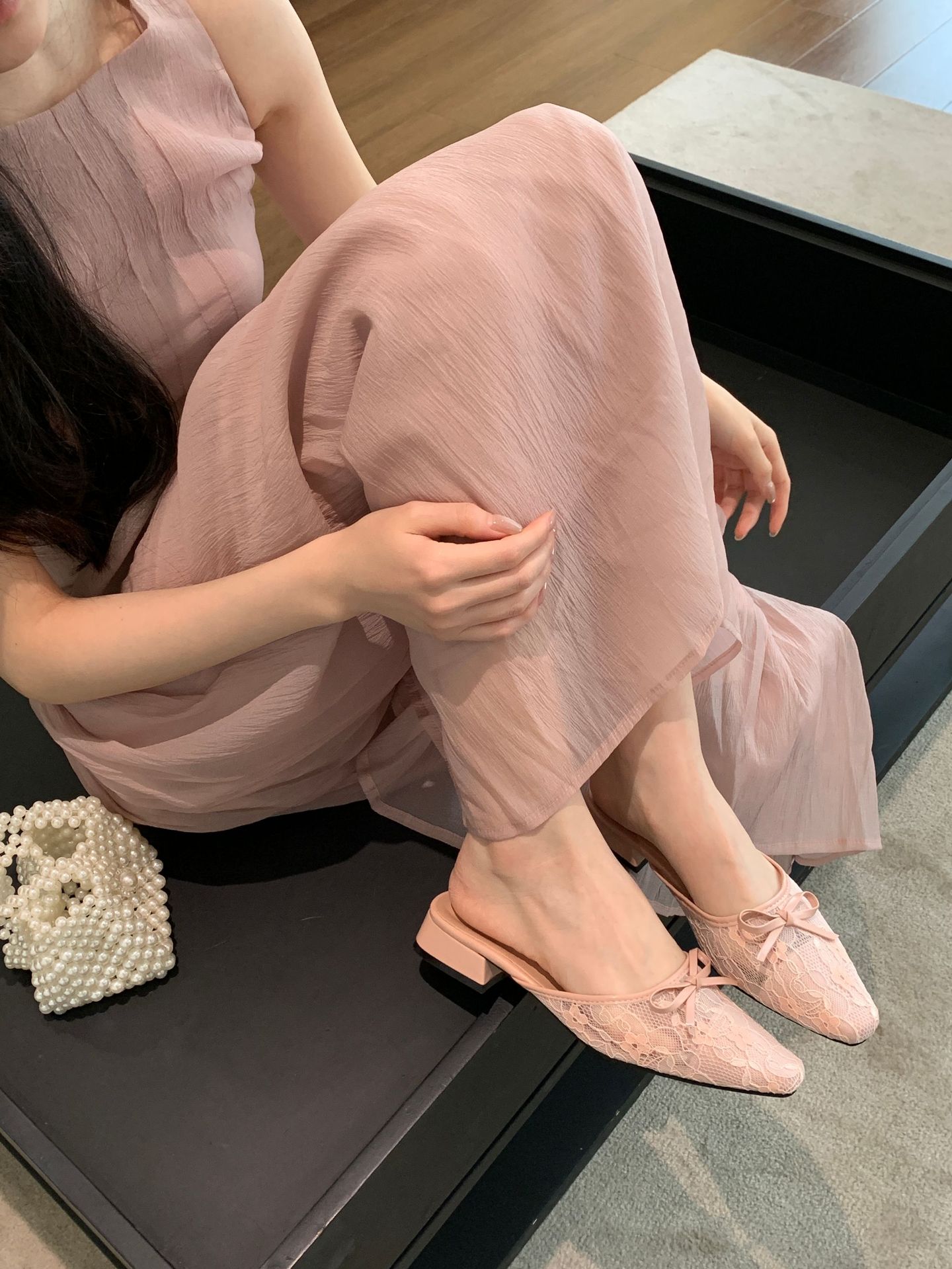 2025년 여름 신상 라운드 토 레이스 보우 두꺼운 미드 힐 중공 다용도 우아한 틈새 하프 드래그 여성 샌들