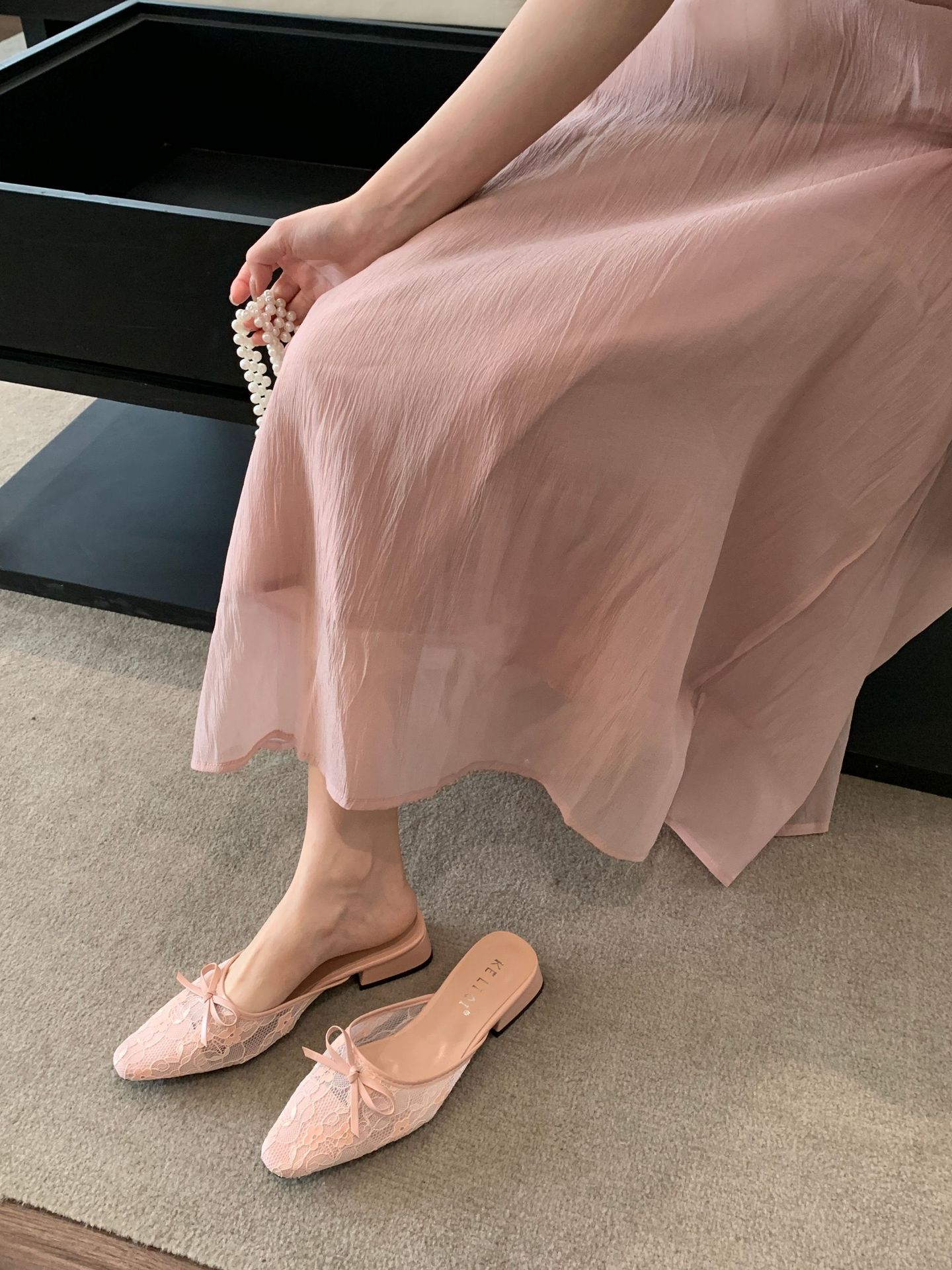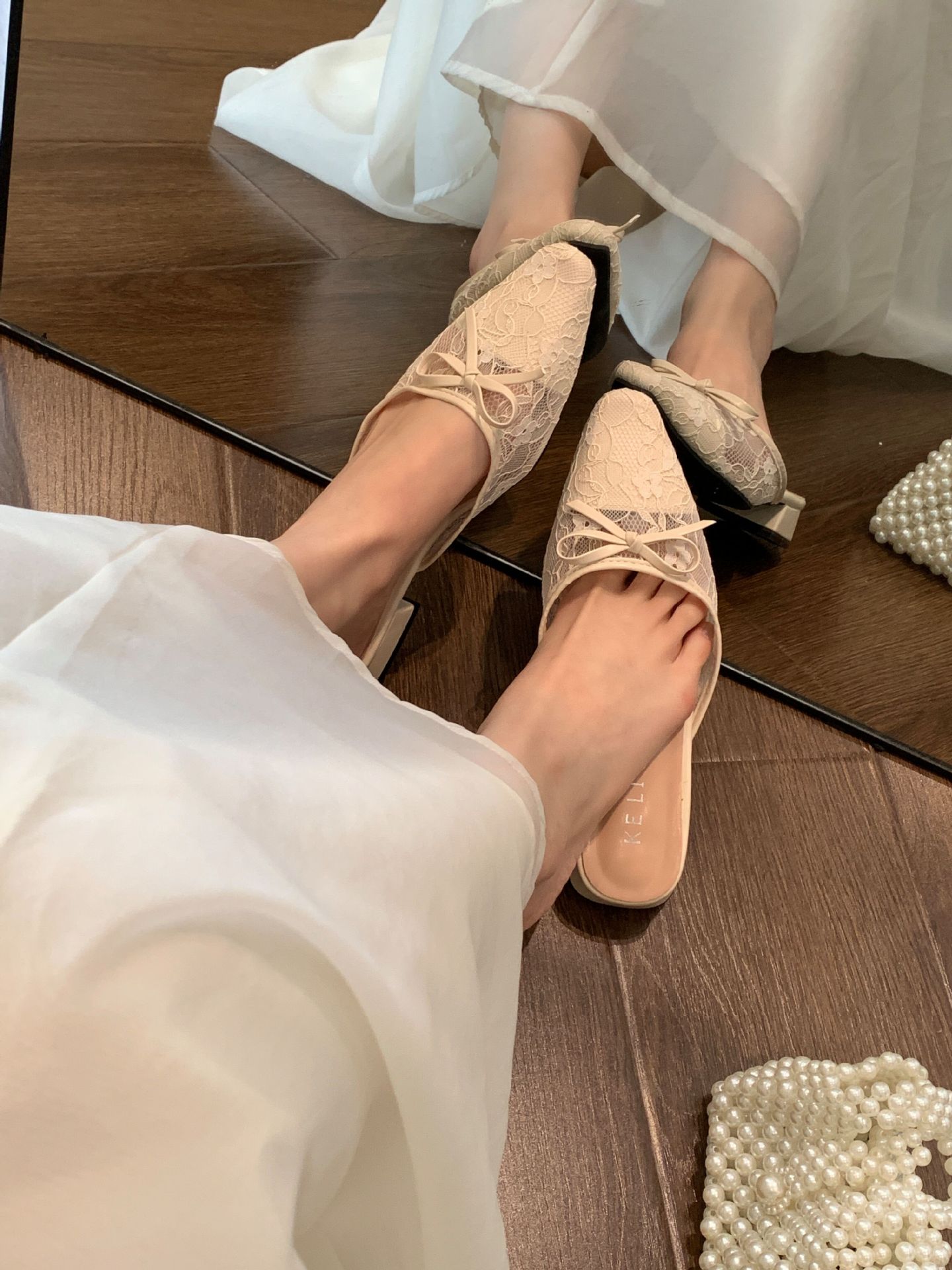 2025년 여름 신상 라운드 토 레이스 보우 두꺼운 미드 힐 중공 다용도 우아한 틈새 하프 드래그 여성 샌들스토어 가기