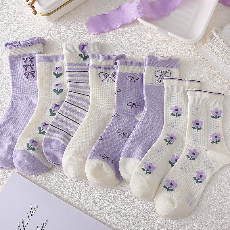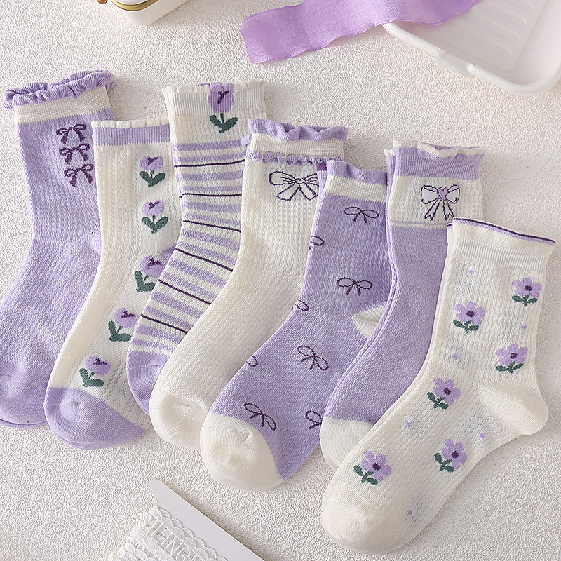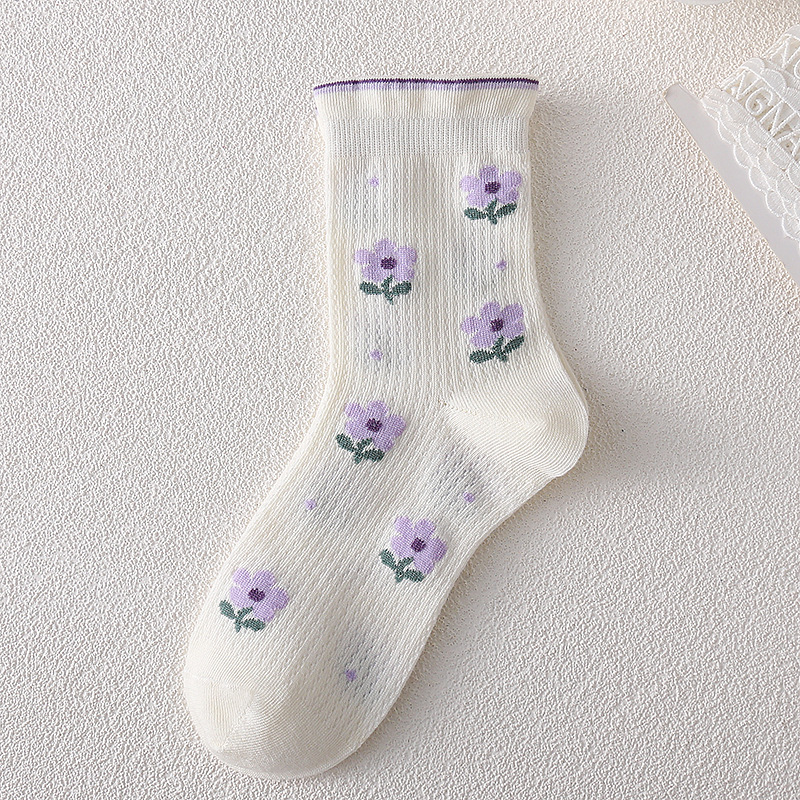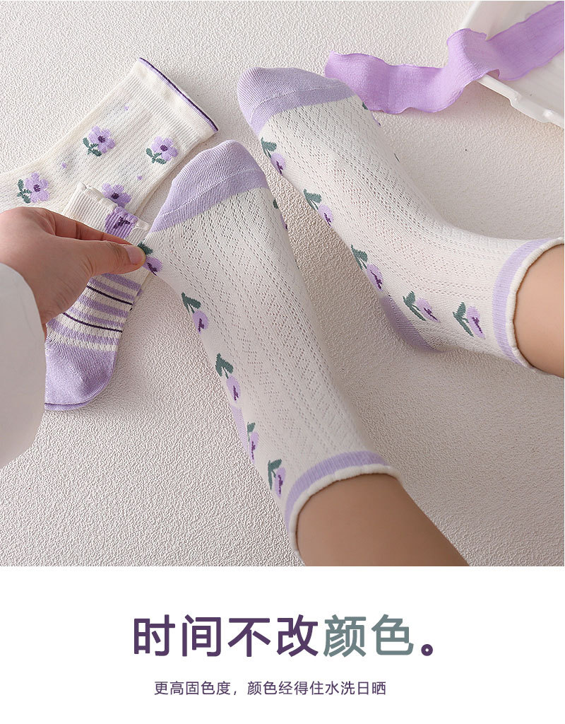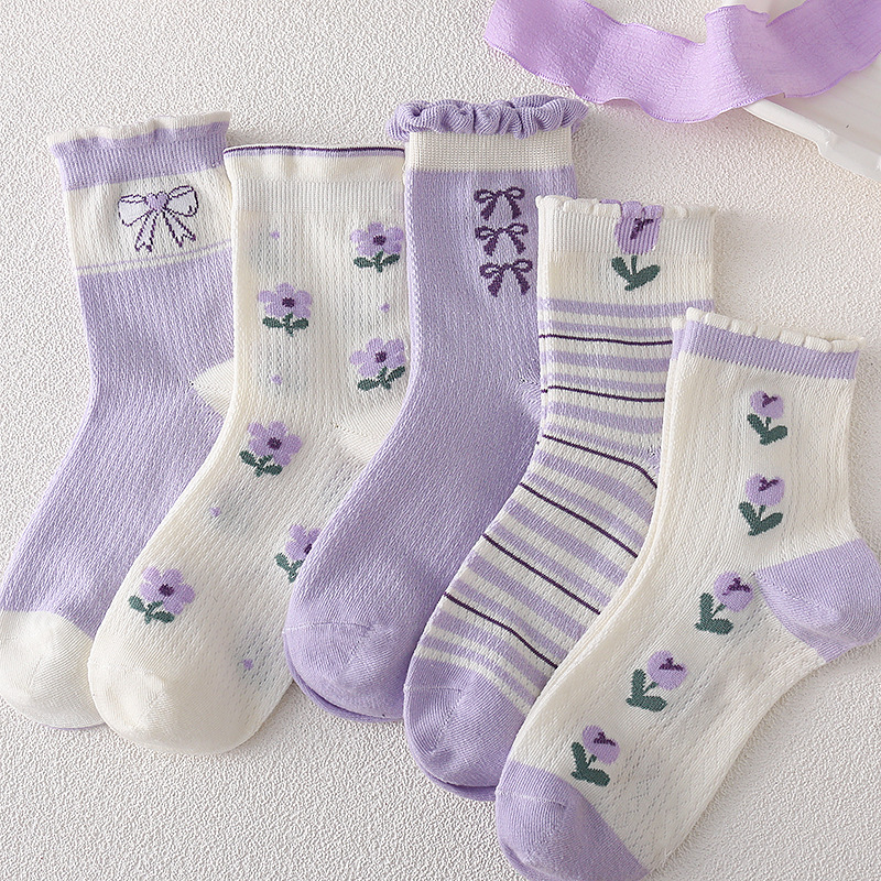 어린이 양말 소녀 봄과 여름 얇은 메쉬 통기성 6-14 세 보라색 소녀의 학생들을위한 신선한 올 매치 미드 튜브 양말스토어 가기