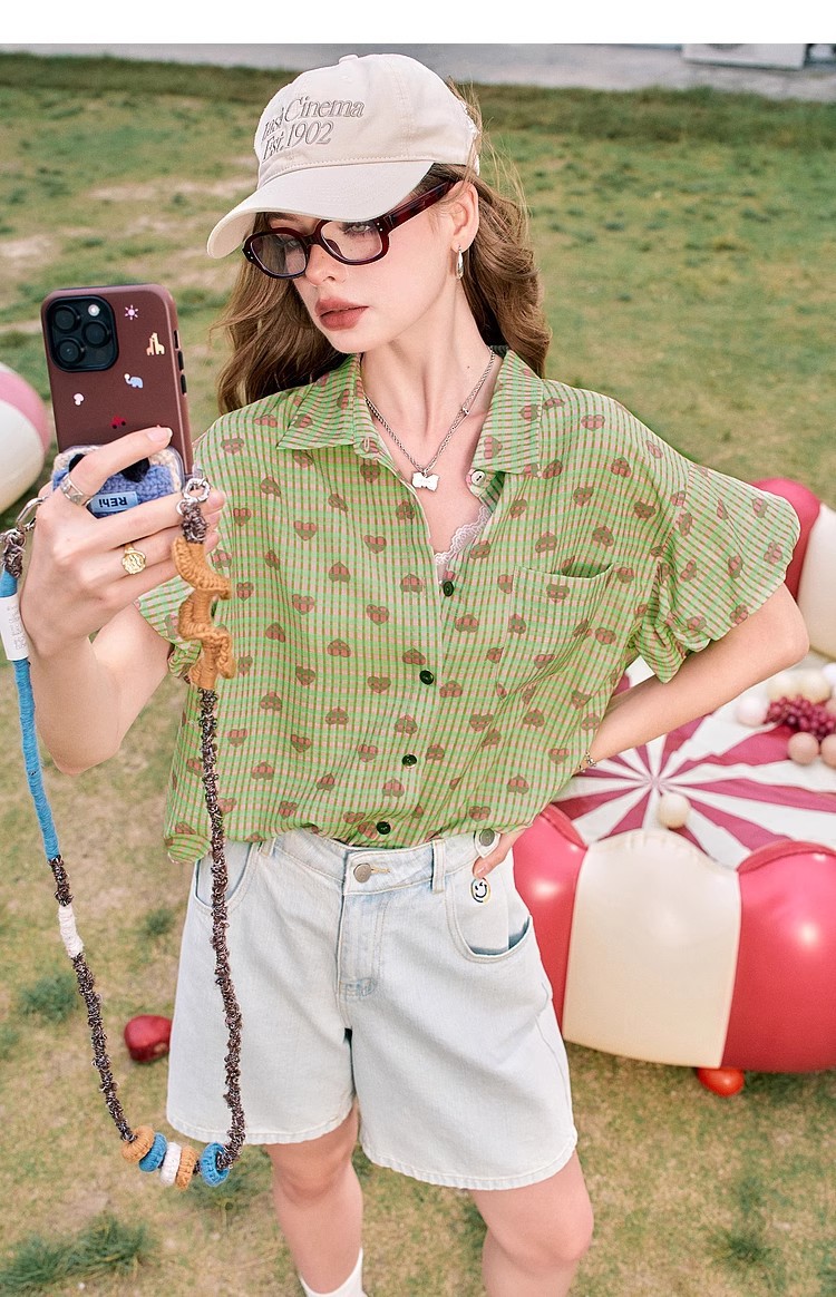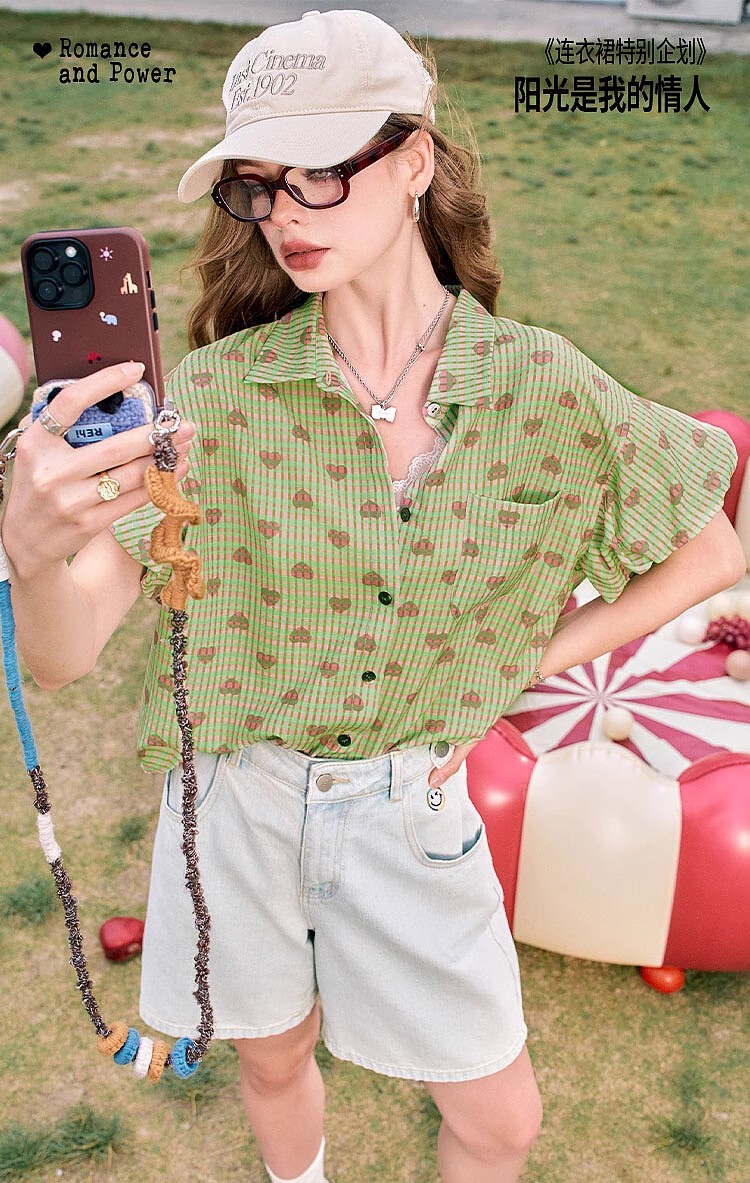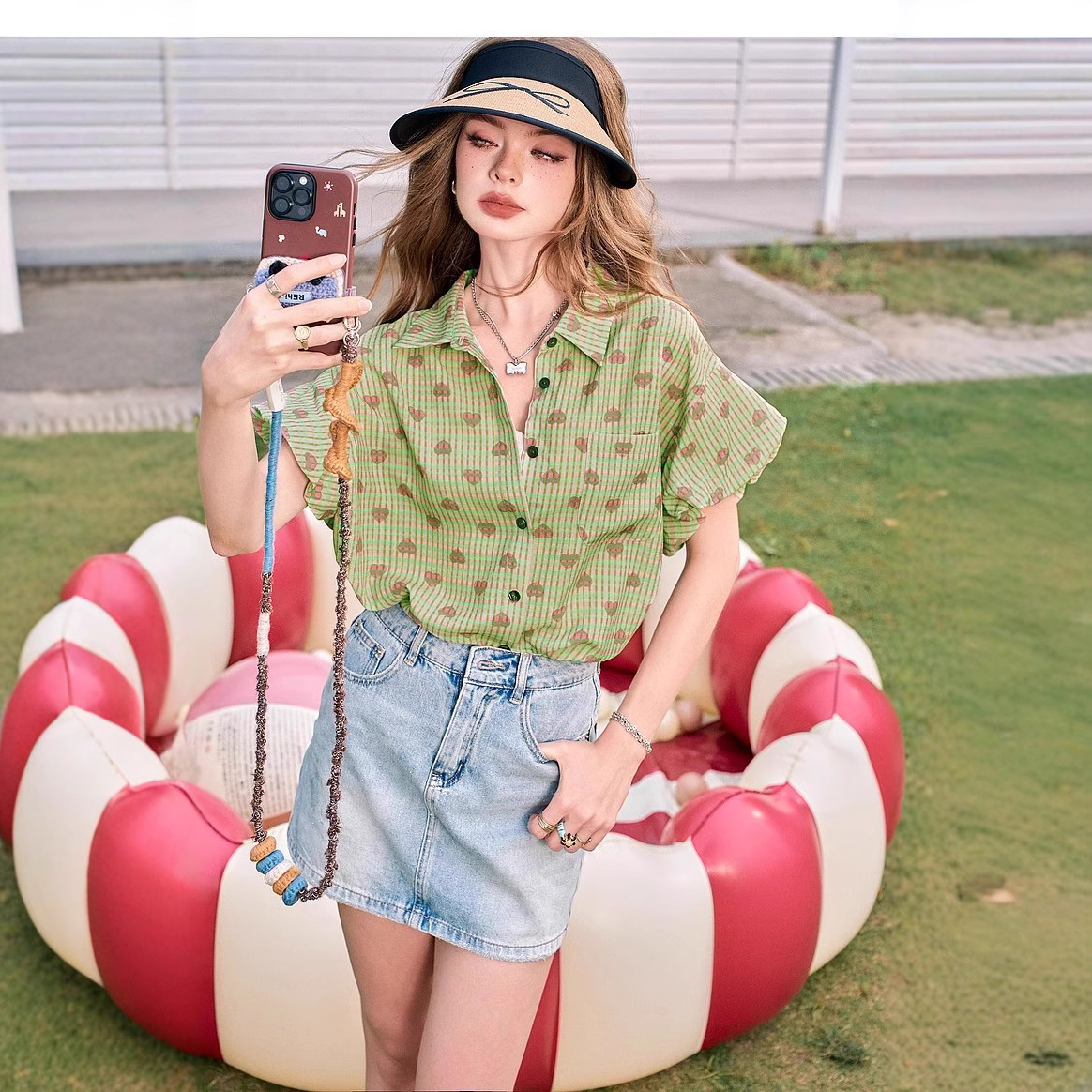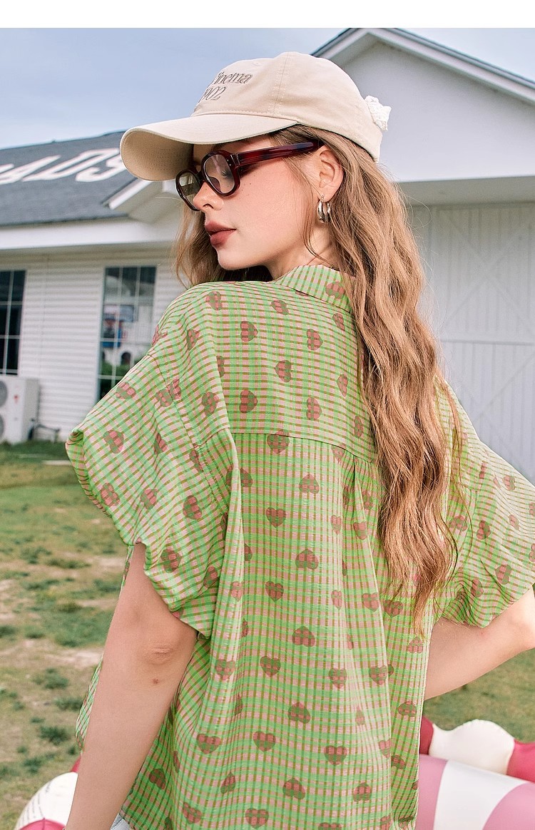 고블린의 주머니 사랑 인쇄 격자 무늬 반팔 셔츠 여성의 2025 년 여름 새로운 도착 꽃 소매 우아한 작은 셔츠스토어 가기