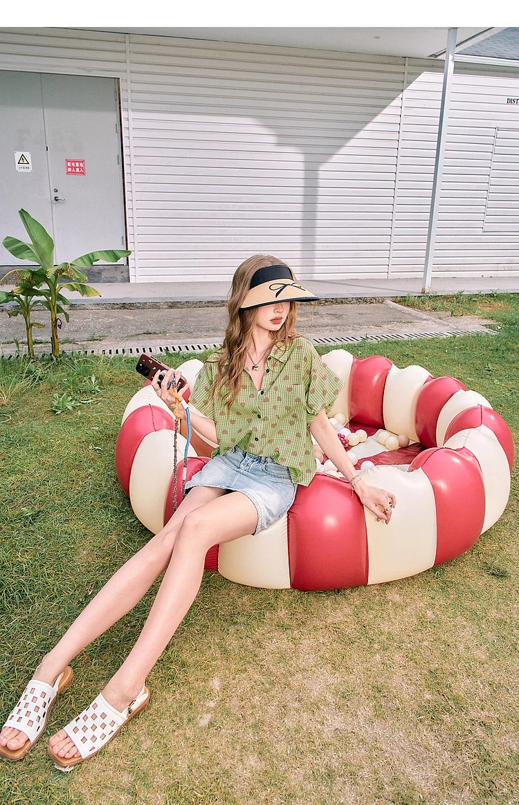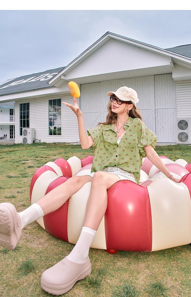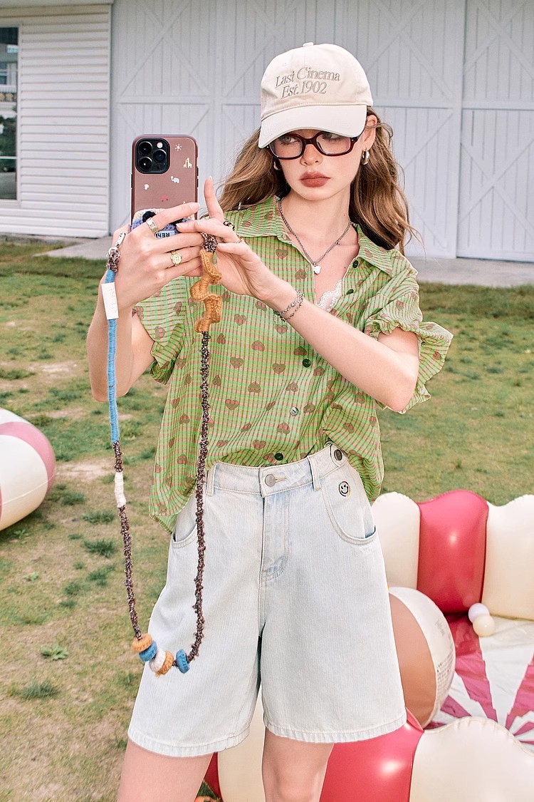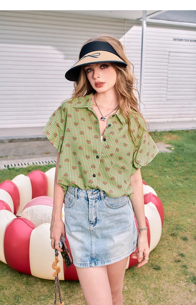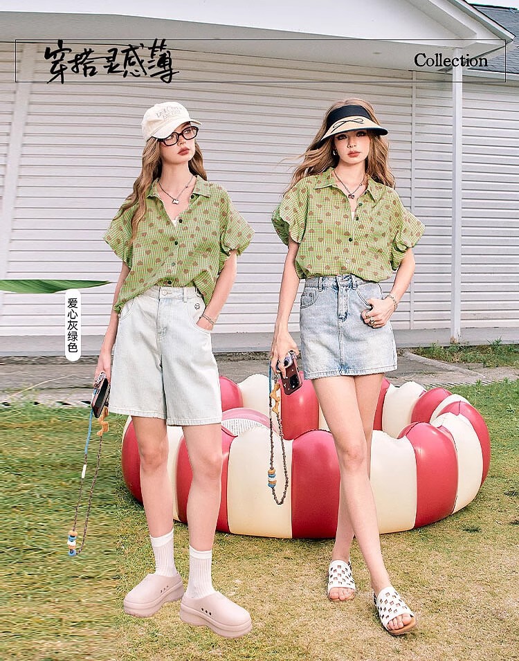 고블린의 주머니 사랑 인쇄 격자 무늬 반팔 셔츠 여성의 2025 년 여름 새로운 도착 꽃 소매 우아한 작은 셔츠스토어 가기