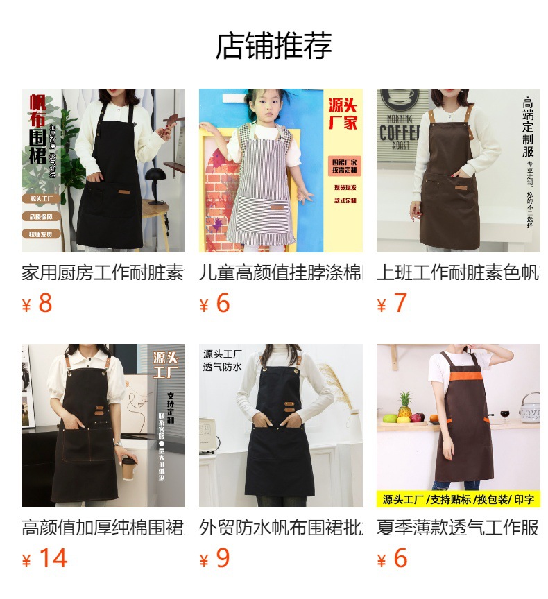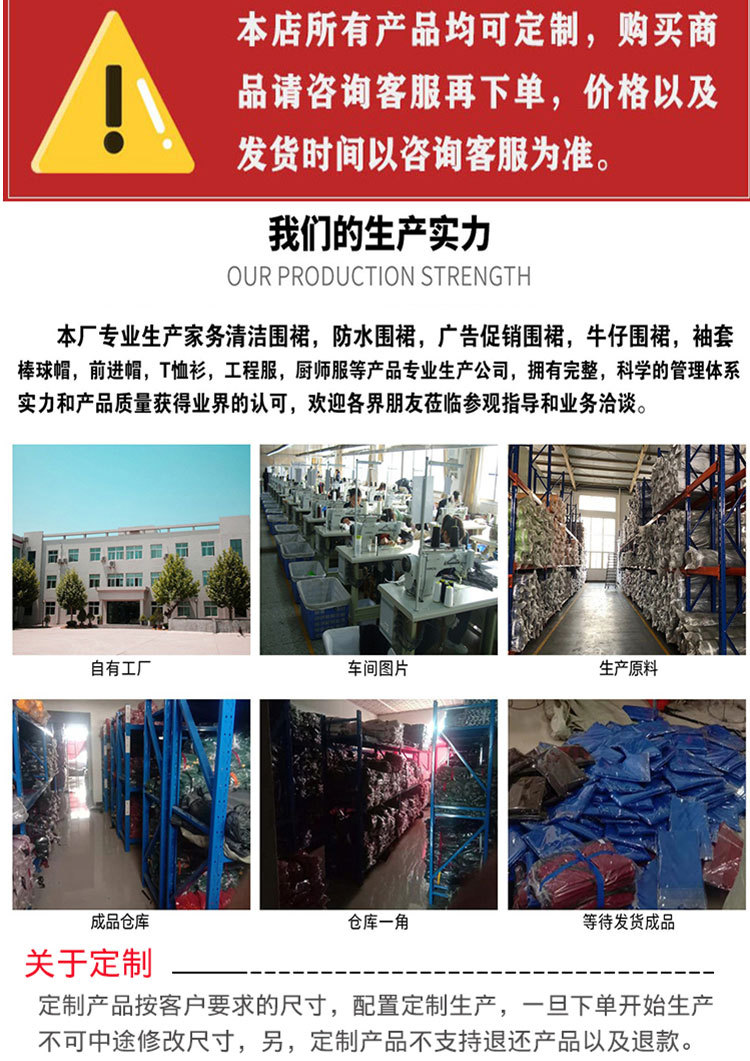 本厂是专业生产围裙20年的工厂,有着丰富的生产,定制经验,日产量8000+ 全套的生产设备,定制印字刺绣一站式服务 。 来样定制,代加工,一件代发,满足多样需求 跨境电商专属:opp包装,装箱,贴标等服务。 让您售后无忧,快速响应,贴心服务一路相伴。