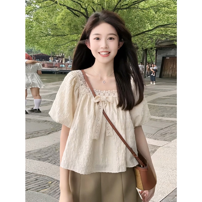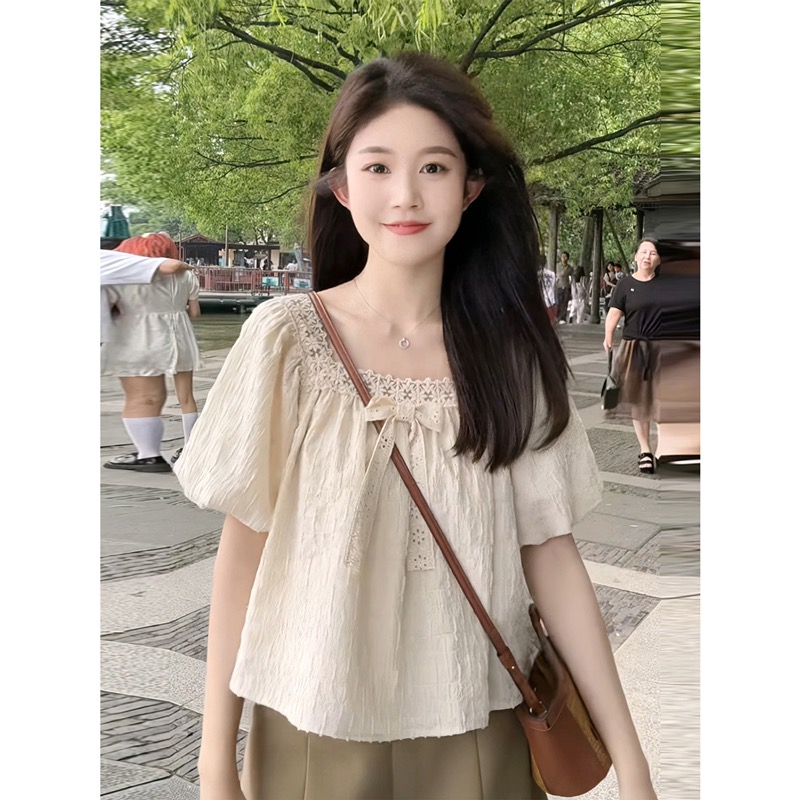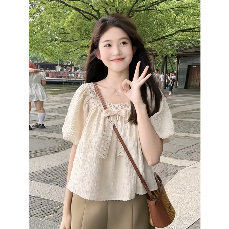 작은 프랑스 스타일 레이스 쉬폰 셔츠 여성의 여름 하이 엔드 슬림 퍼프 소매 짧은 최고 틈새 디자인 감각스토어 가기