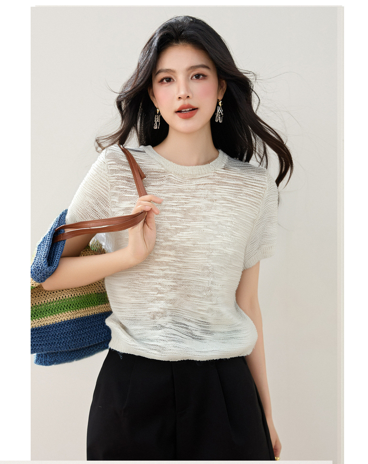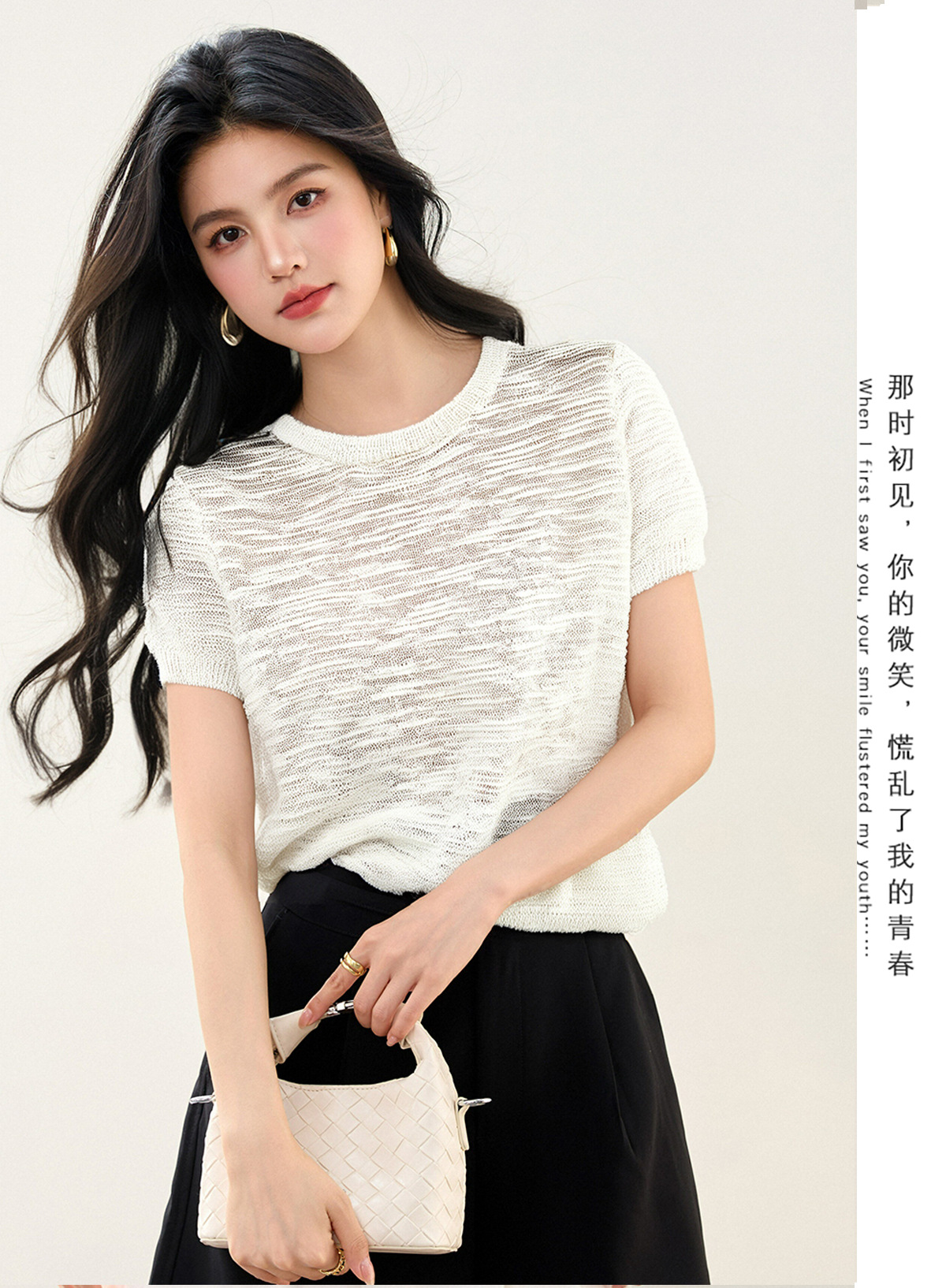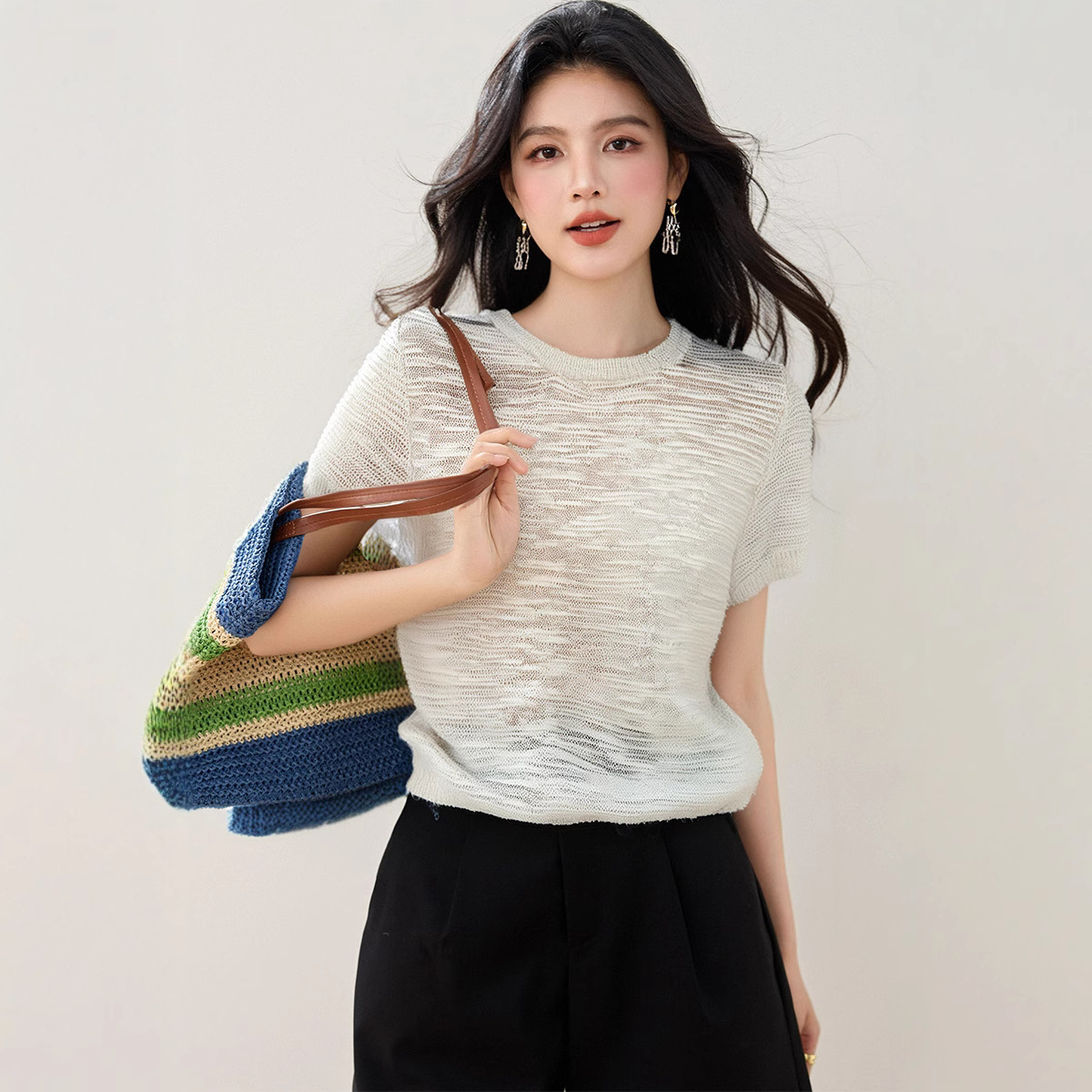2025 년 여름 새로운 한국 캐주얼 틈새 디자인 아이스 실크 할로우 얇은 마이크로 투명 반팔 니트 티셔츠 여성용