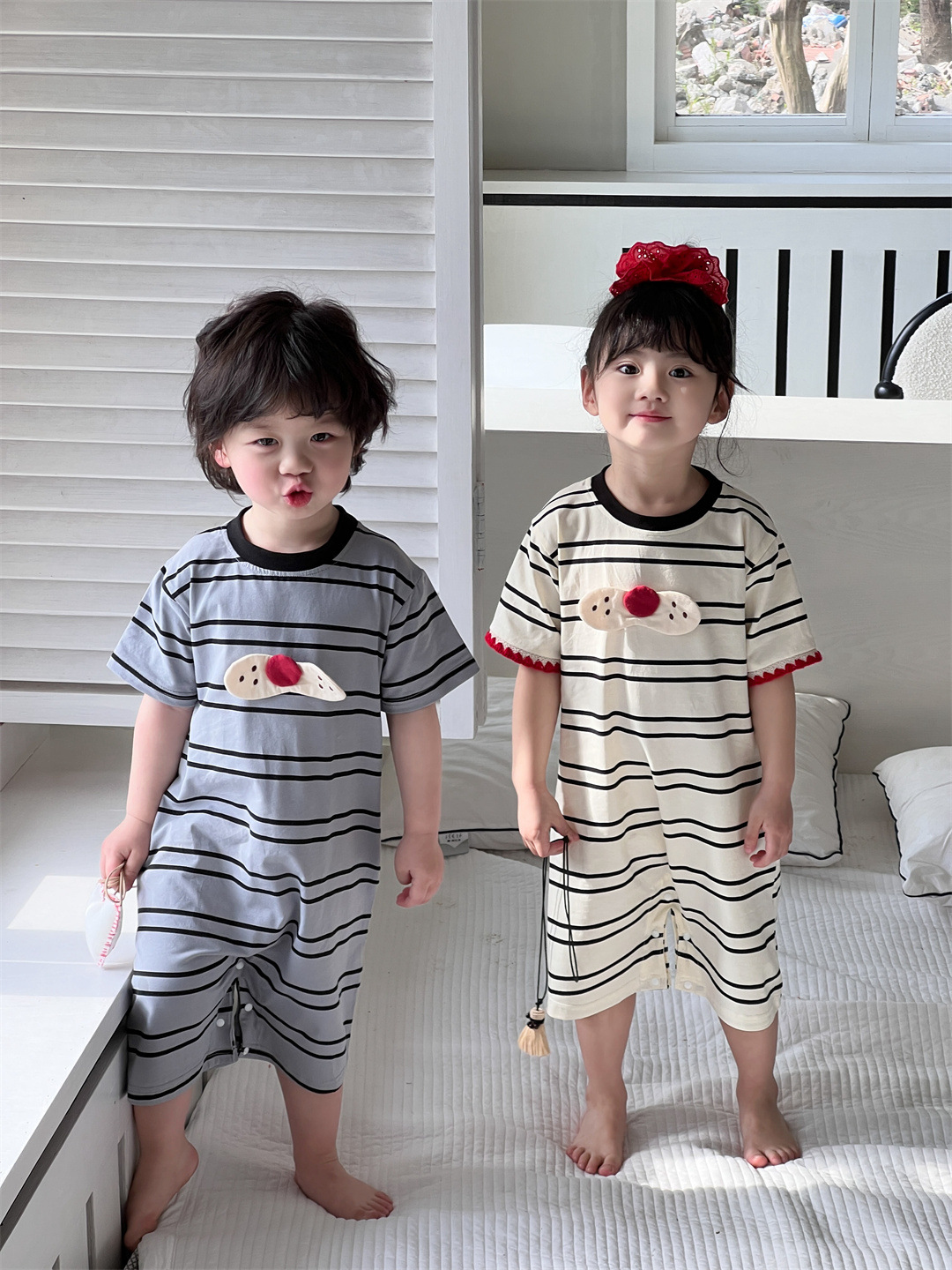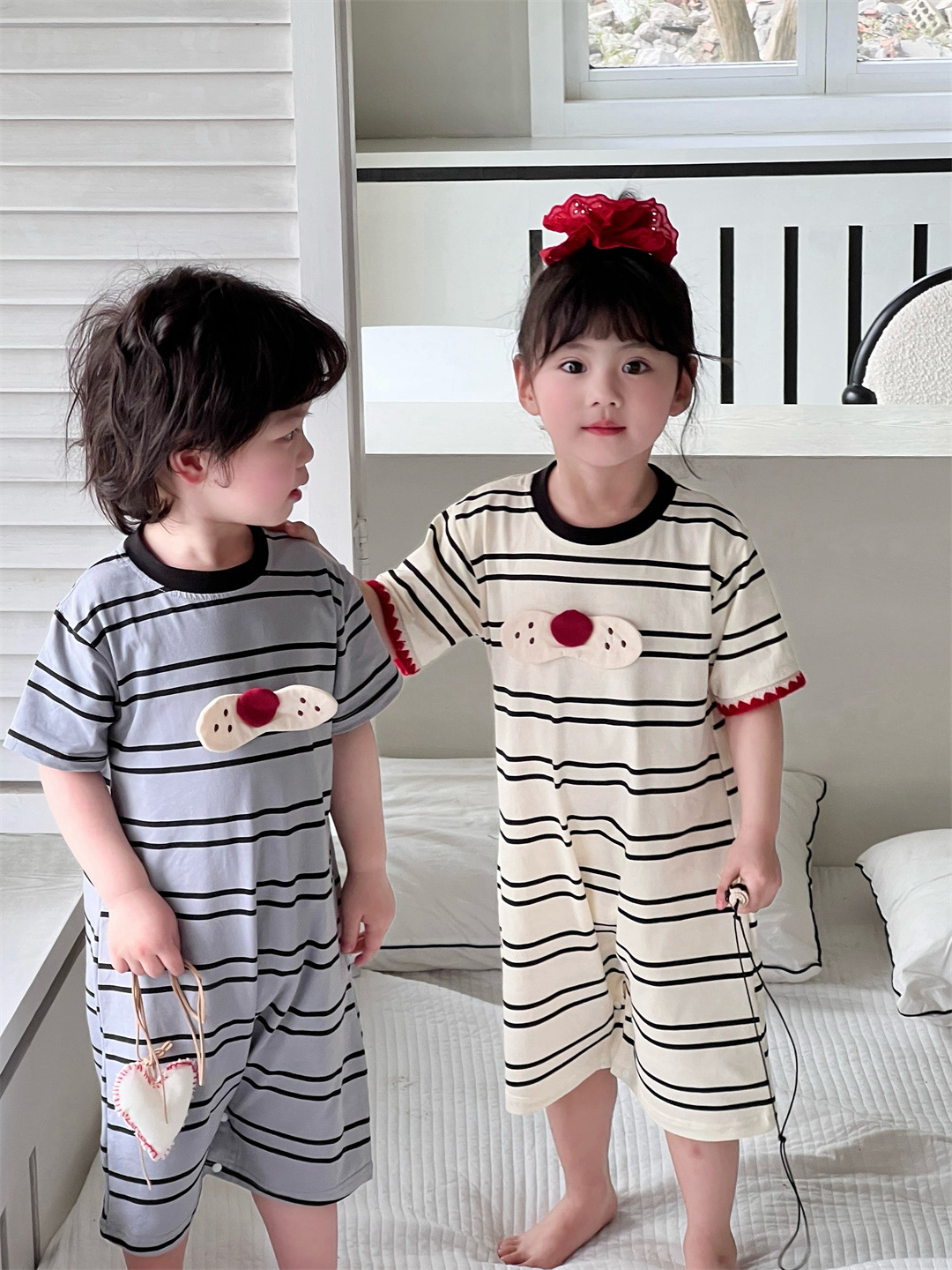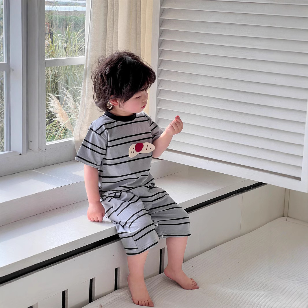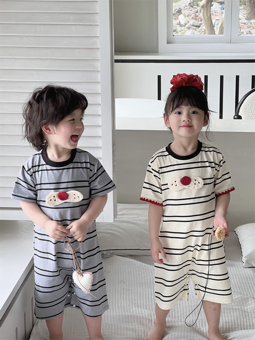 어린이 한국 스타일 느슨한 줄무늬 Jayshirt 여름 순수면 느슨한 다리 잠옷 아기의 캐주얼 반팔 홈 옷스토어 가기
