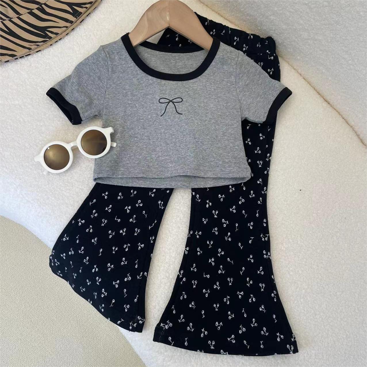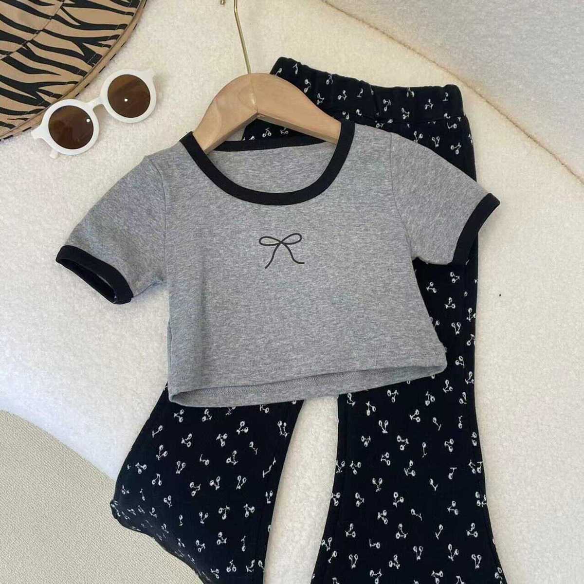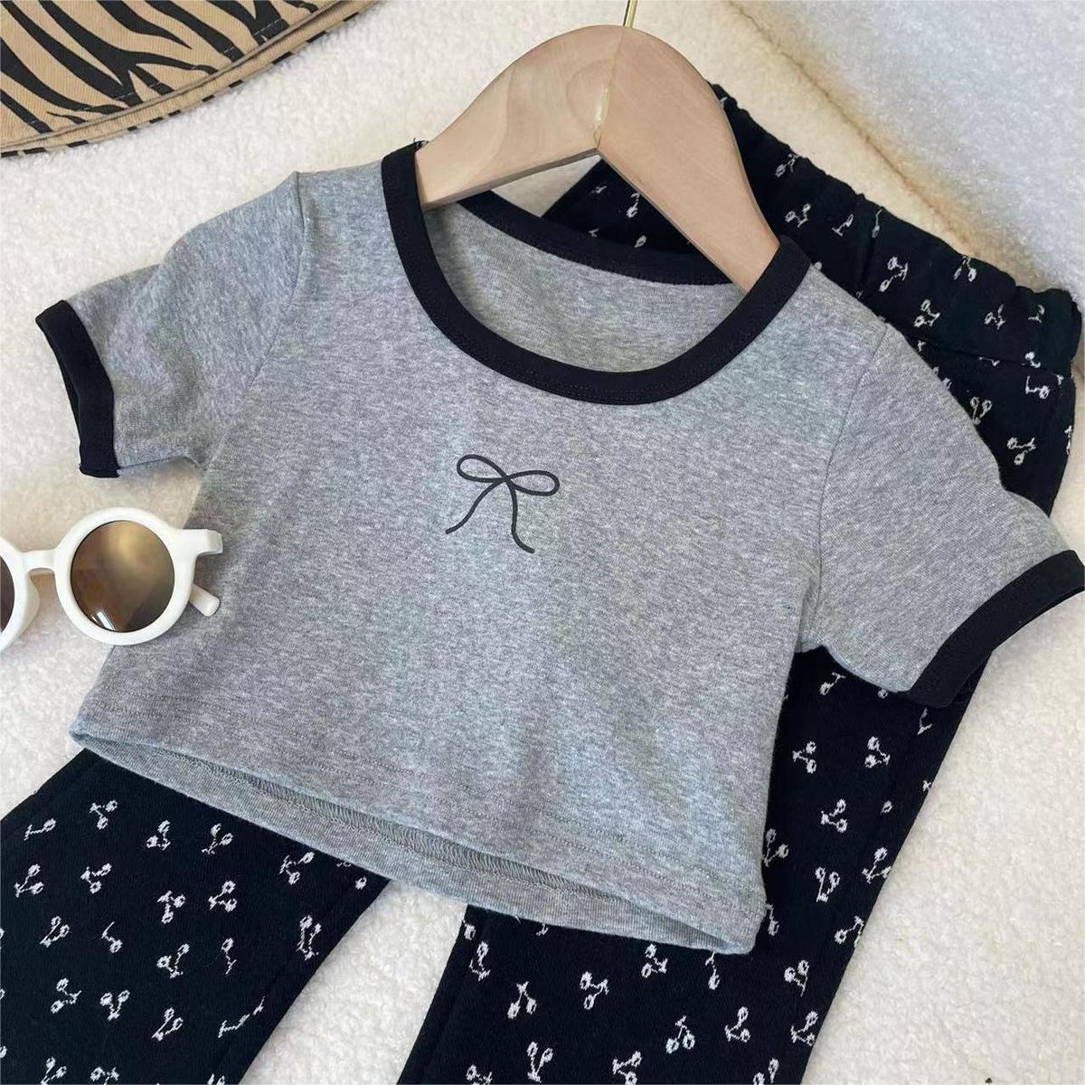 어린이 2025 년 여름 새 회색 반팔 티셔츠 경적 바지 투피스 여자 한국식 캐주얼 세트 트렌디스토어 가기