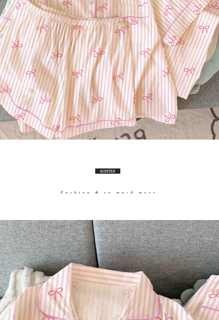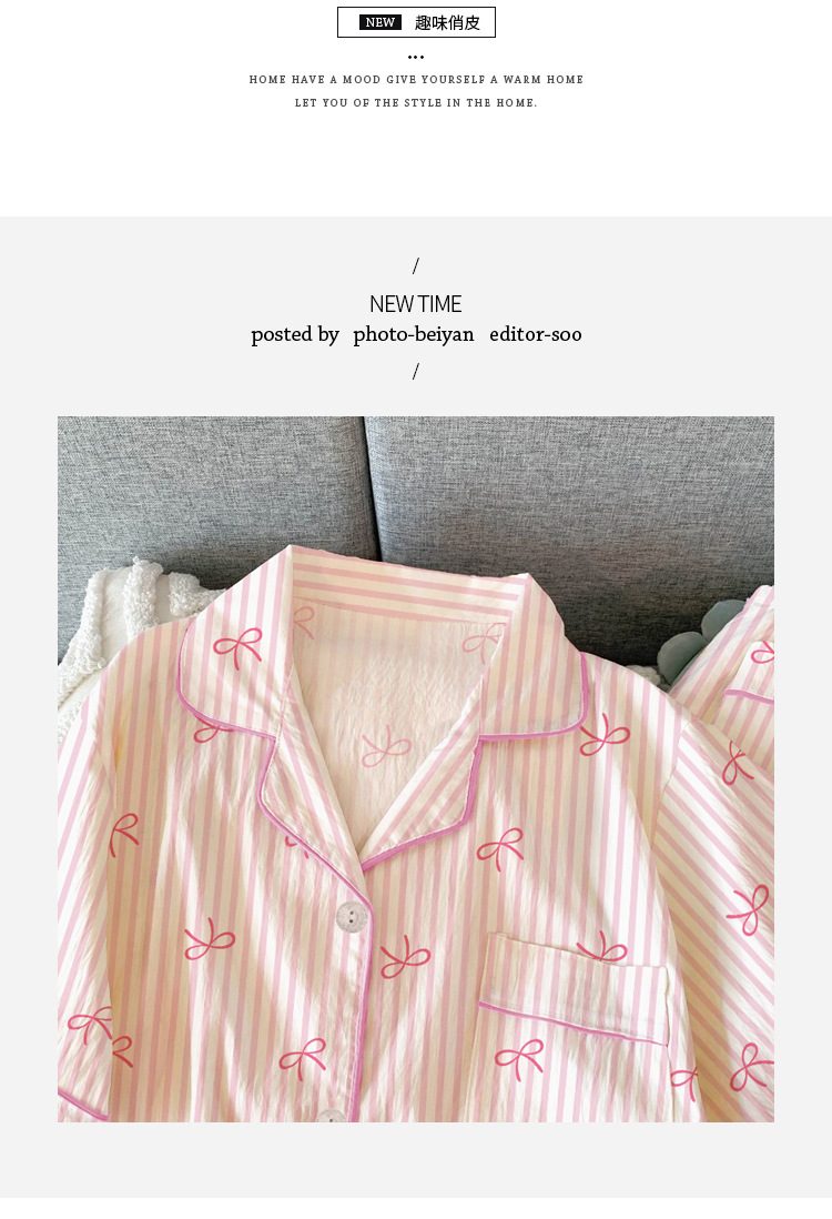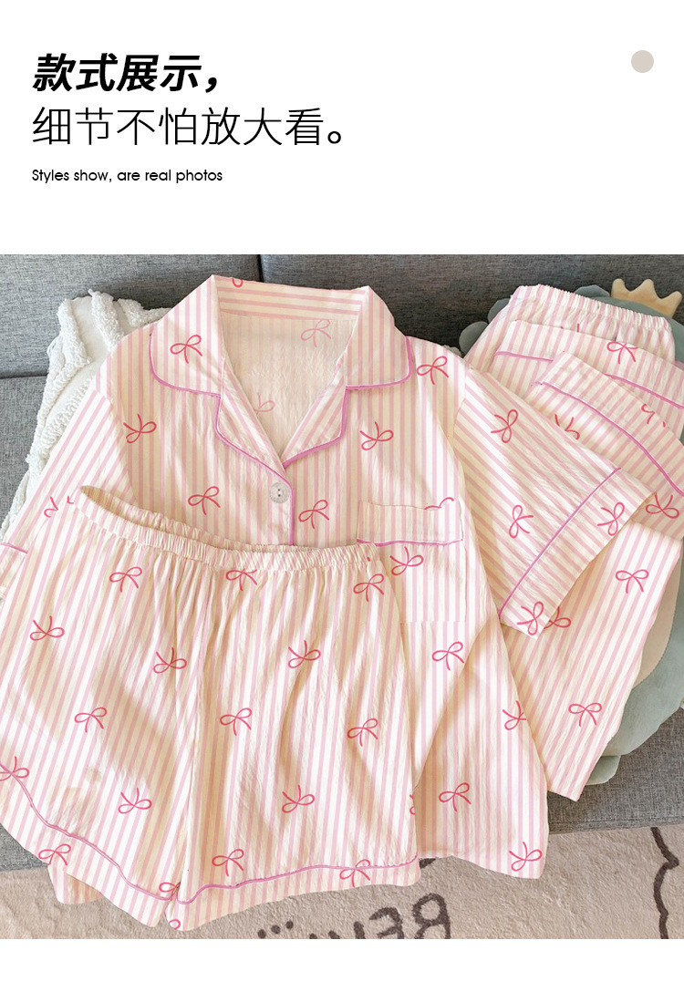 달콤한 스트라이프 인 한국 활 프린트 주름 파자마 여성 홈 의류 반팔 3 피스 세트 리얼 샷 도매