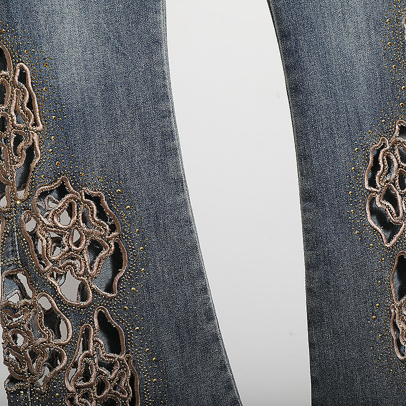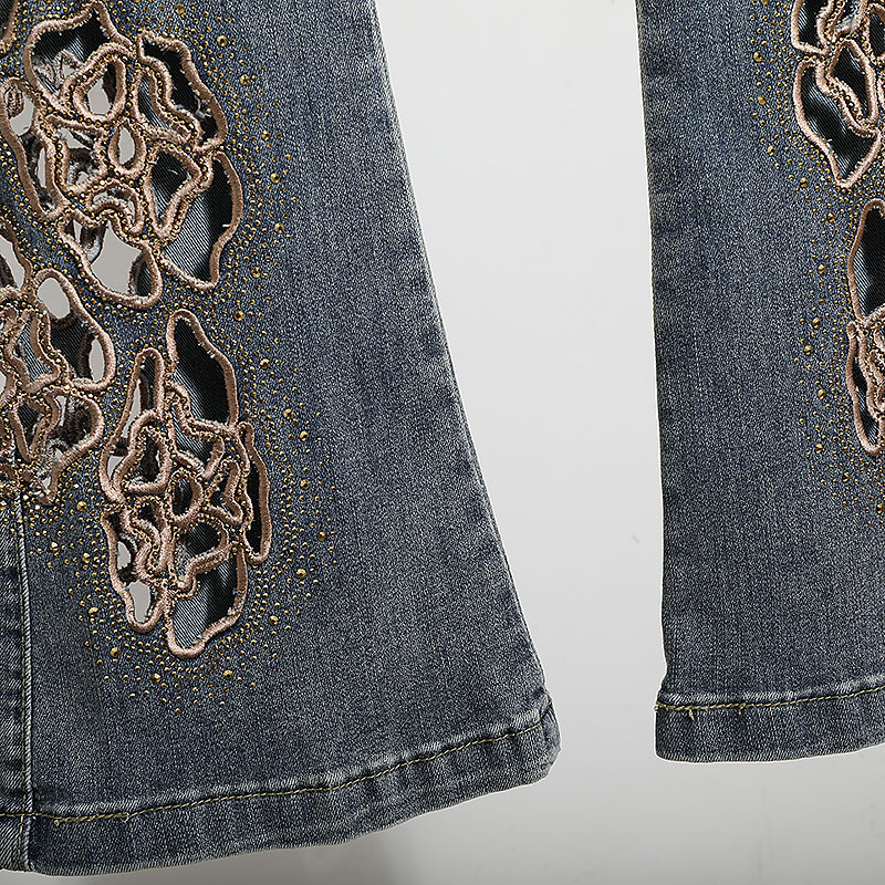 유럽 스테이션 2025 봄 신상 패셔너블 슬림핏 헤비듀티 중공 마이크로 플레어 청바지 여성 트렌디 브랜드스토어 가기