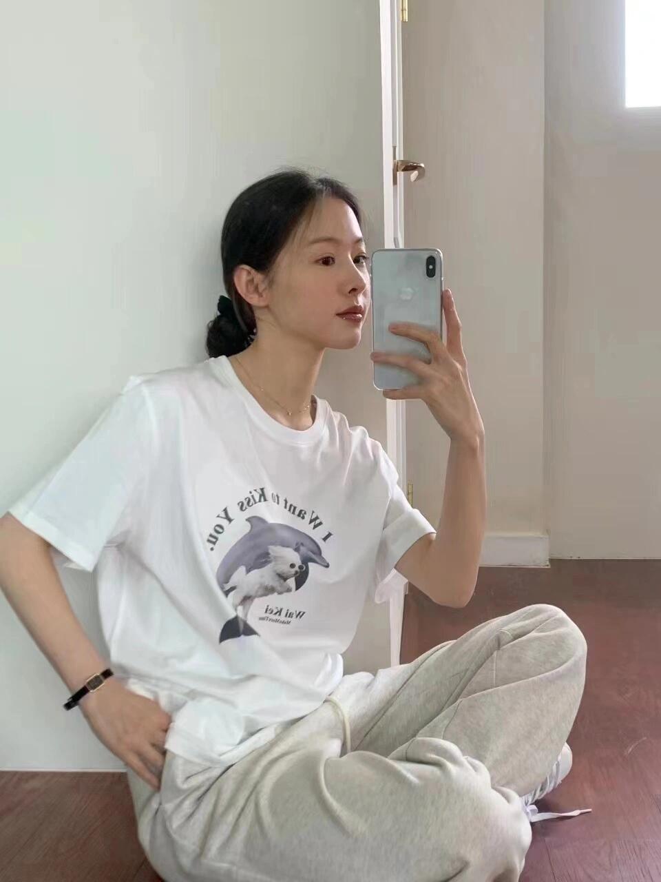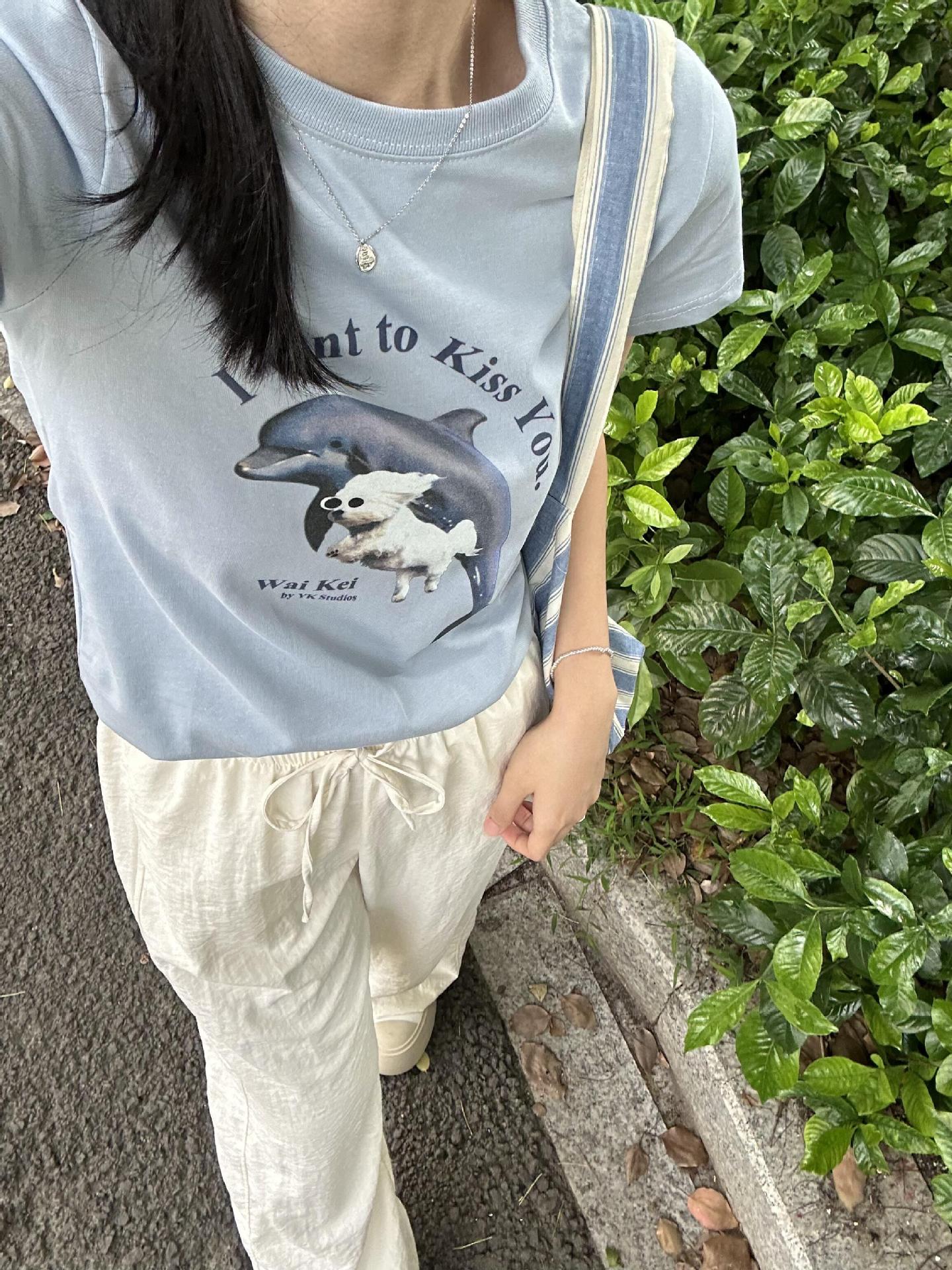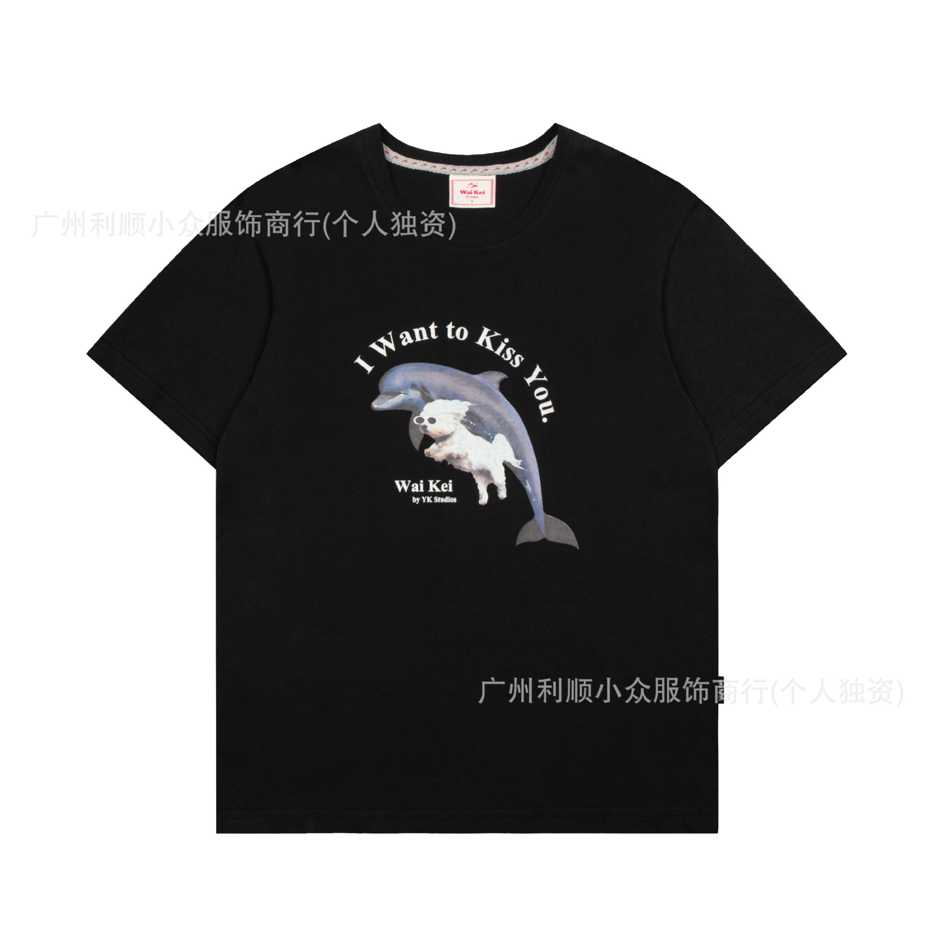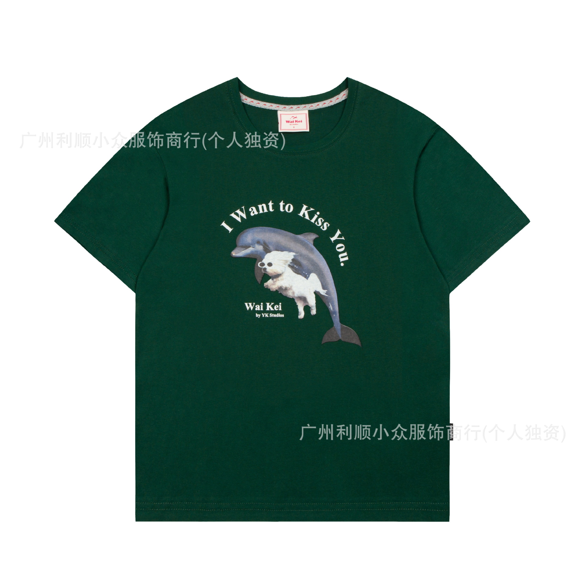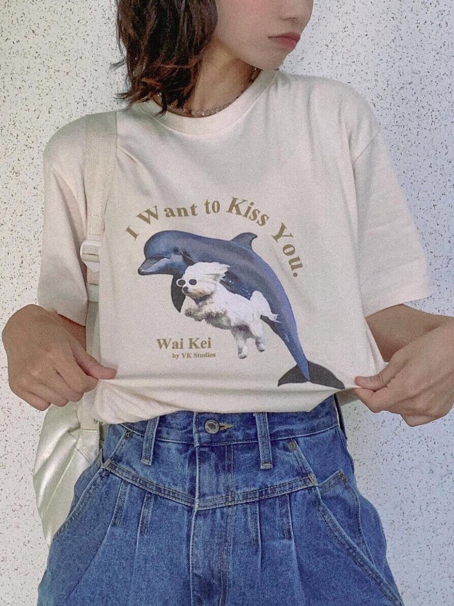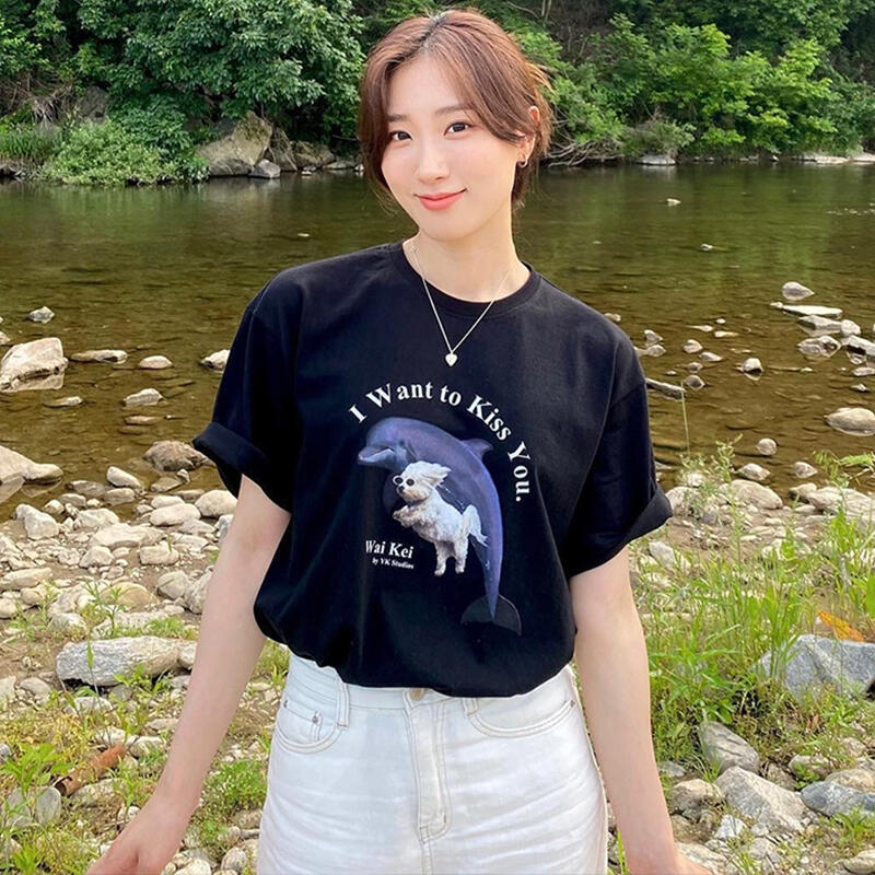 재고 한국 패션 브랜드 와이 케이 돌고래 개 반팔 티셔츠 여성면 느슨한 캐주얼 탑 여름 올매치스토어 가기