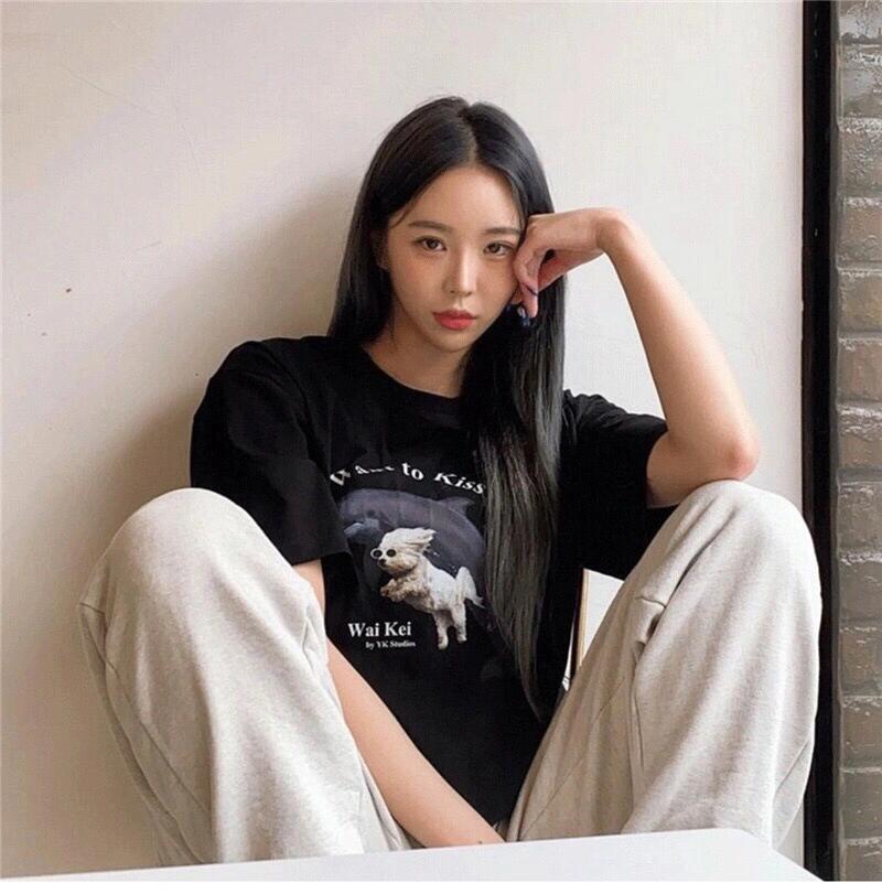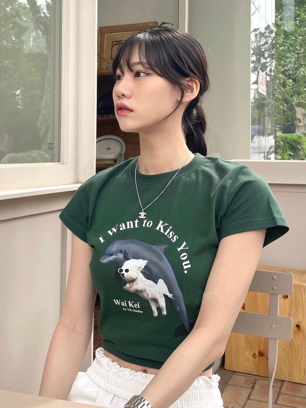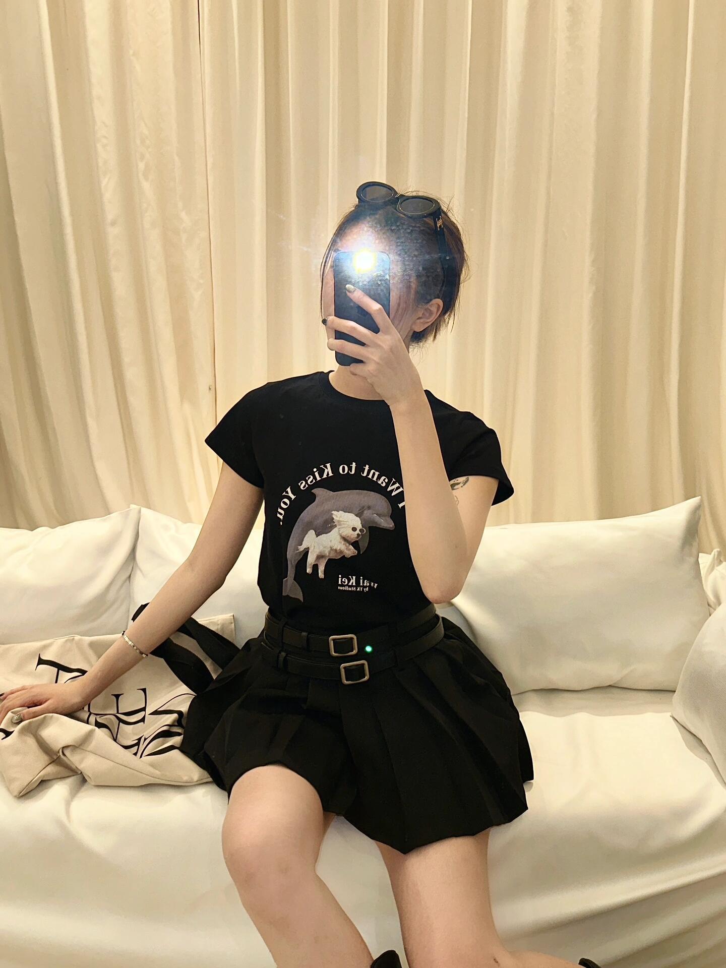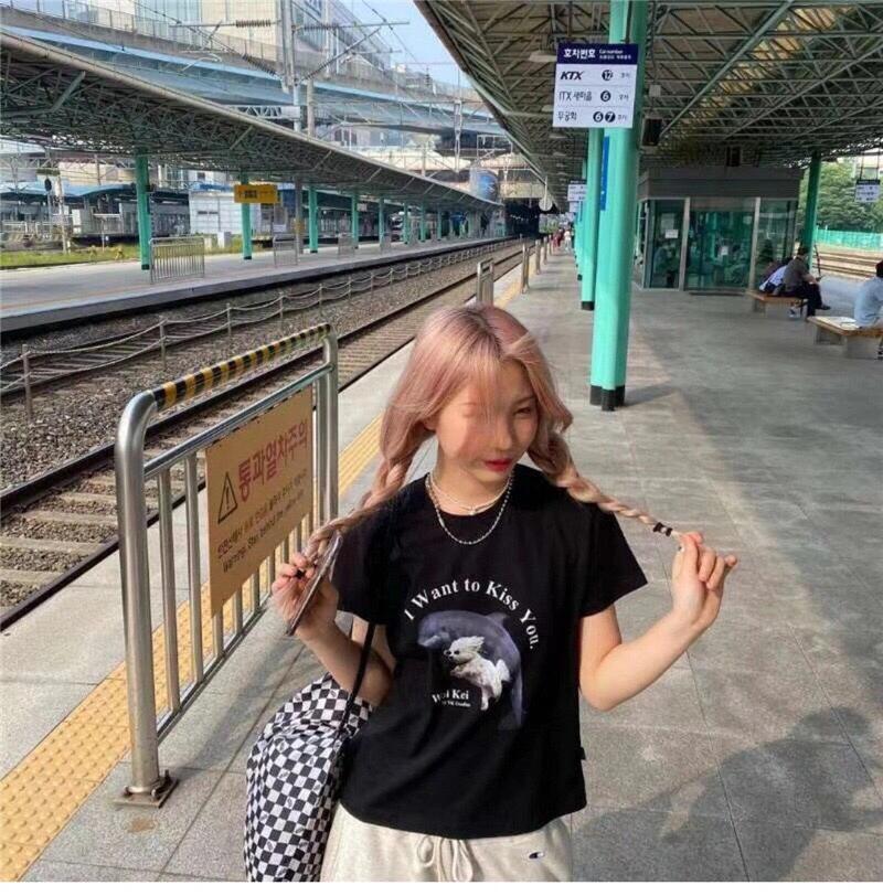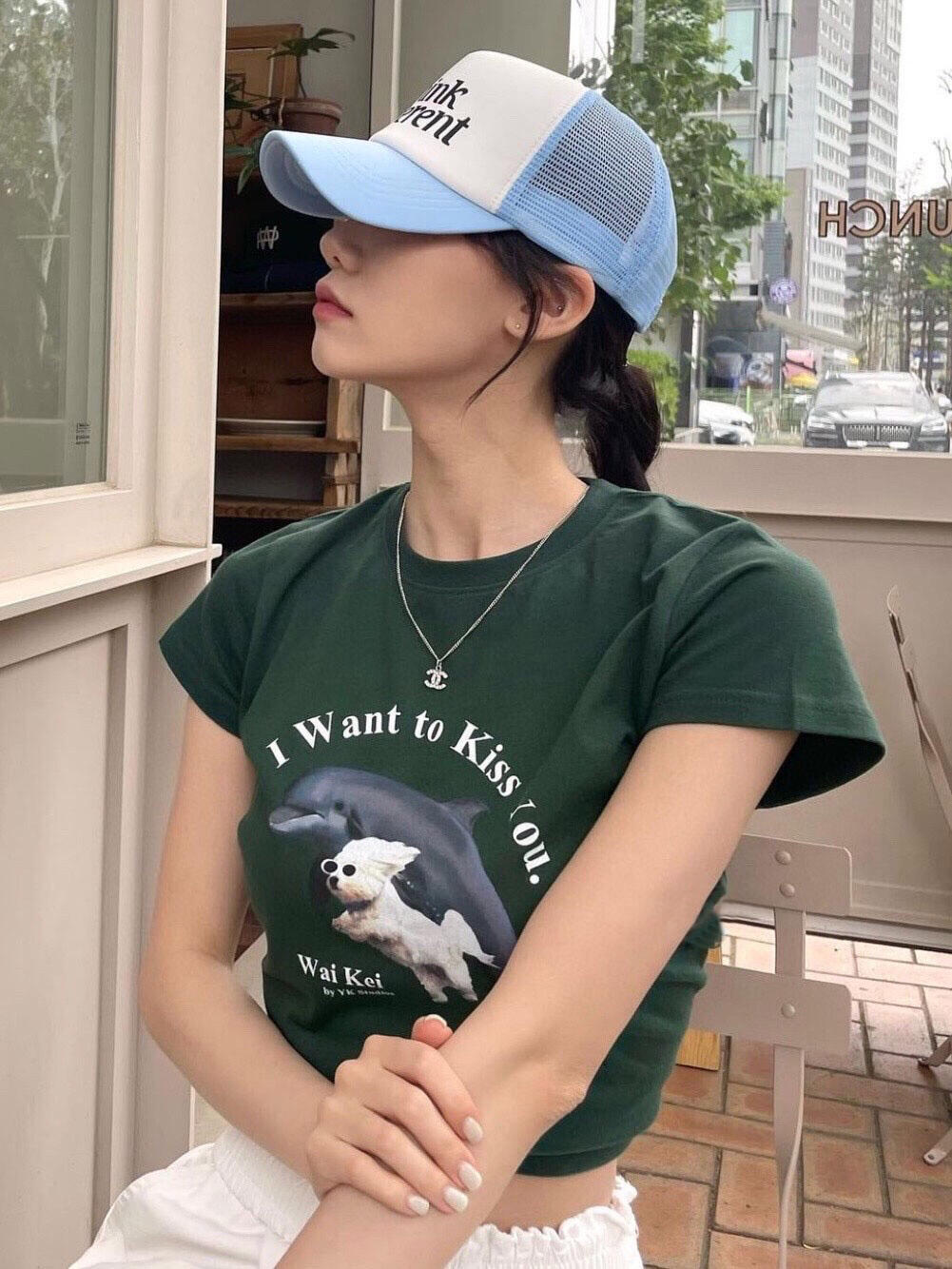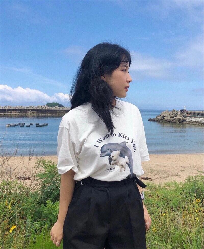 재고 한국 패션 브랜드 와이 케이 돌고래 개 반팔 티셔츠 여성면 느슨한 캐주얼 탑 여름 올매치스토어 가기
