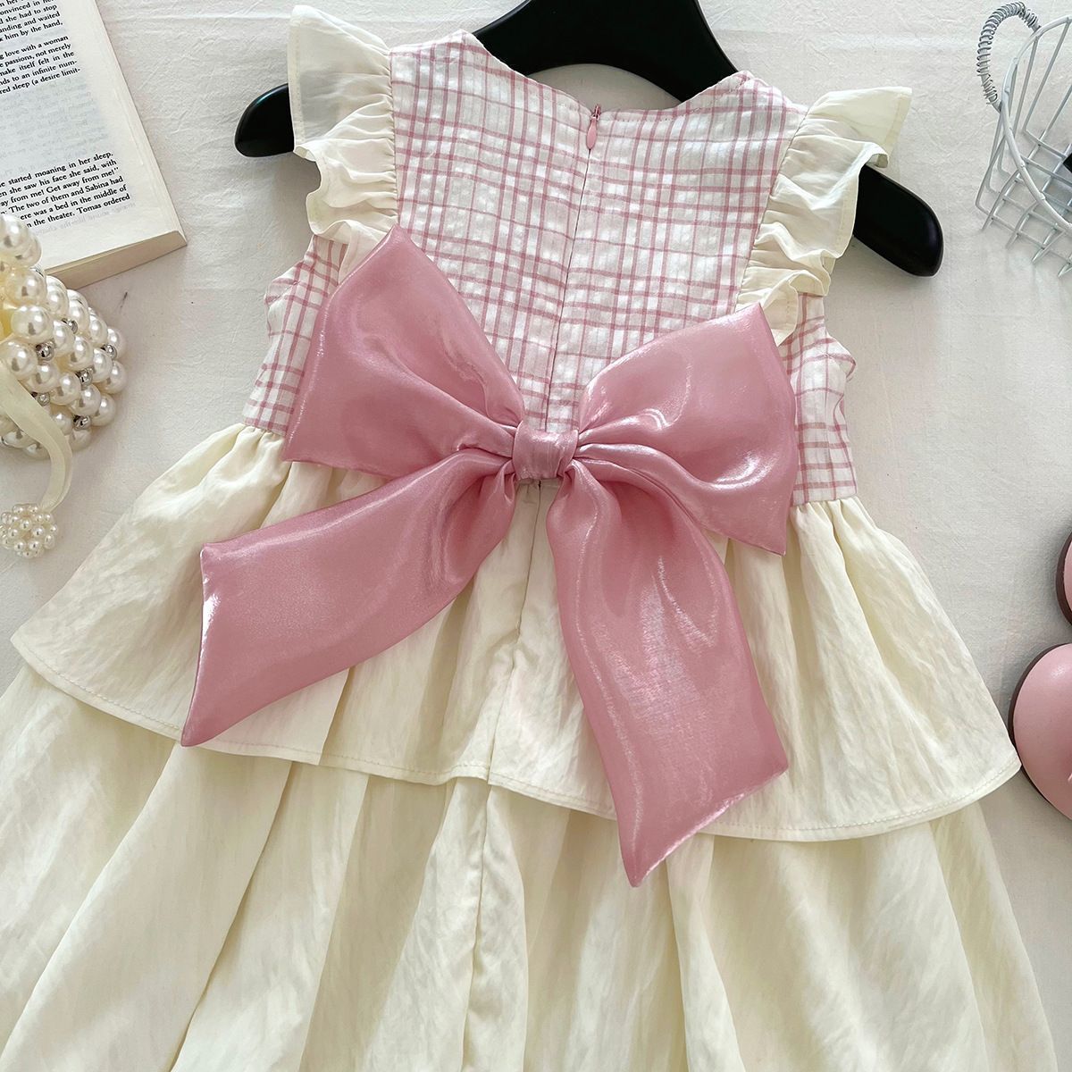 새로운 2025 소녀 여름 격자 무늬 패치 워크 버드 원피스 어린이 달콤한 작은 비행 소매 조끼 공주 원피스스토어 가기