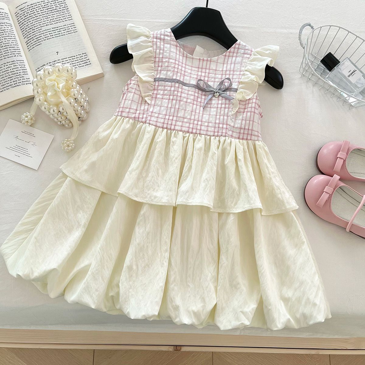새로운 2025 소녀 여름 격자 무늬 패치 워크 버드 원피스 어린이 달콤한 작은 비행 소매 조끼 공주 원피스