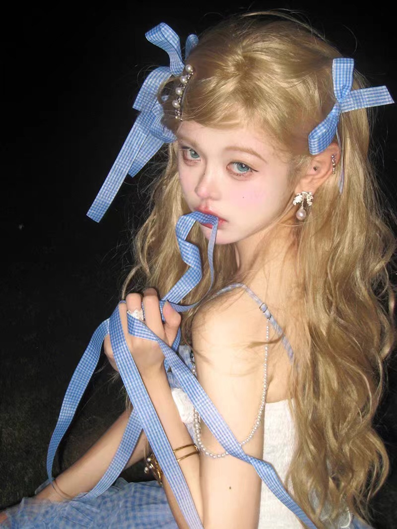 • 77#긴 파란색 체크무늬 리본 머리핀-1개(GB1673)