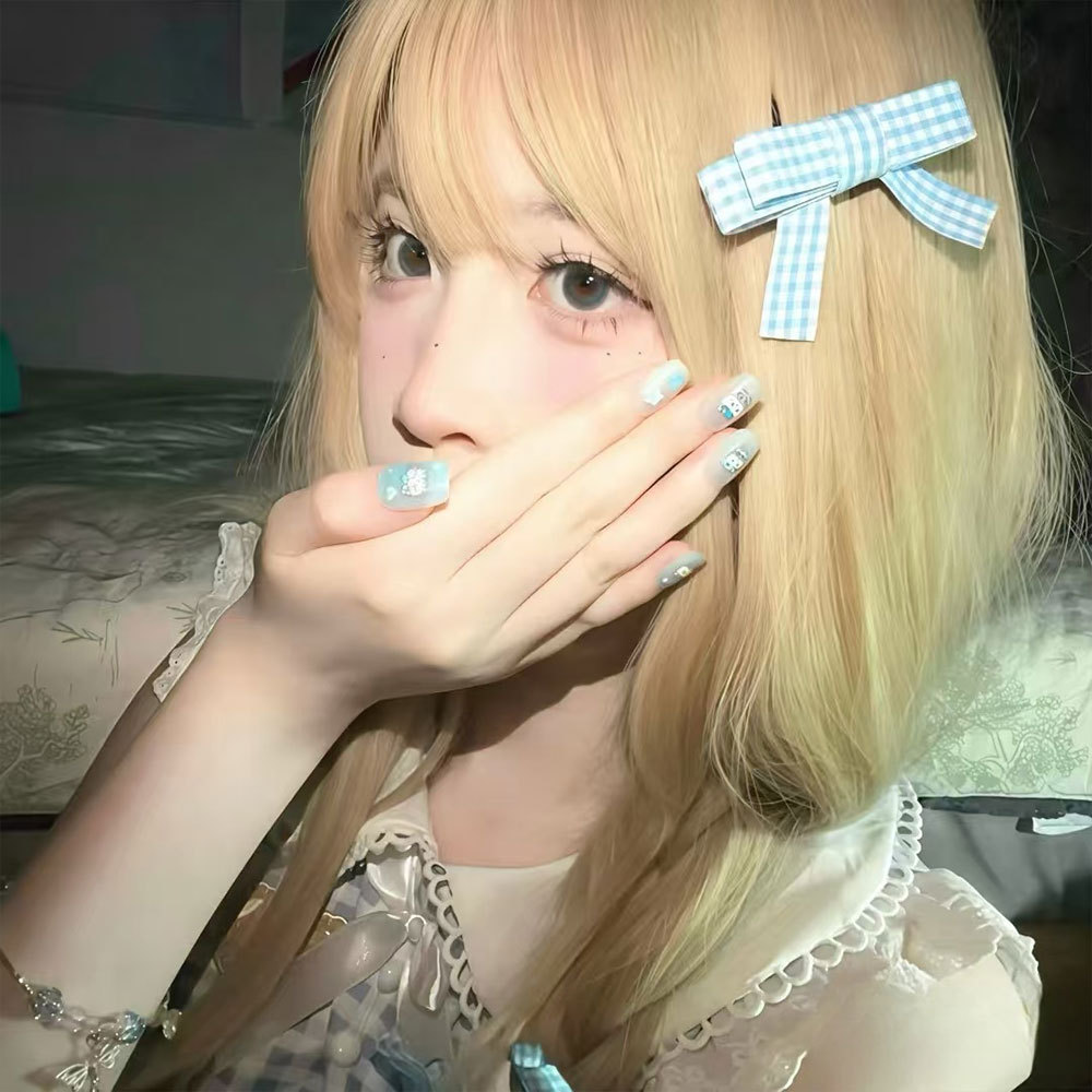 • 76#파란색 체크무늬 짧은 리본 머리핀-1개(GB1670)
