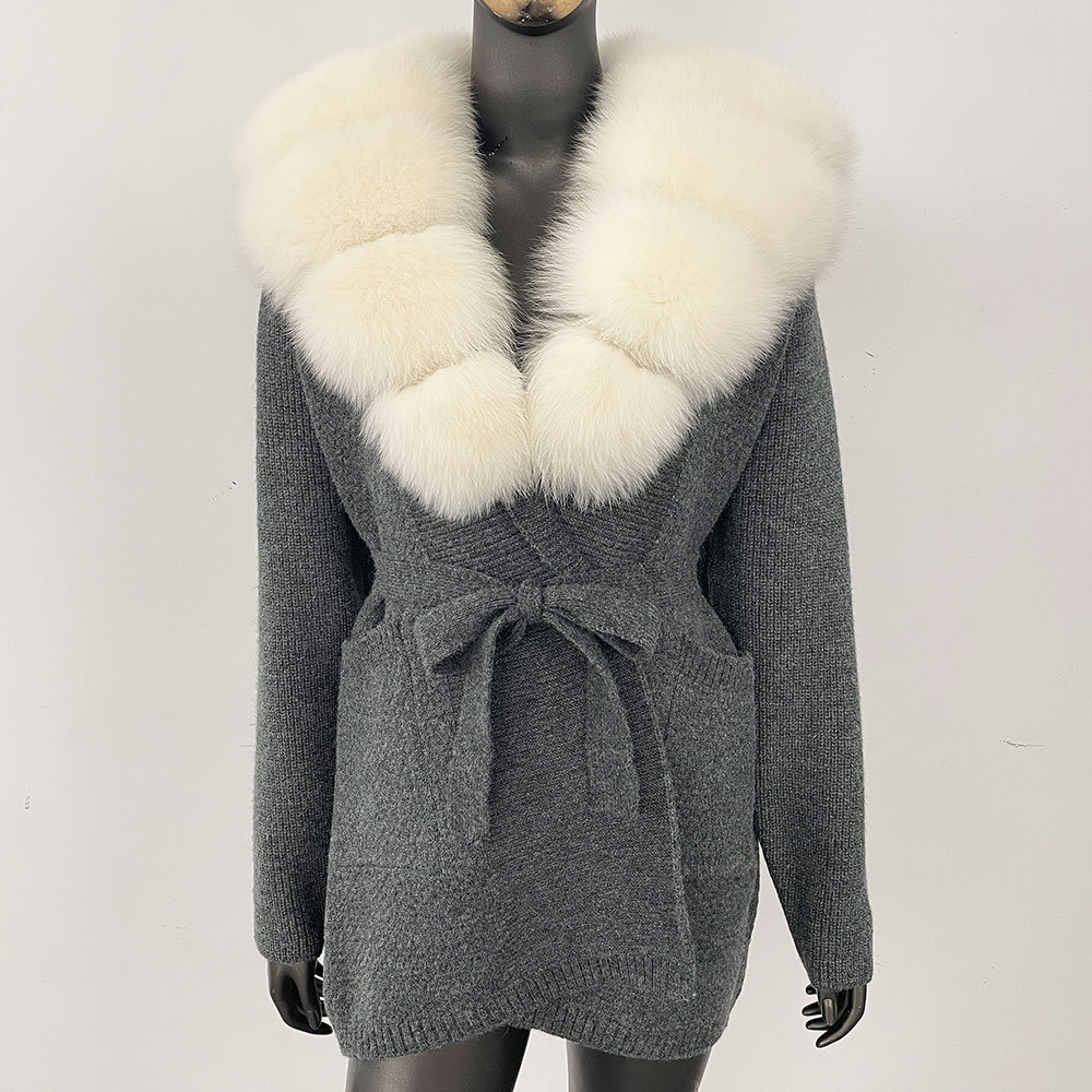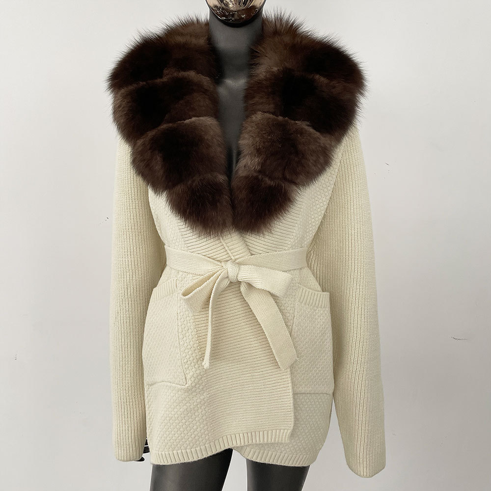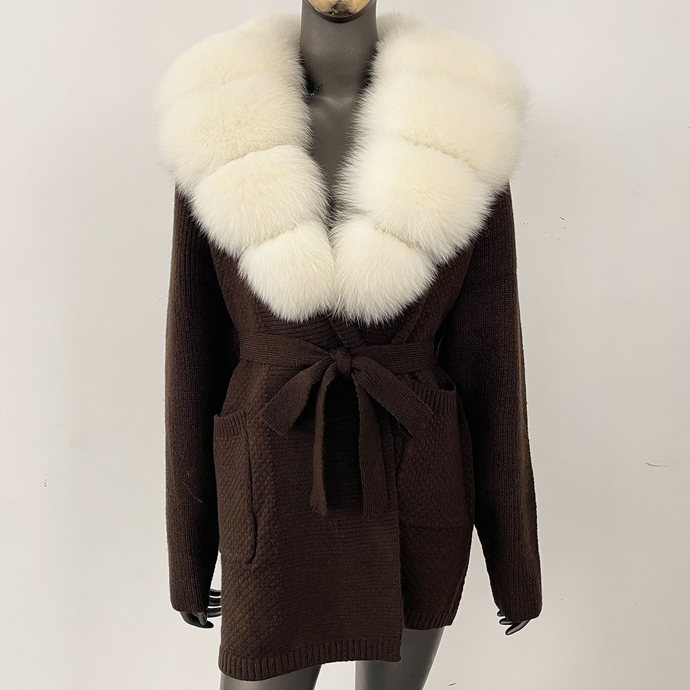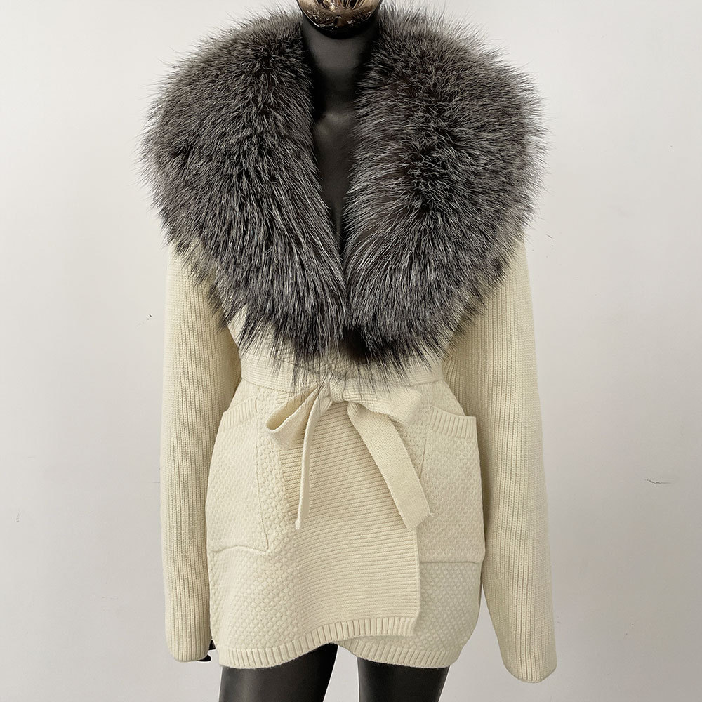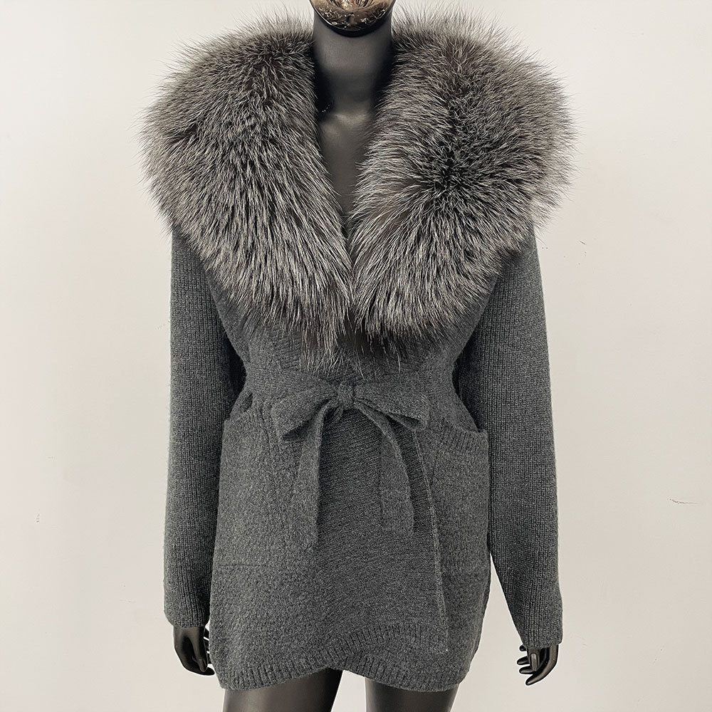 25 봄과 가을 새로운 슈퍼 대형 리얼 폭스 목걸이 니트 카디건 스웨터 여성용 세련된 슬리밍 미드 길이 니트 재킷