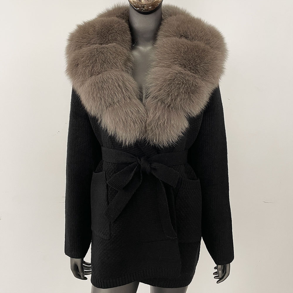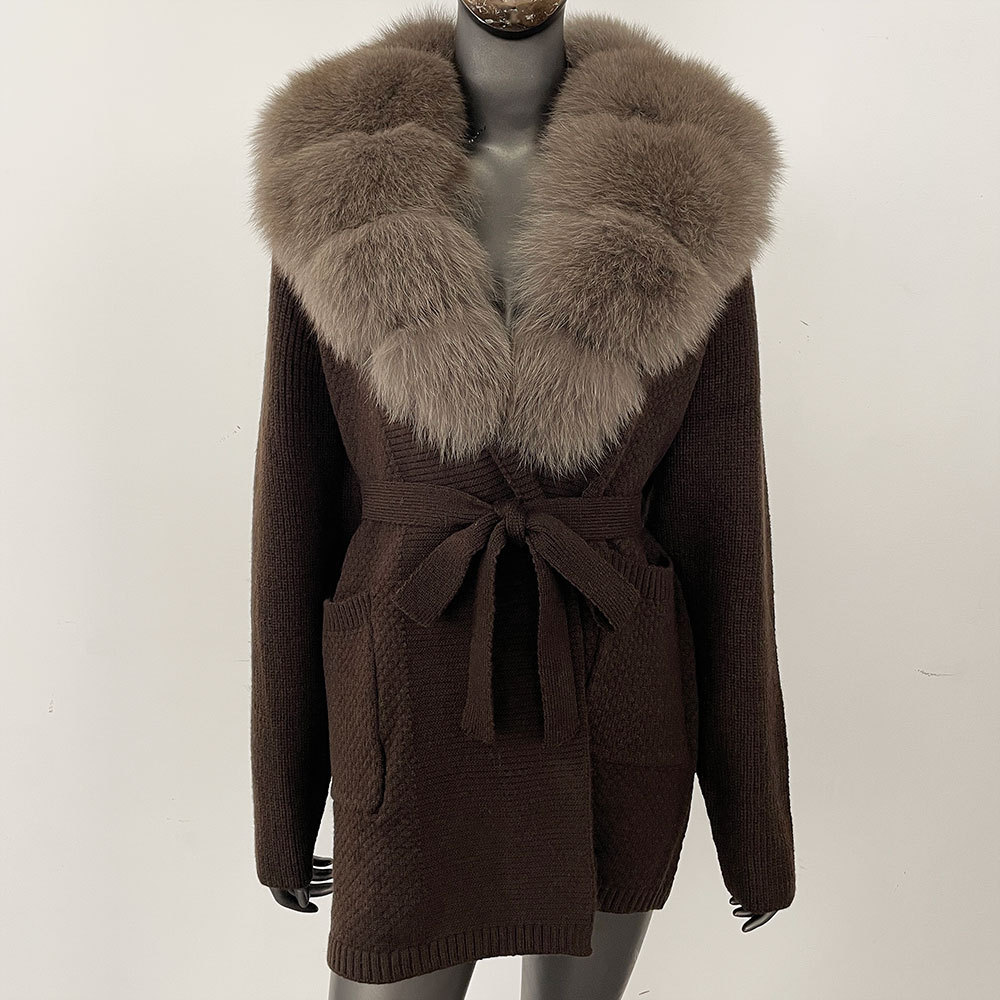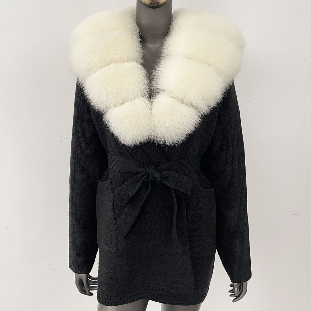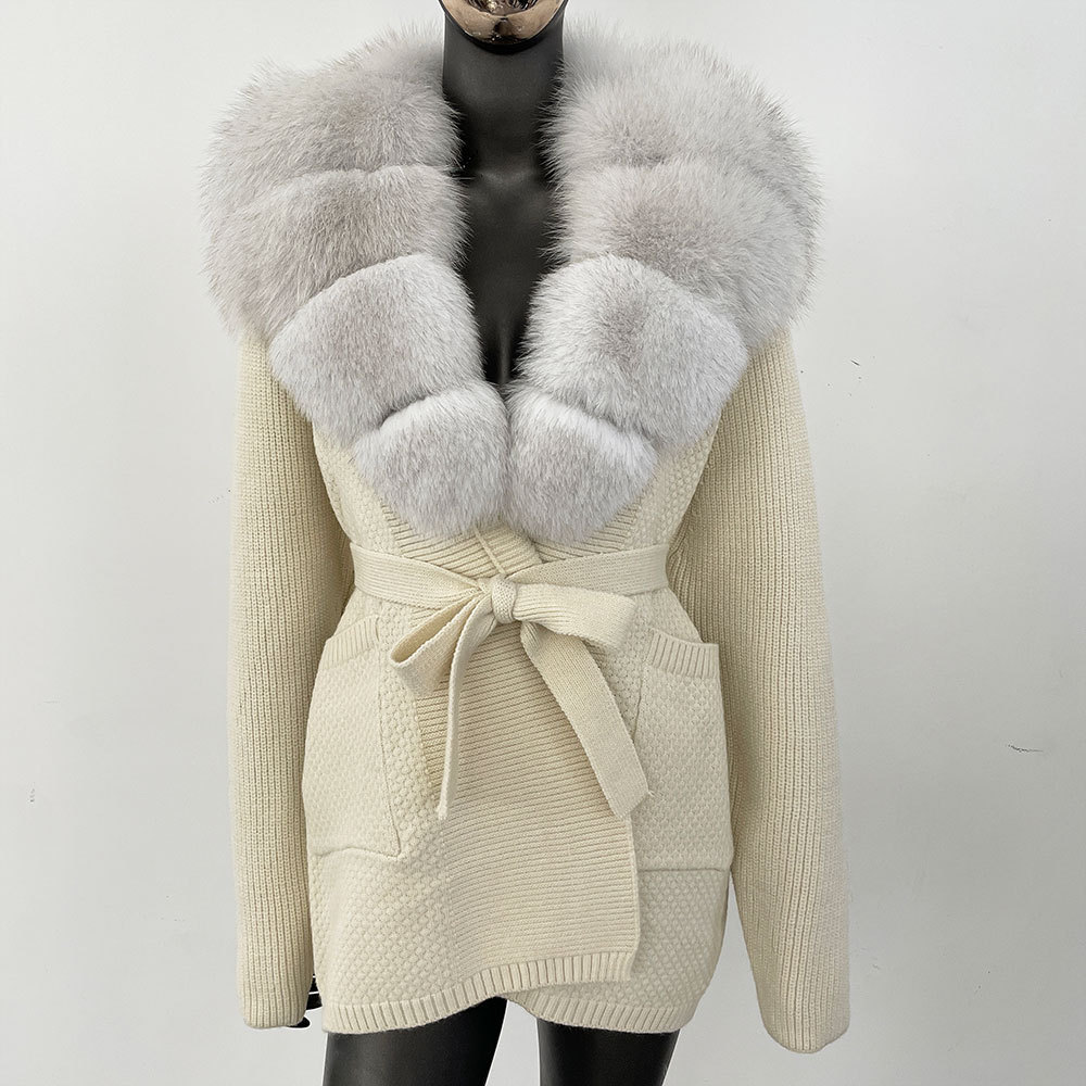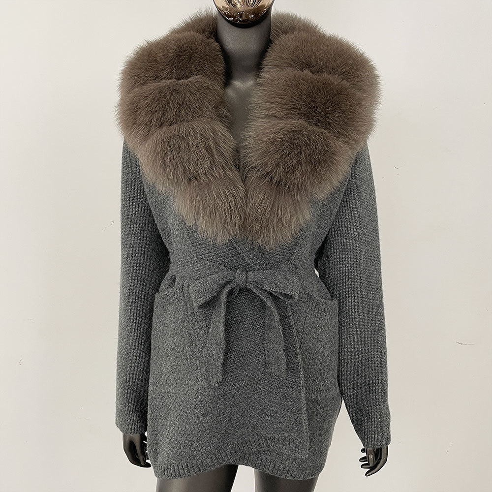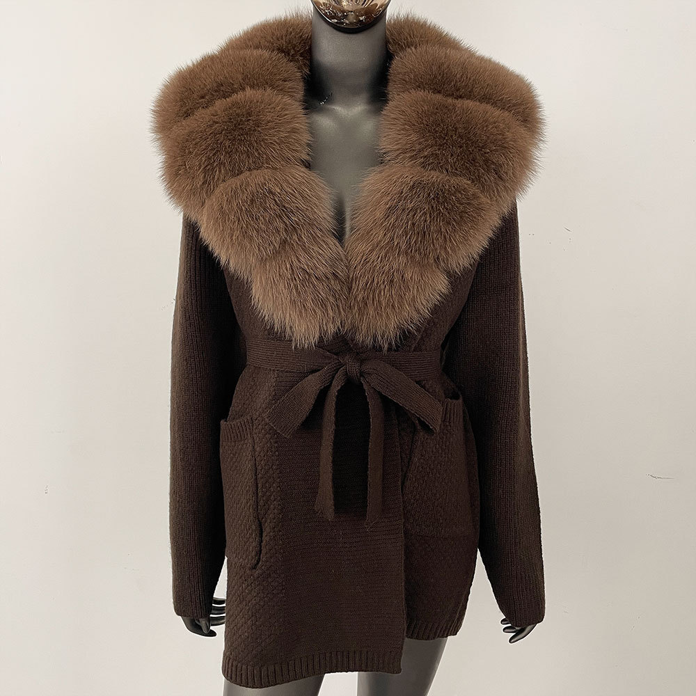 25 봄과 가을 새로운 슈퍼 대형 리얼 폭스 목걸이 니트 카디건 스웨터 여성용 세련된 슬리밍 미드 길이 니트 재킷