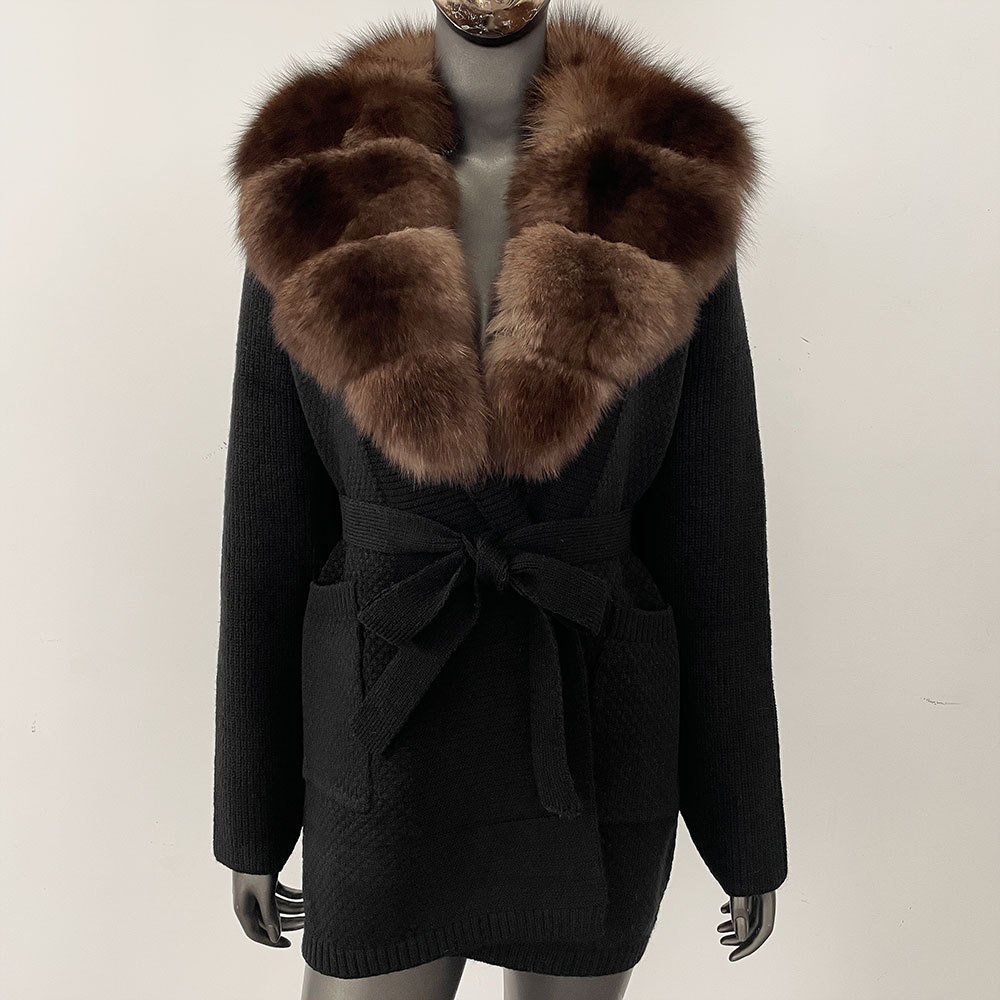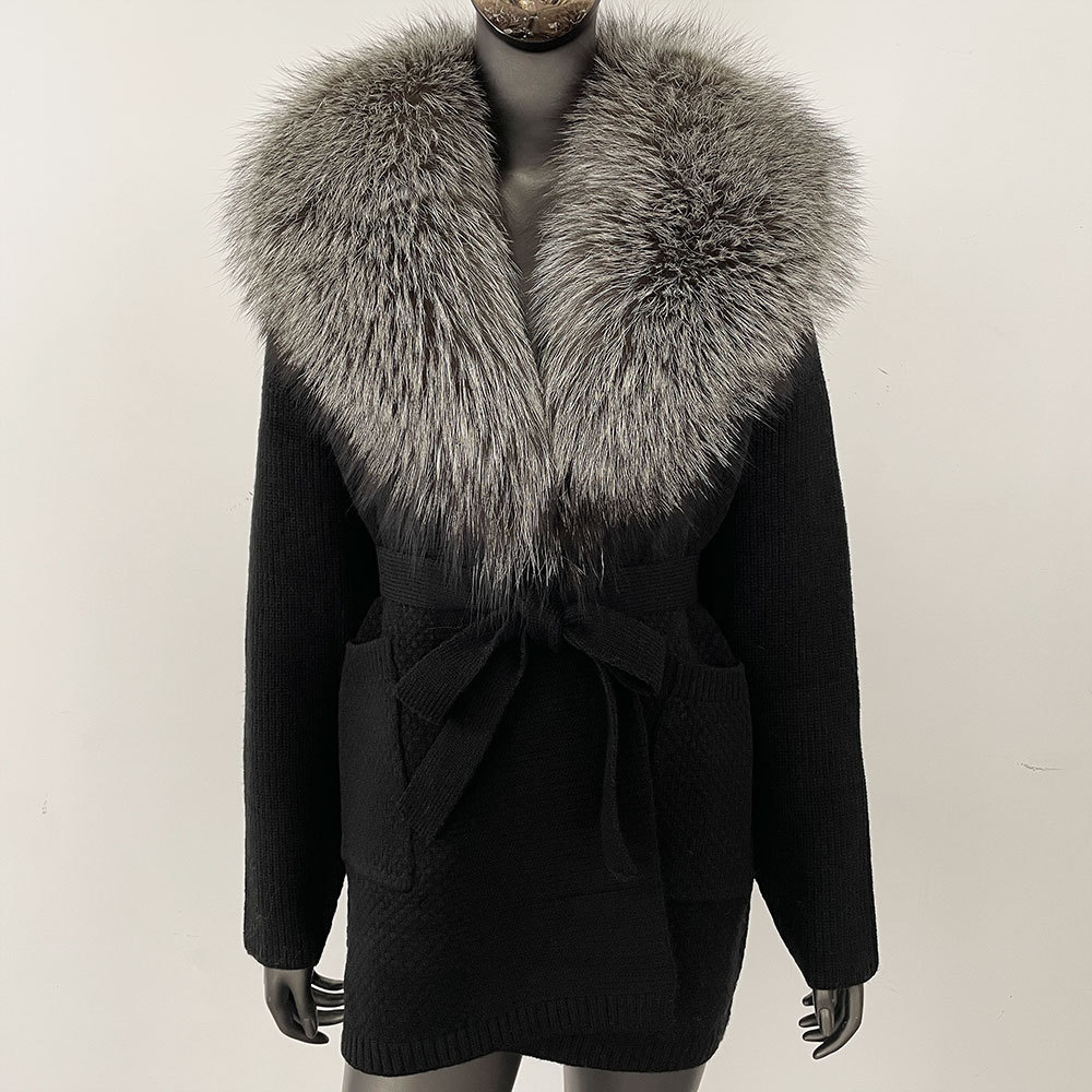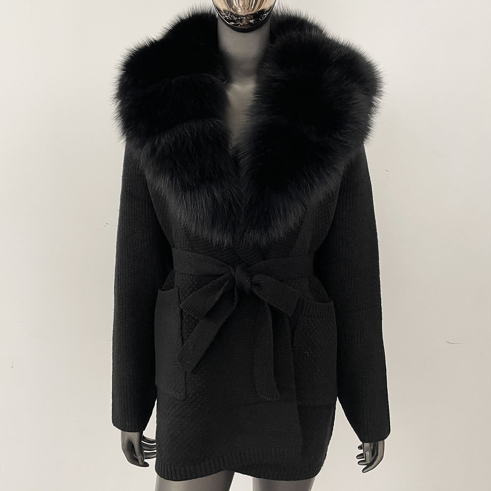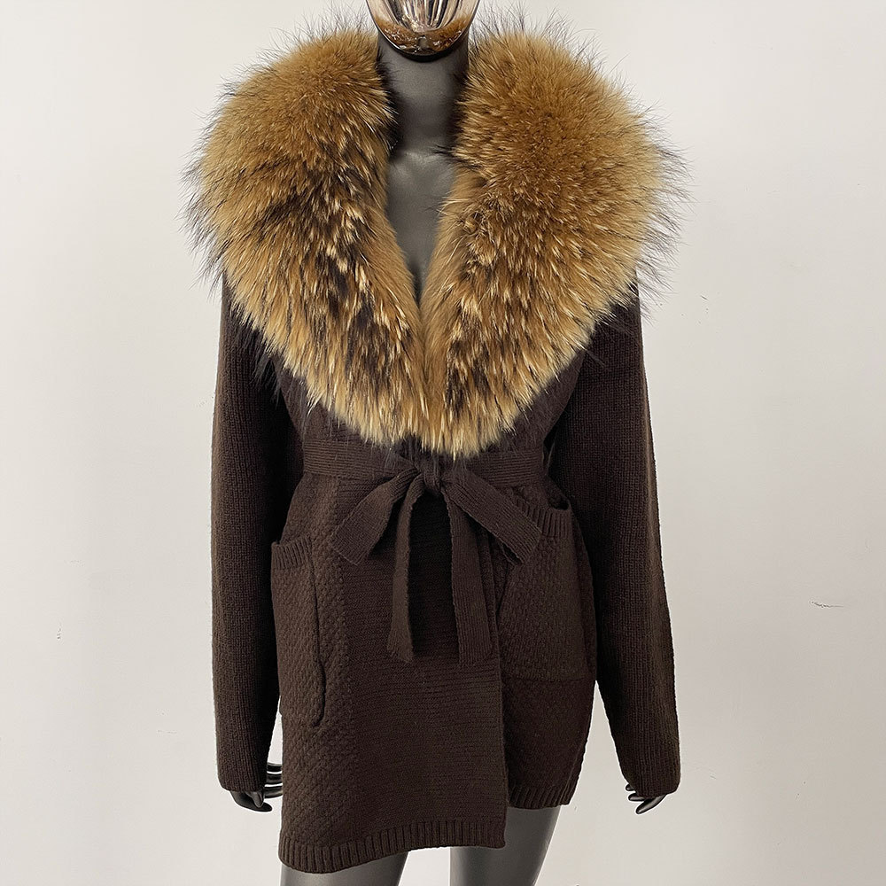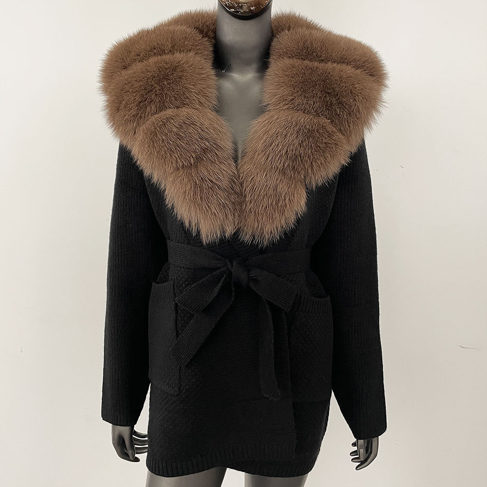 25 봄과 가을 새로운 슈퍼 대형 리얼 폭스 목걸이 니트 카디건 스웨터 여성용 세련된 슬리밍 미드 길이 니트 재킷
