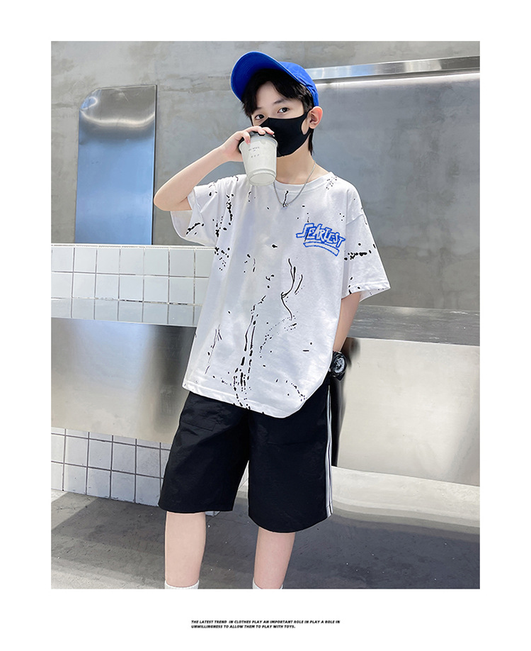남아 여름 얇은 양복 반팔 티셔츠 5부 바지 투피스 세트 2025 새로운 중대형 아동복 트렌드