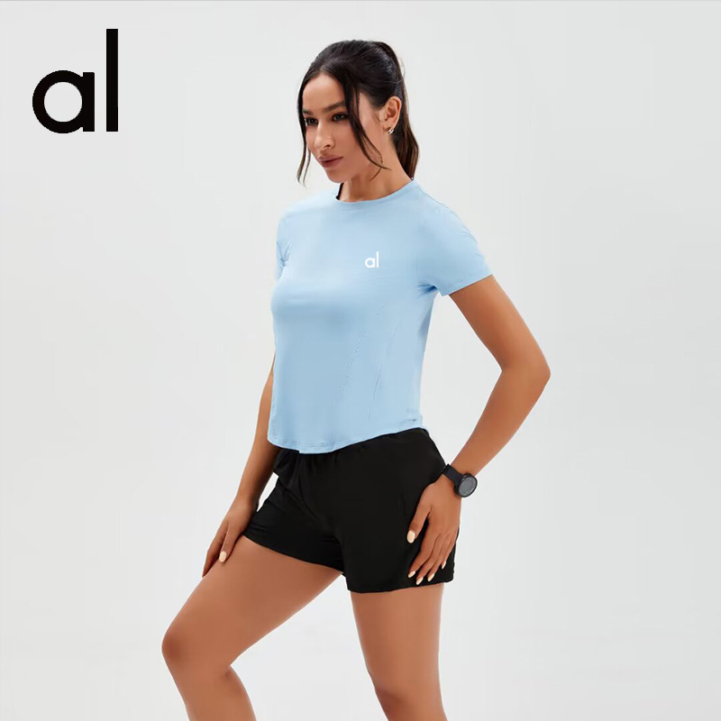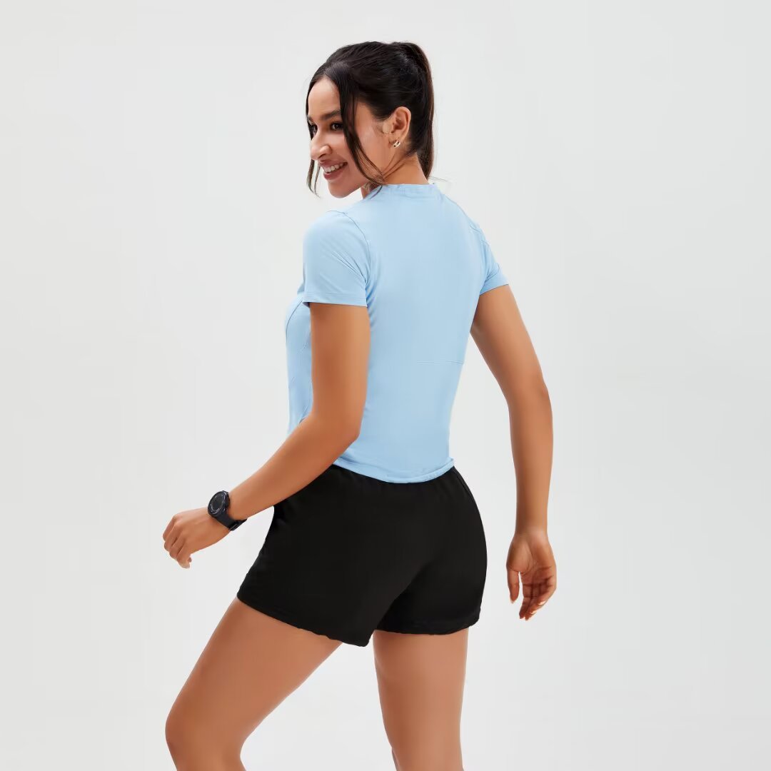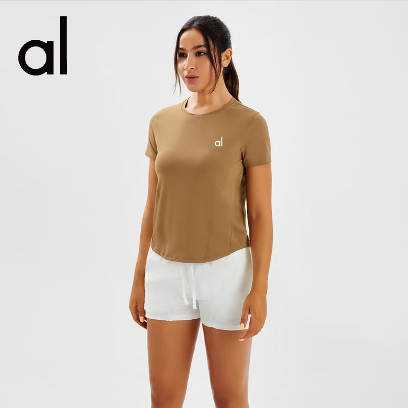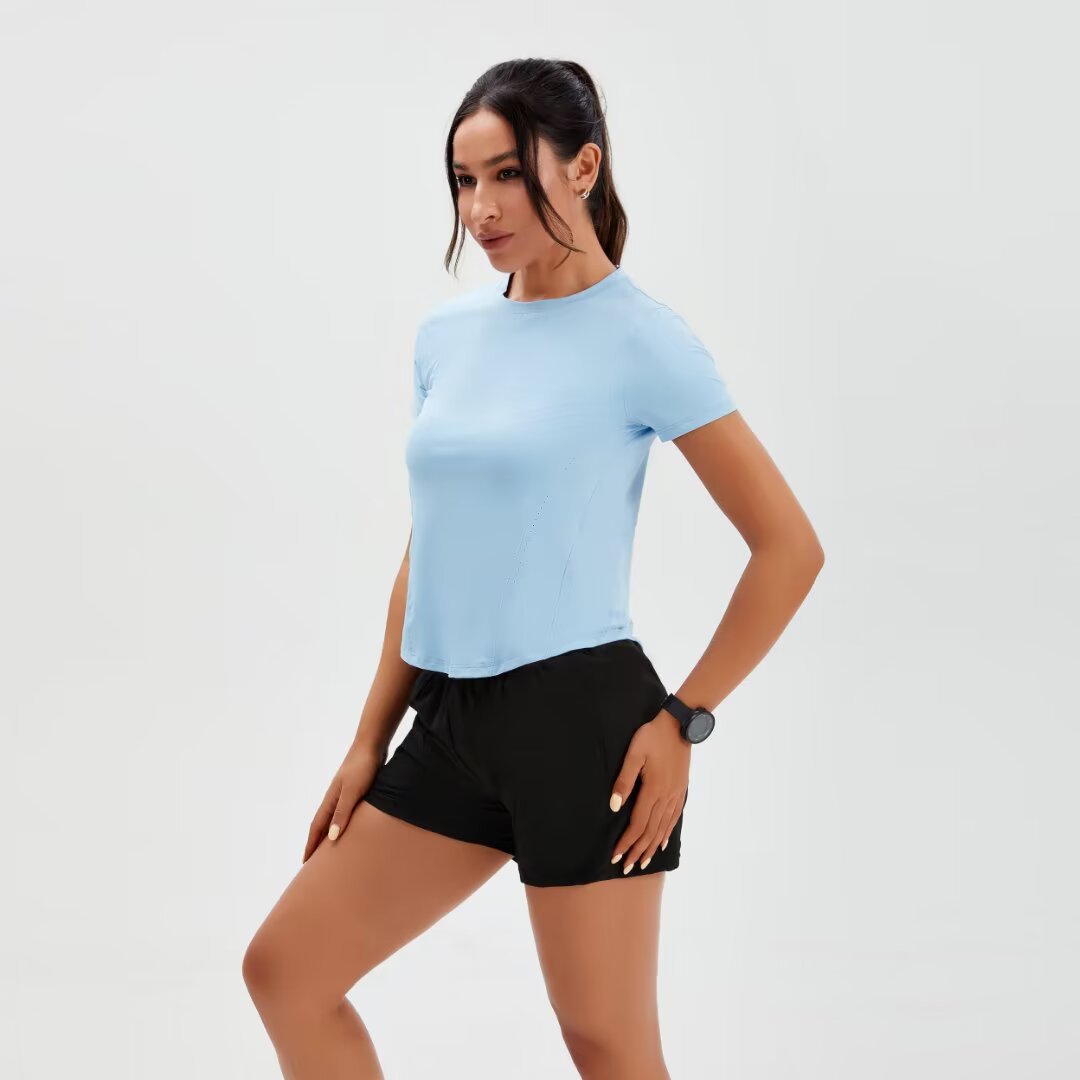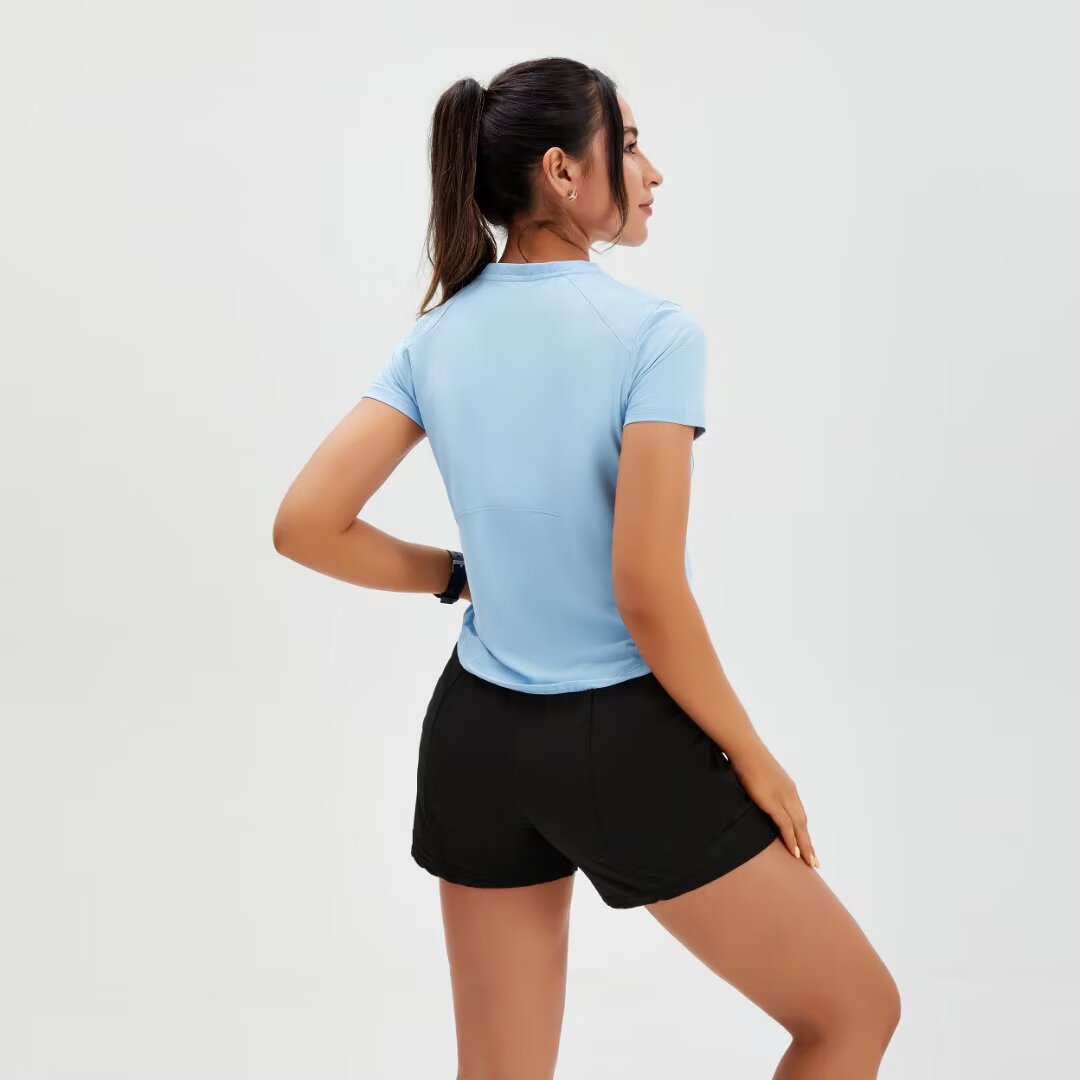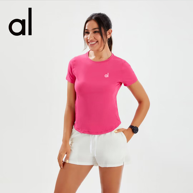 브랜드 단색 반팔 여성용 라운드넥 속건 런닝 피트니스 티셔츠 타이트핏 허리 슬리밍 스포츠 요가 여름 여성 상의스토어 가기